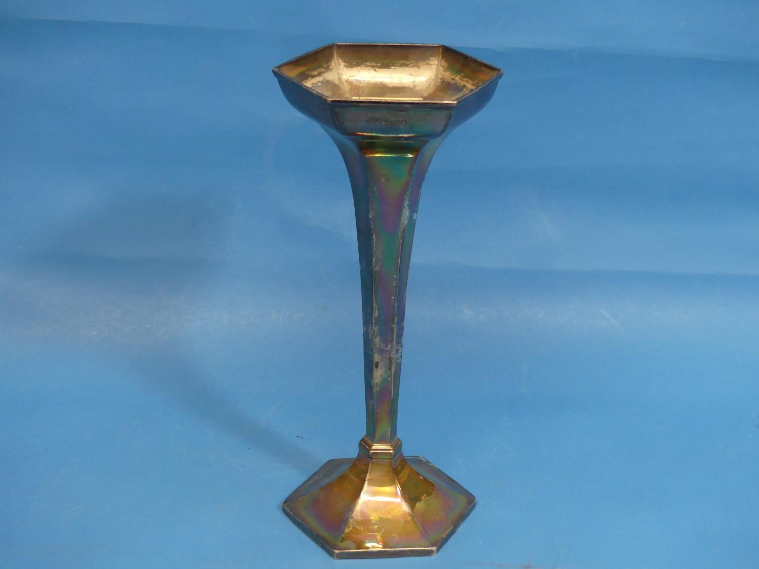 A George V silver Vase, by Walker & Hall, hallmarked Sheffield 1920, of flared hexagonal form with hexagonal foot, 11¾in (30cm) high approx weight 12.5ozt.