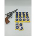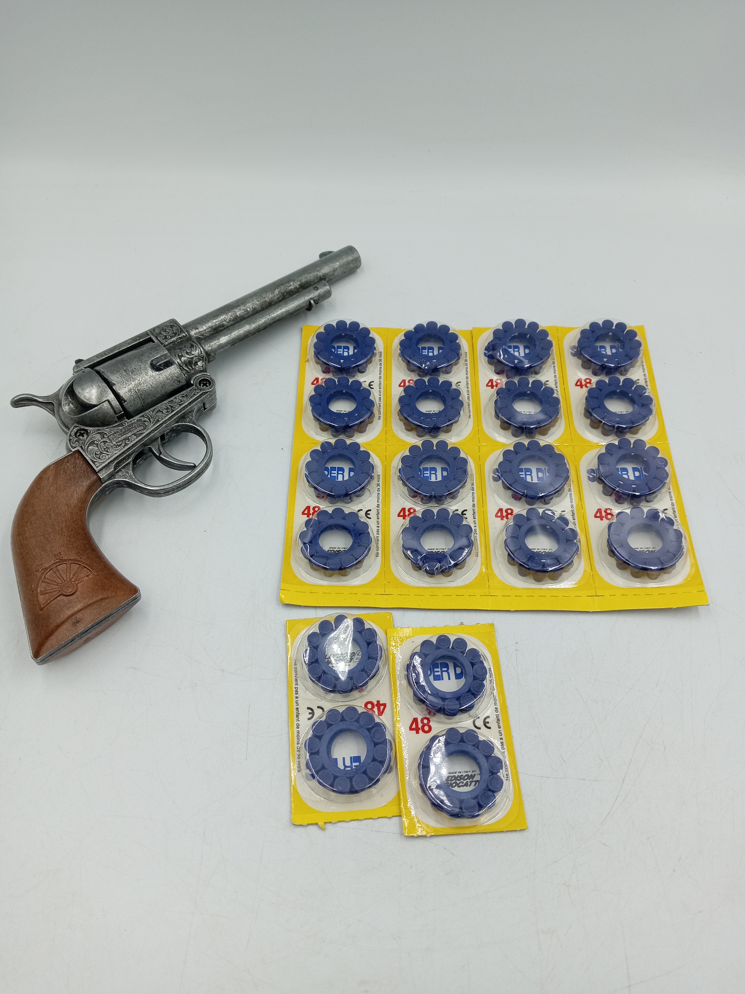 A vintage revolver cap gun made by edison giocatolli Italy. Includes several caps. Working.