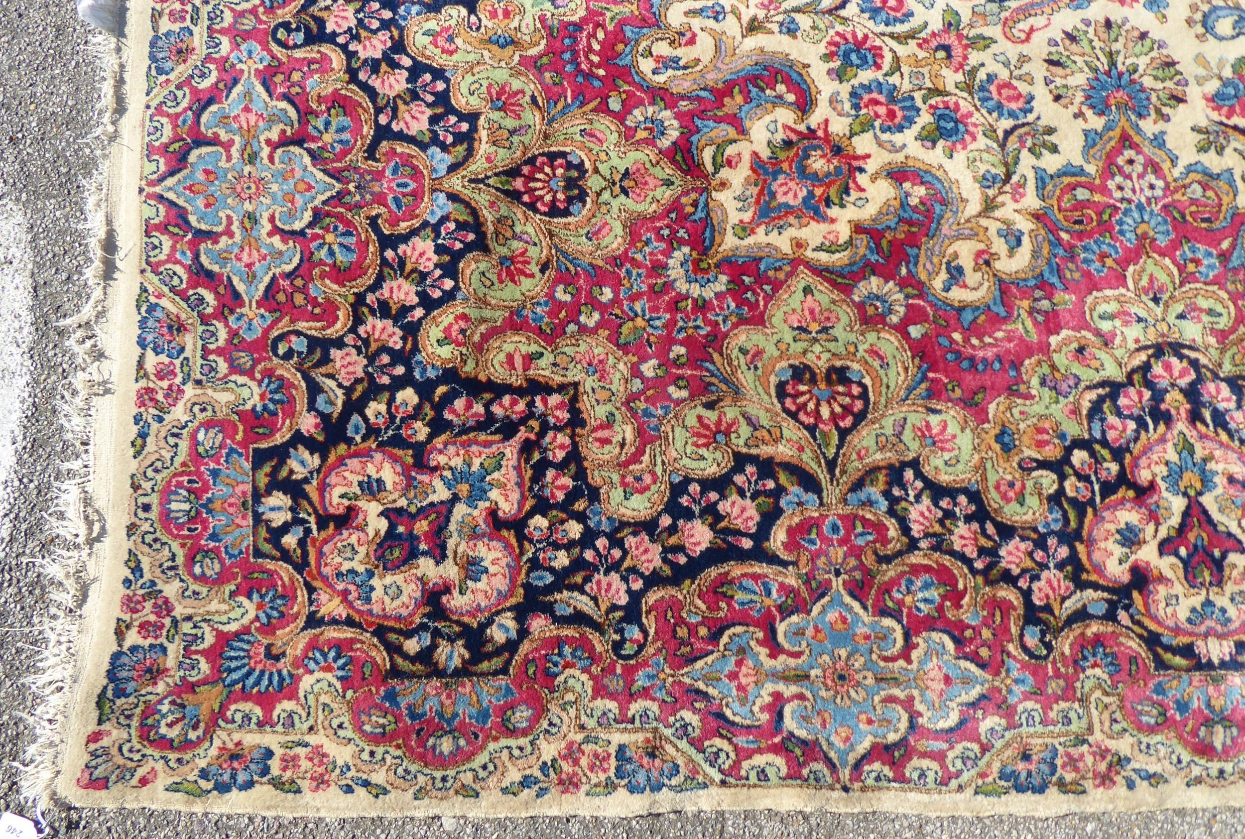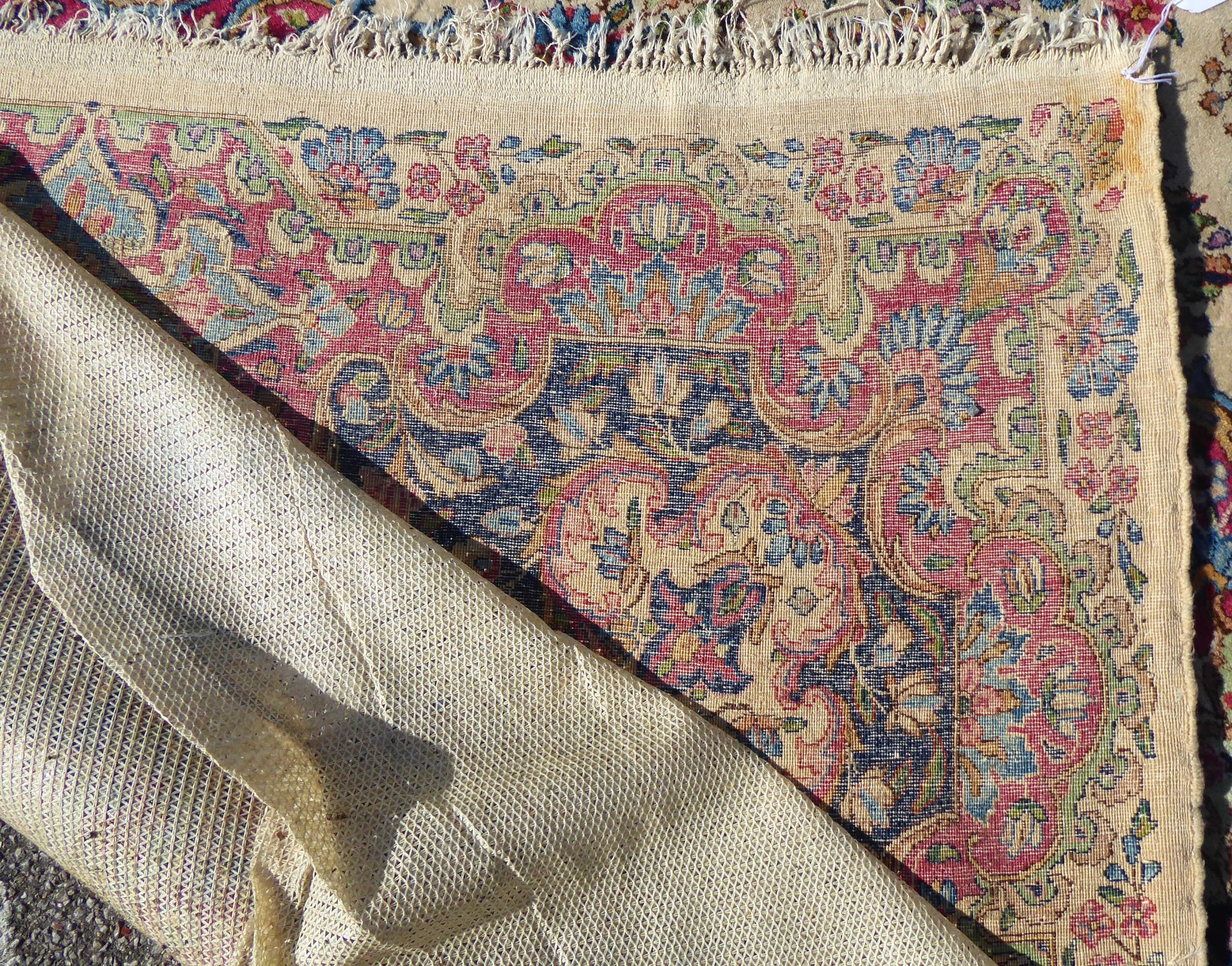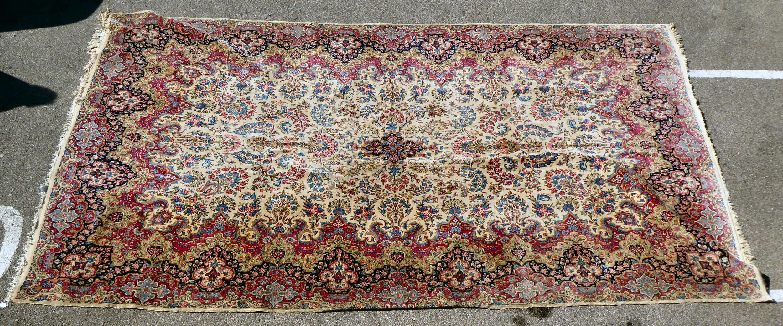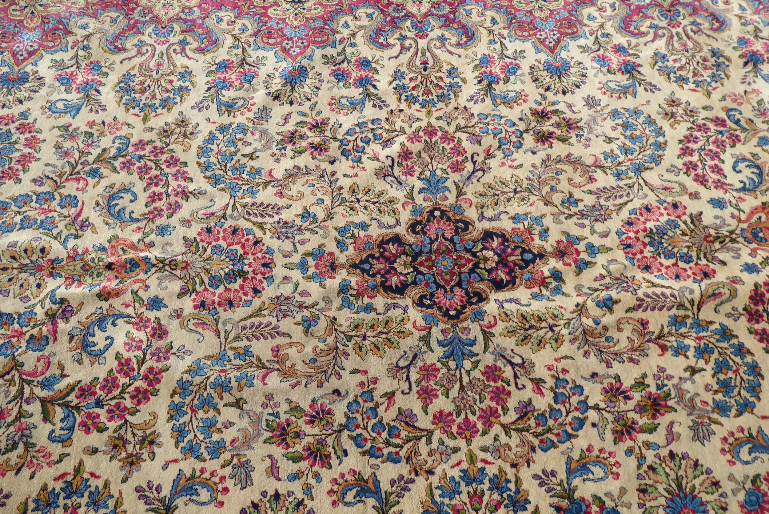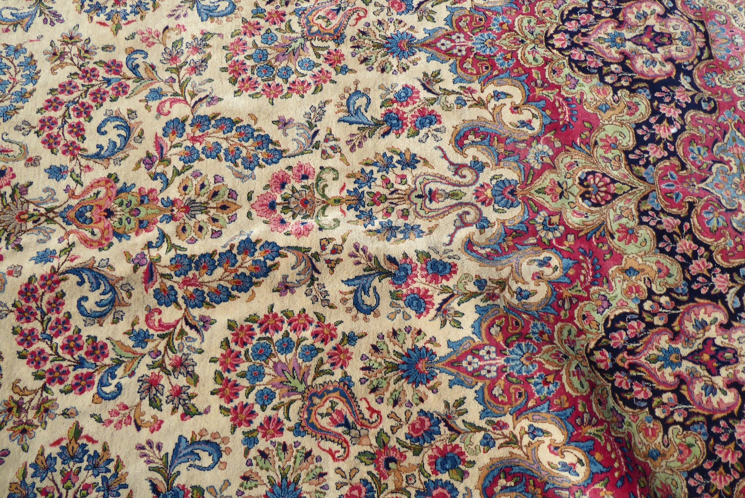 A Persian design rug with dense floral motifs on a beige ground 124" x 204"