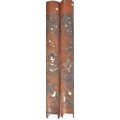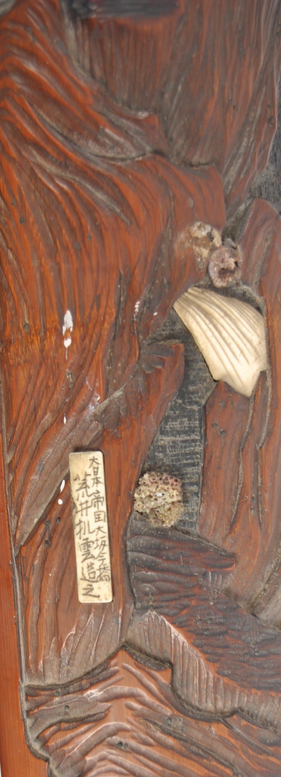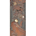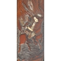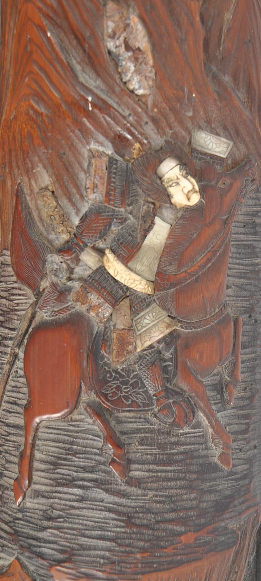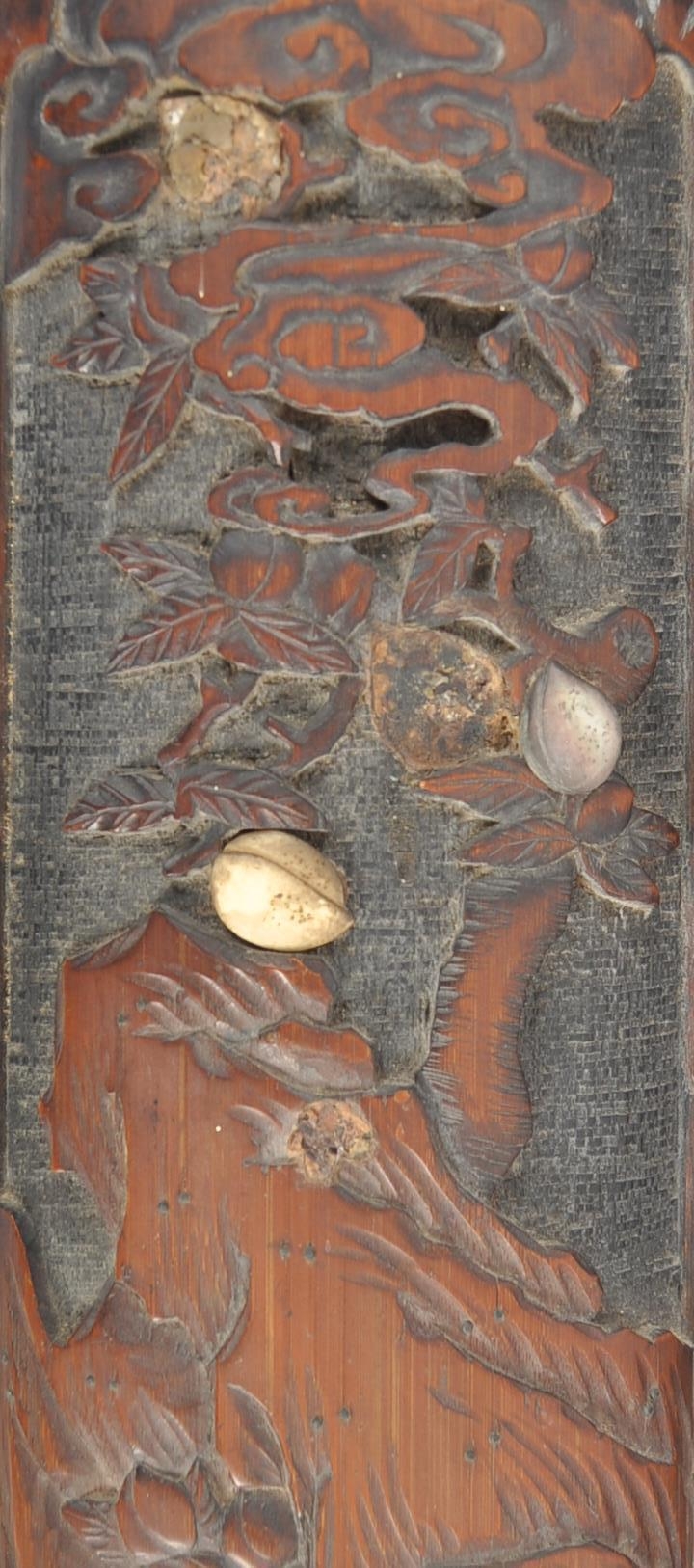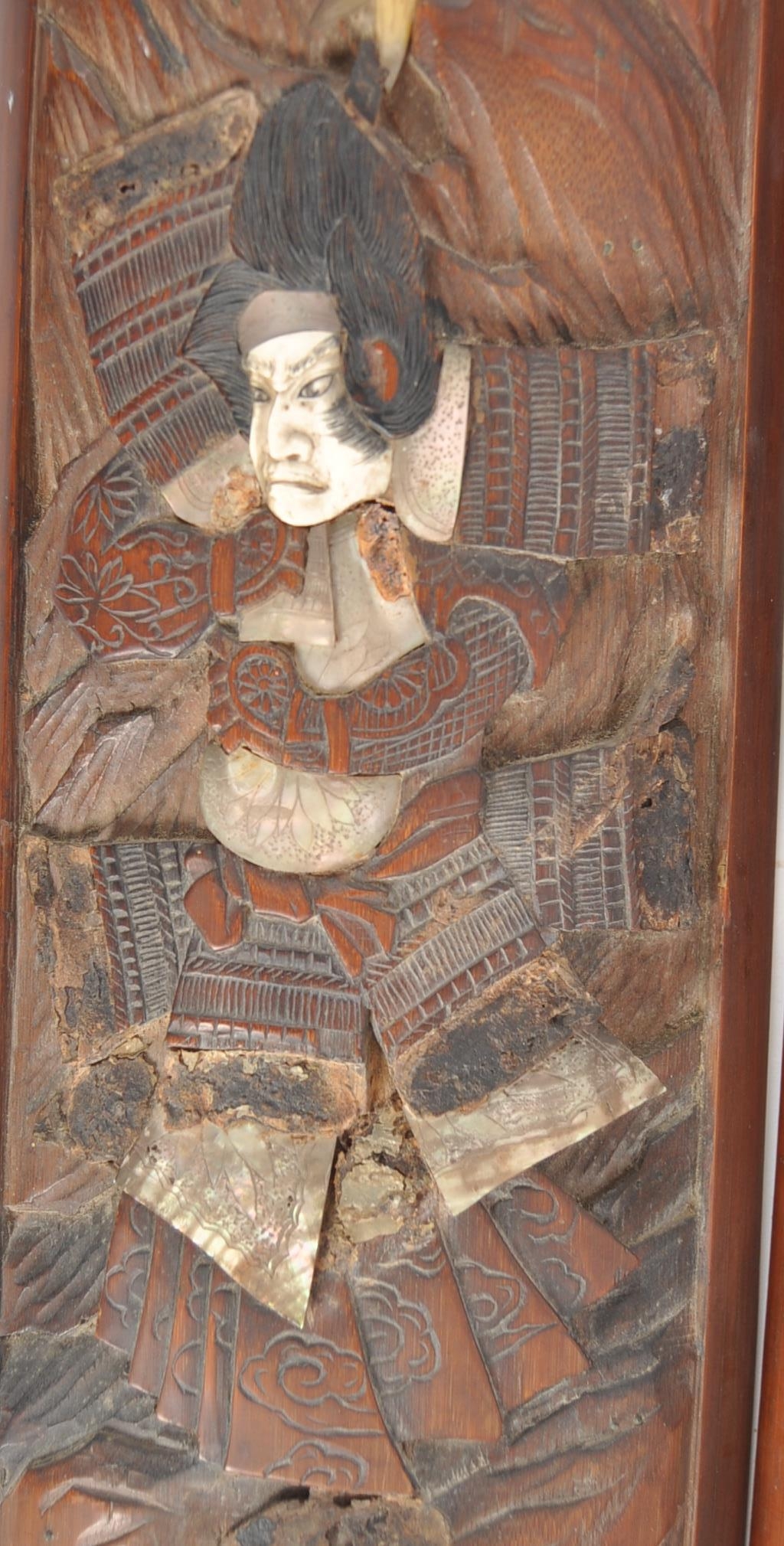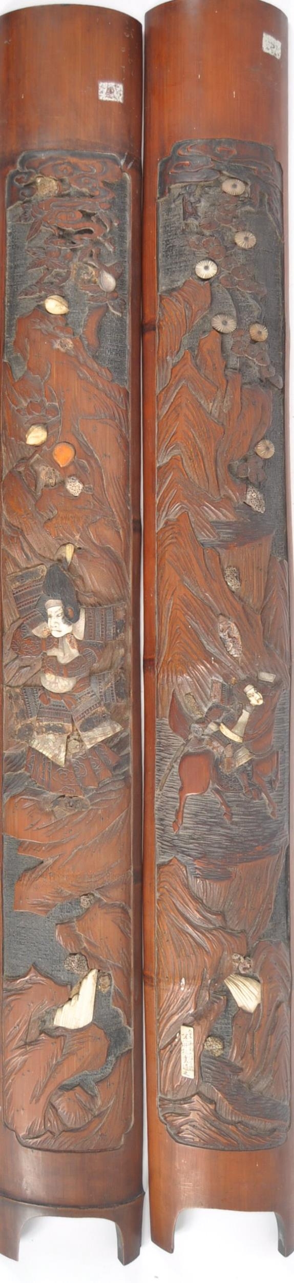 A pair of 19th century Japanese carved bamboo decorated wall panels. Carving of floral decorations with mother of pearl and shibayama detailing. Relief depicting a samurai on horseback with sword drawn. Varying degrees of damage, loss of inlay, shibayama and carvings throughout. Measures approximately 108cm x 12cm.