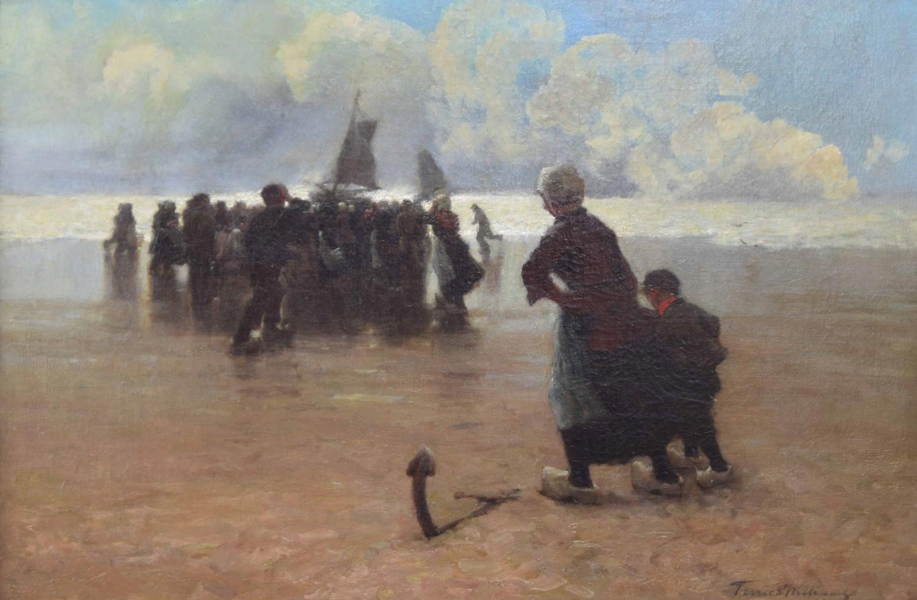 John Terrick Williams RA., RI., ROI., (1860-1936) - "Return of the fishing boats", beach scene at low tide with Dutch figures awaiting the boat, a mother and her son in the foreground, signed, oil on canvas, 20" x 29.5"