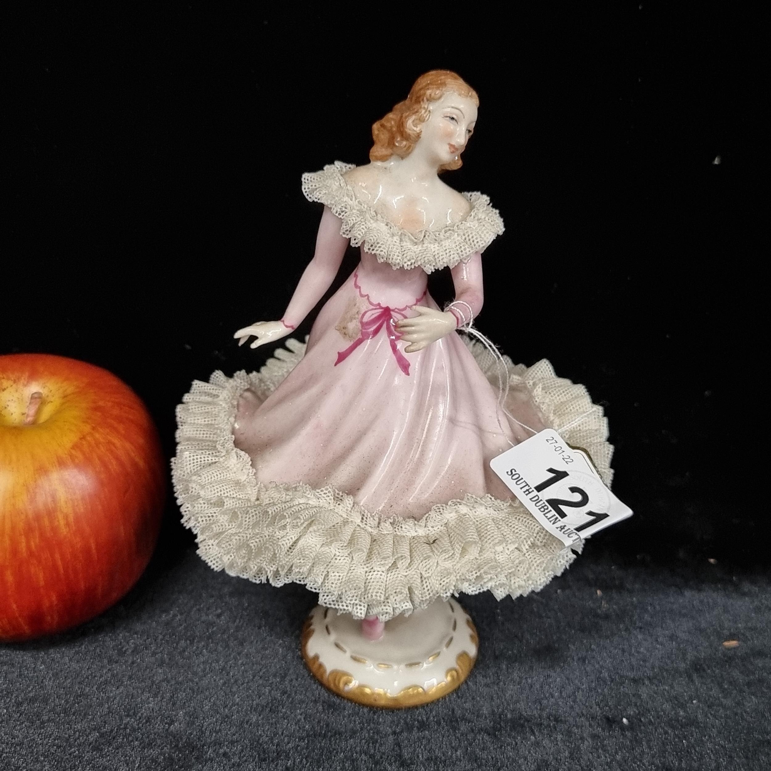 A super vintage Irish Dresden handcrafted porcelain figurine of a very elegant twirling ballerina in a pretty pink dress. In great condition. H: 16cm. From the fabulous antique house in Greystones.
