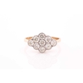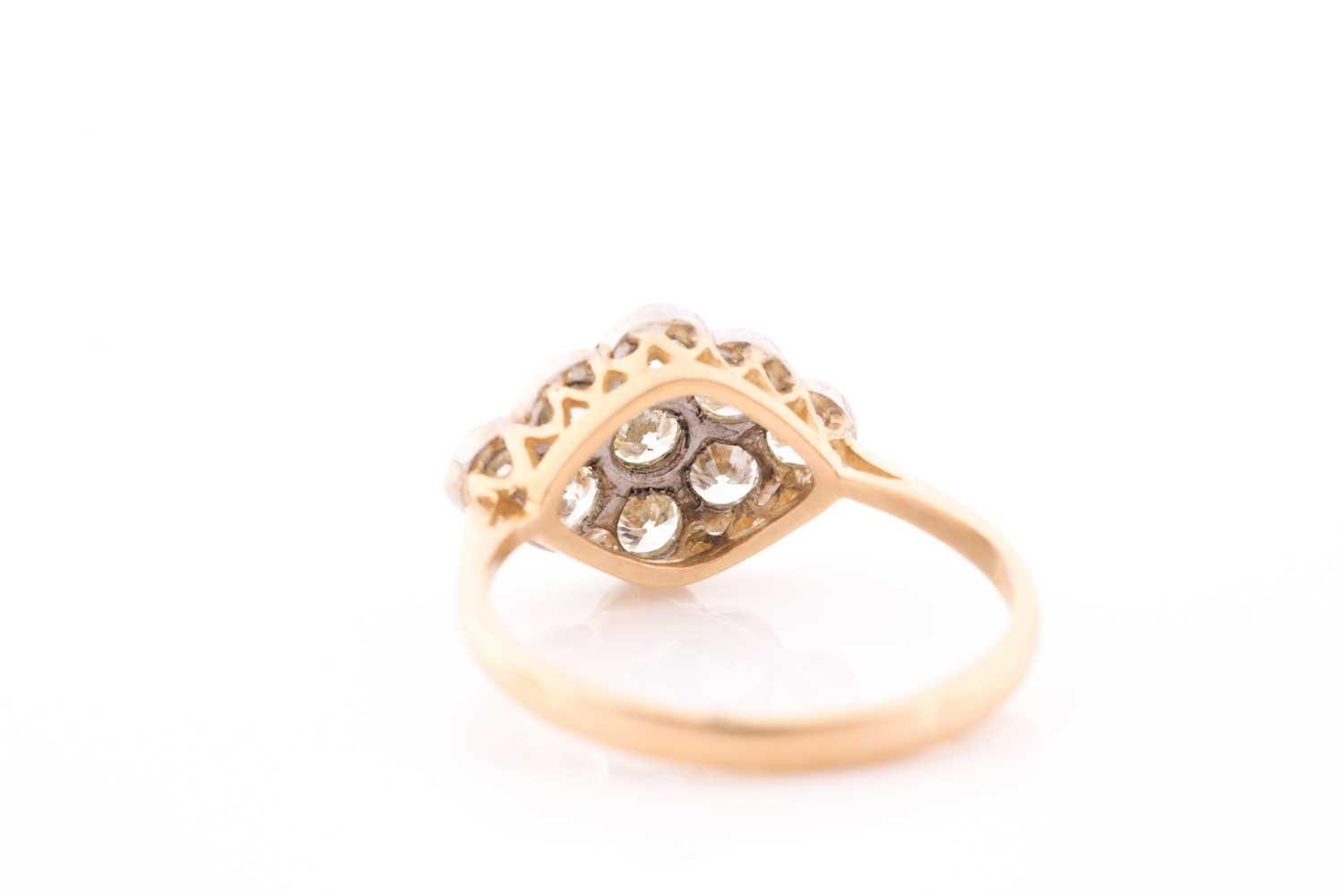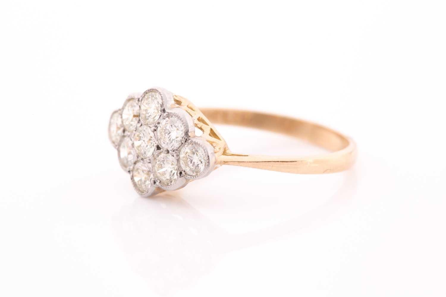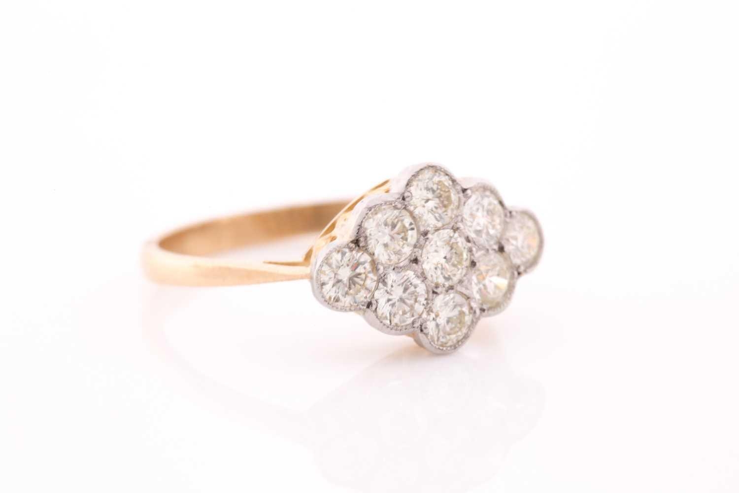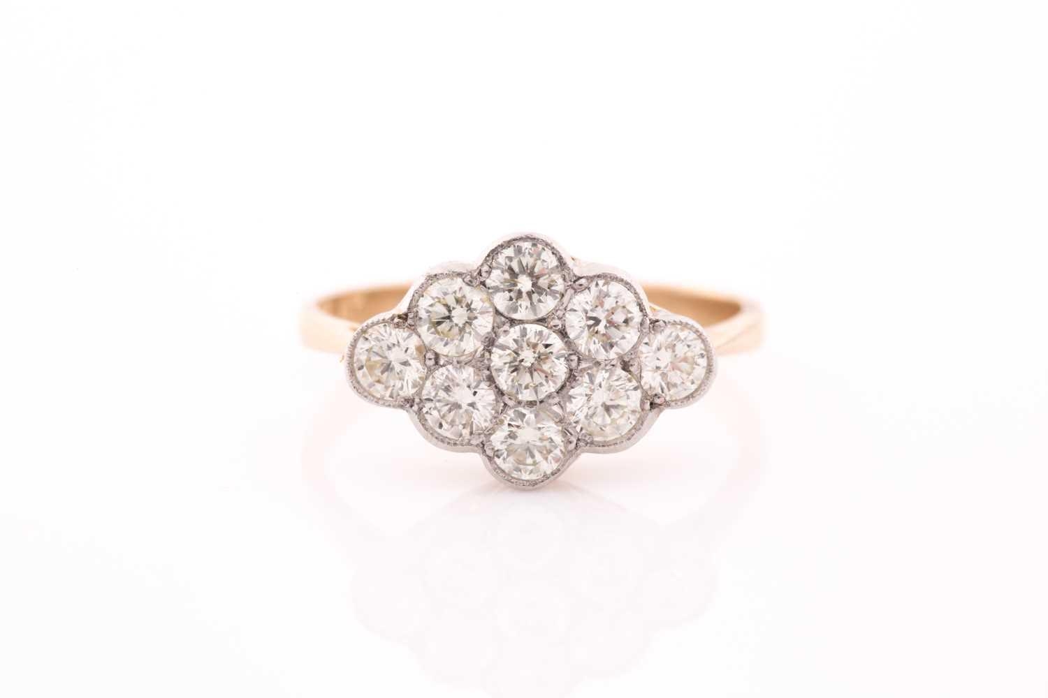 An 18ct yellow gold and diamond ring, set with a cluster of nine round brilliant-cut diamonds of approximately 0.90 carats combined, cluster approximately 14.3 x 9.9 mm, size M, 2.6 grams.