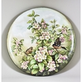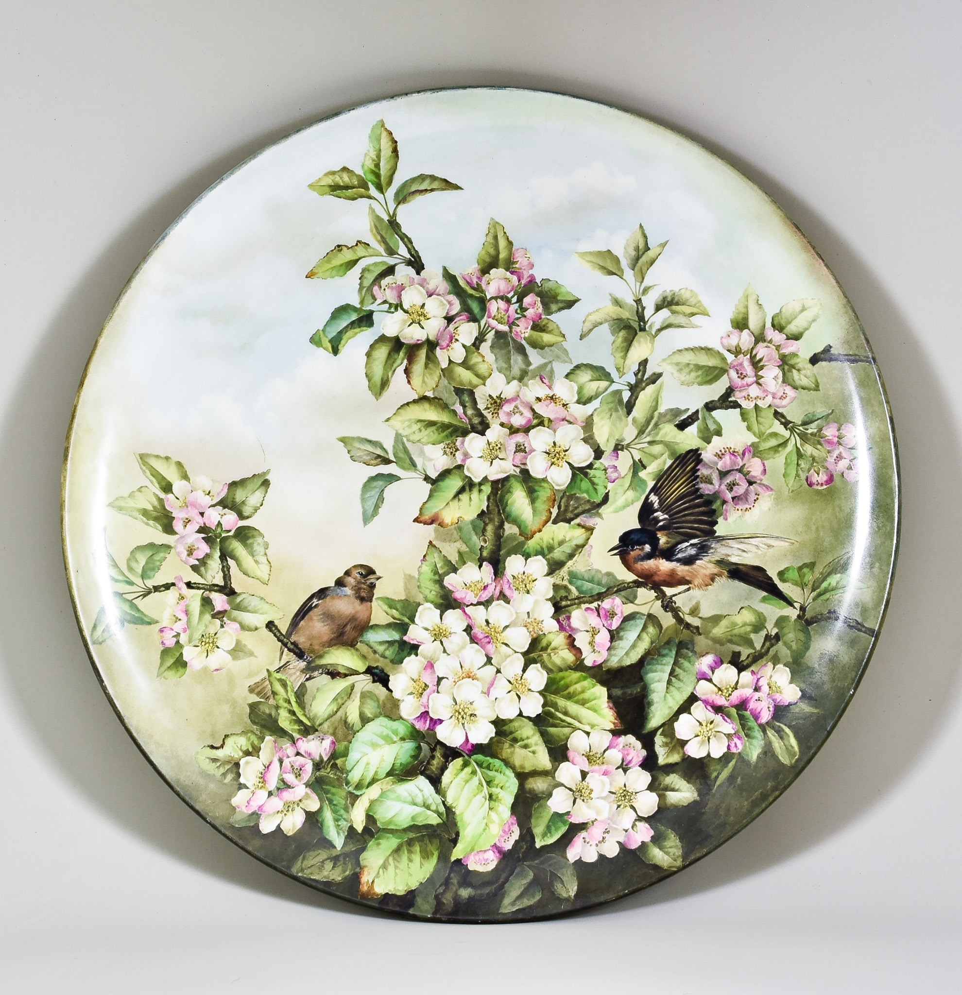 A Ceramic Charger, Late 19th/Early 20th Century, designed by Sara Lee, decorated with a pair of chaffinches amongst dense foliage, 20ins diameter, with signature to back