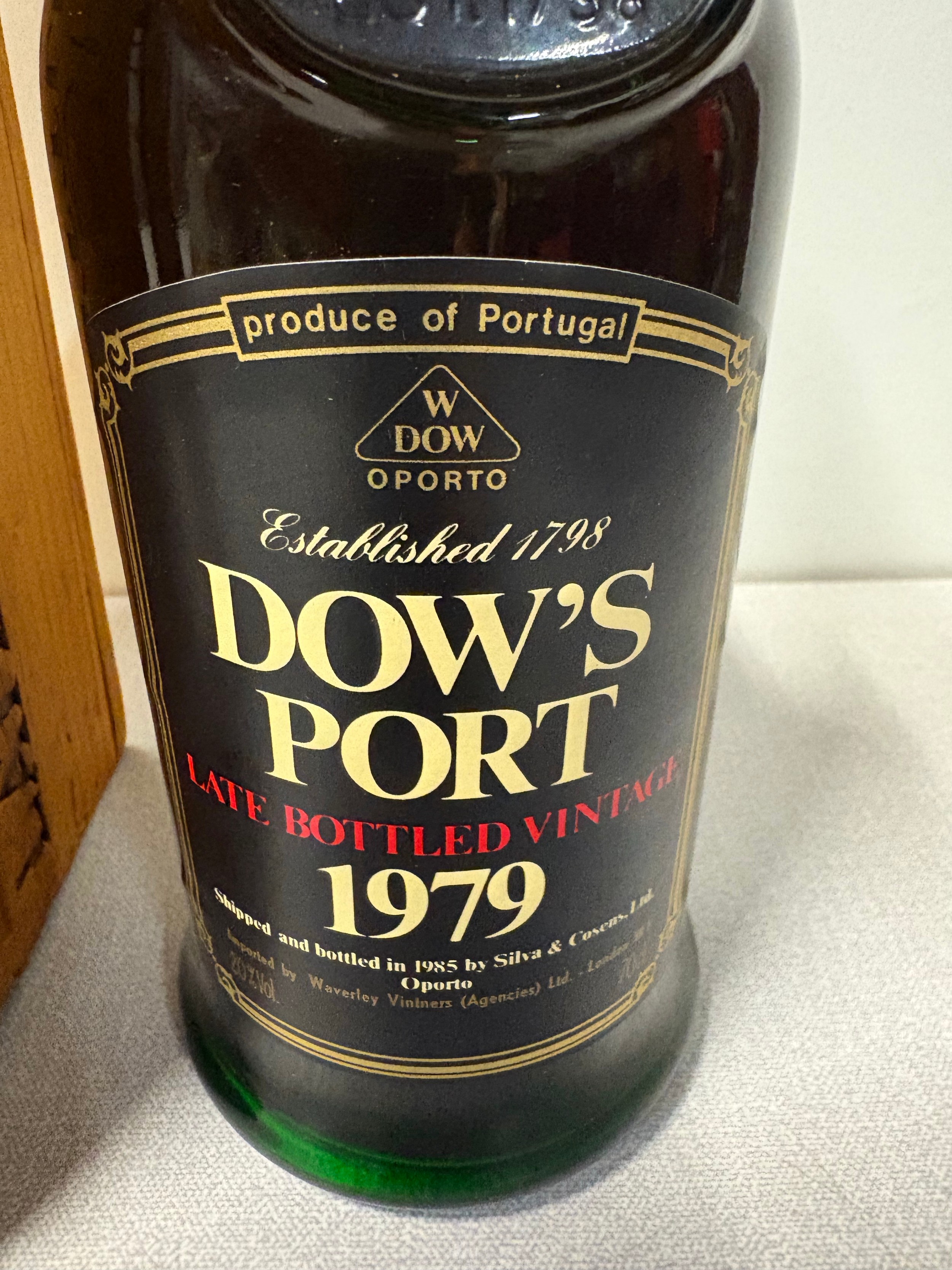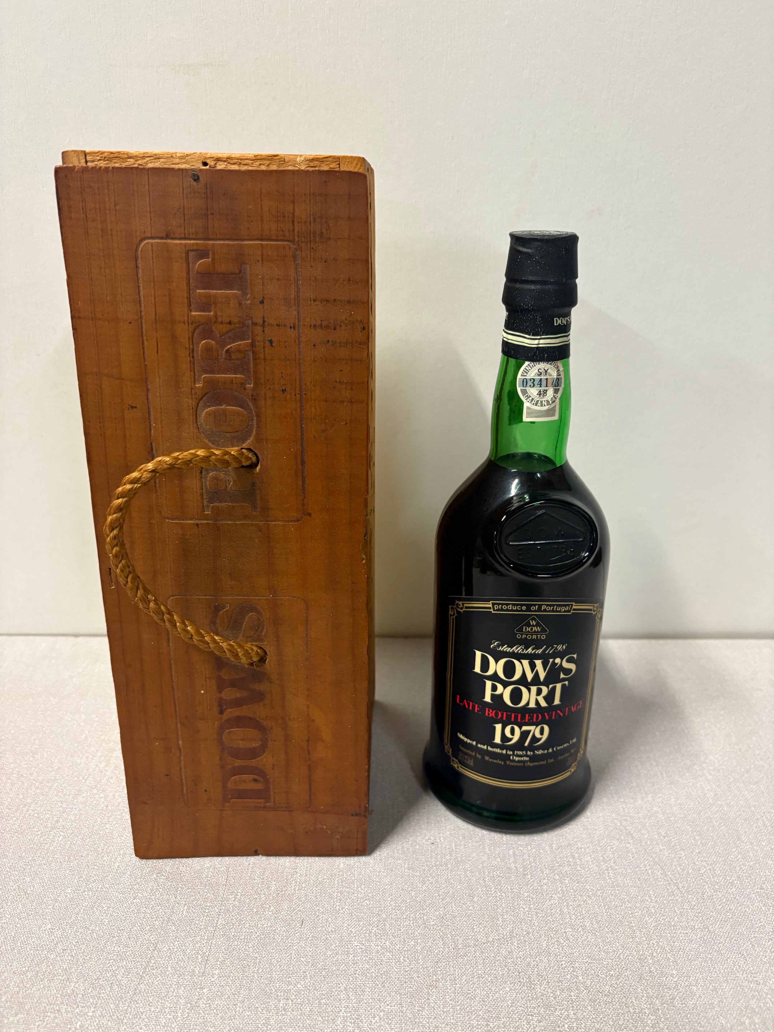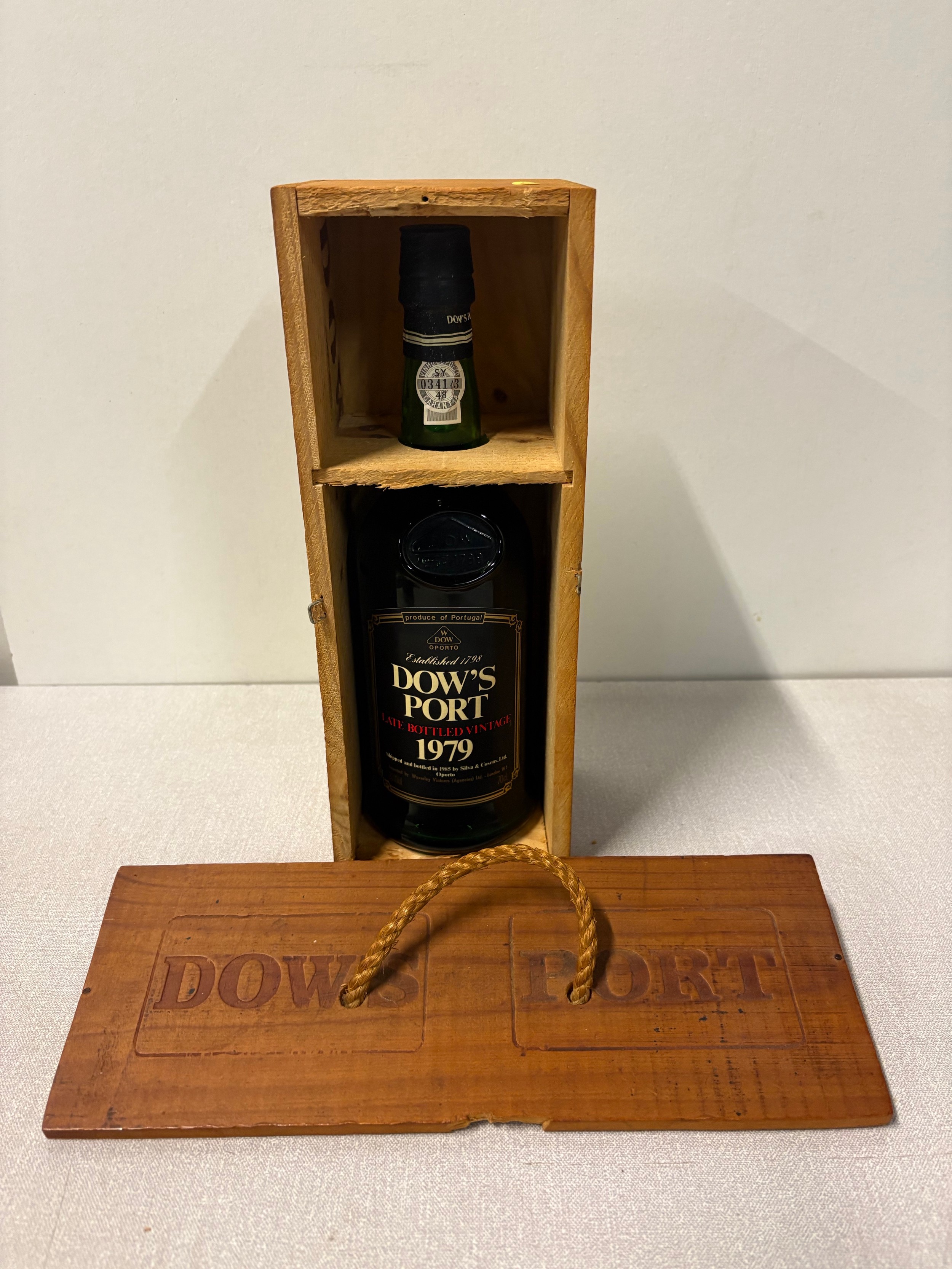 A vintage Dows late bottled vintage port from 1979 within original crate
