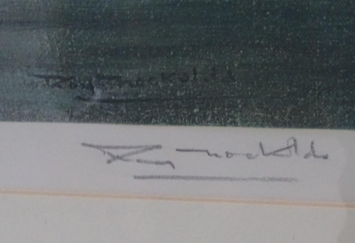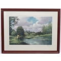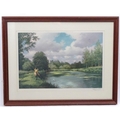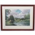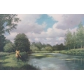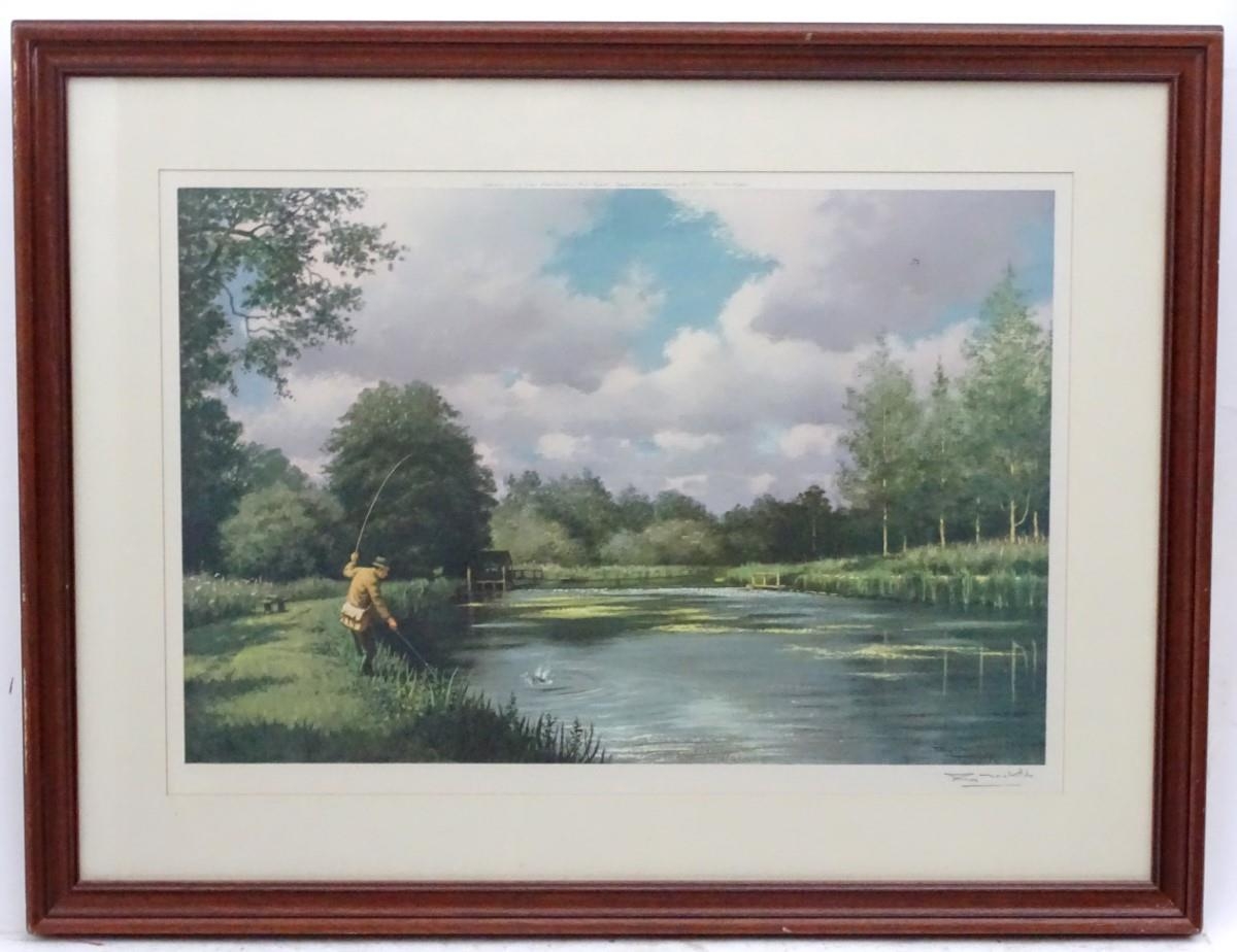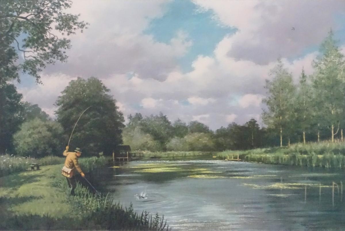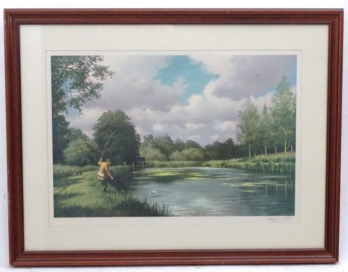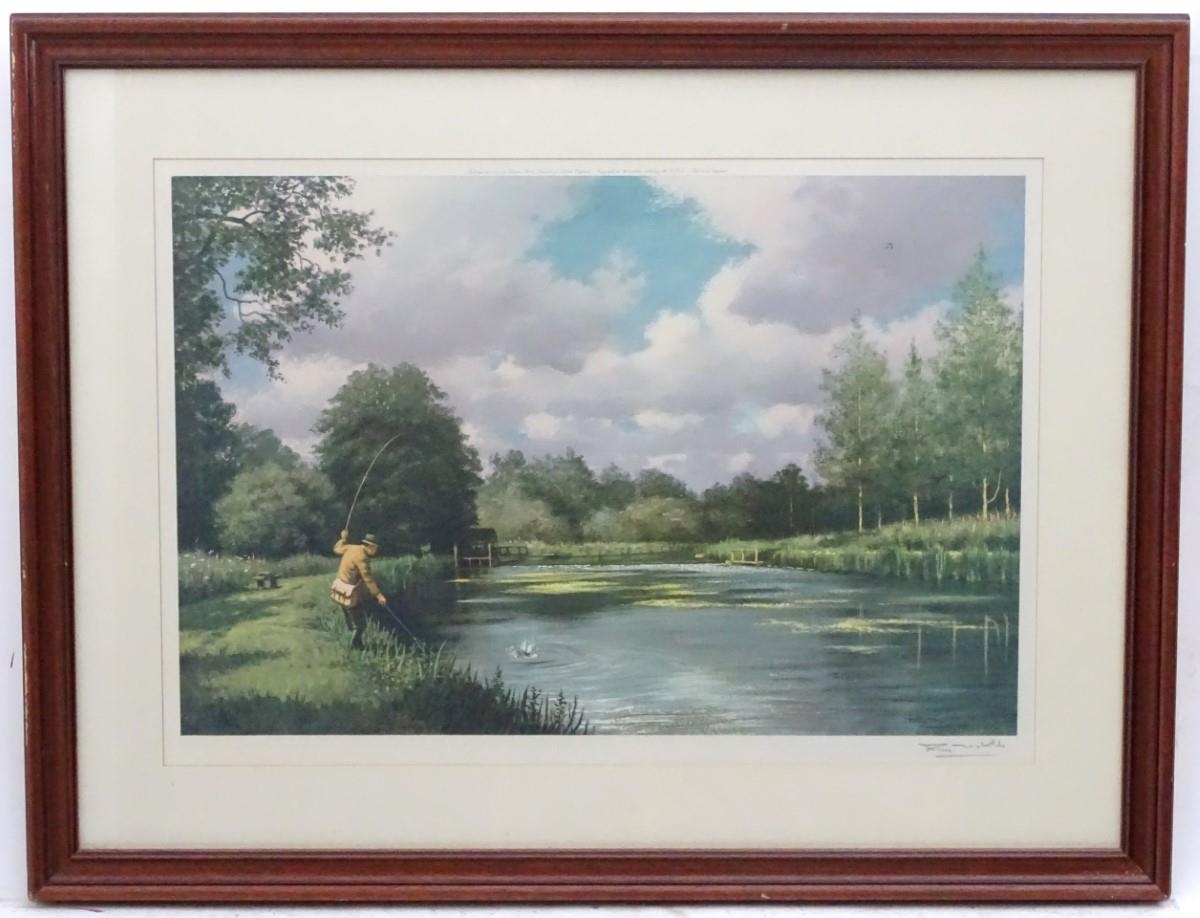 After Roy Thockold, XX, Fly- Fishing, Signed coloured print, Landing a trout on a river, Signed in pencil lower right and with Fine Art blindstamp lower left. Aperture 21 1/2 x 31'' Published by Venture Prints Limited, Bristol in 1971.