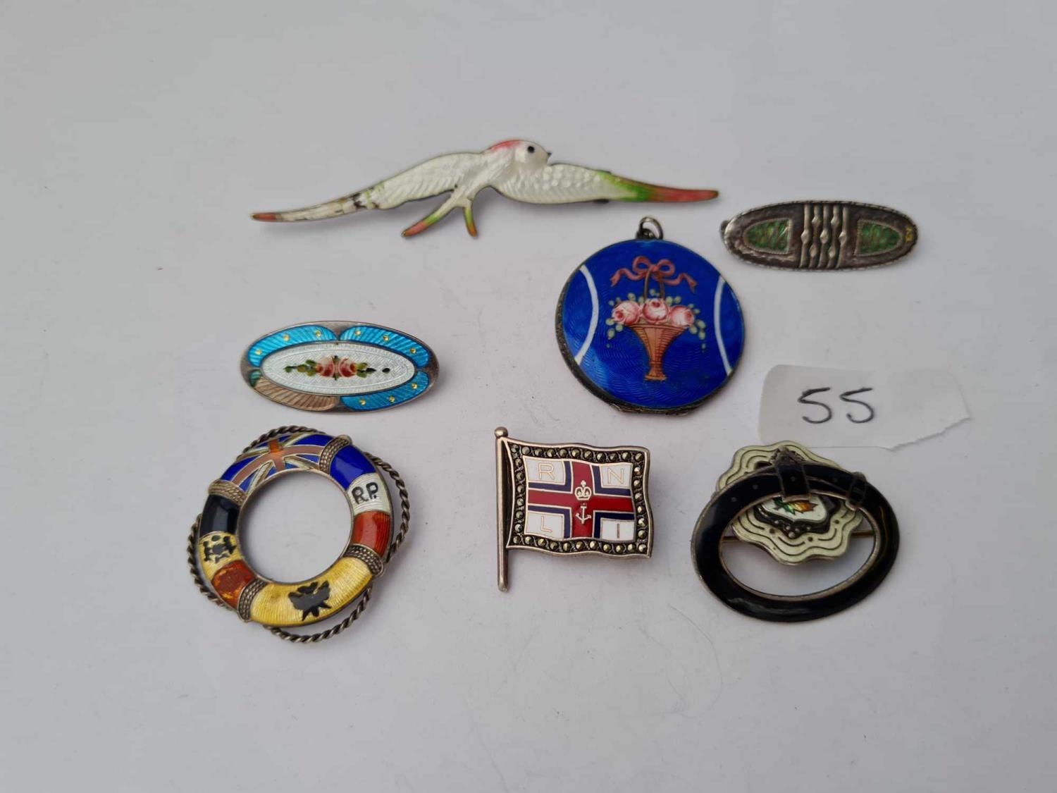 A quantity of assorted silver and enamel brooches pendants etc. some af
