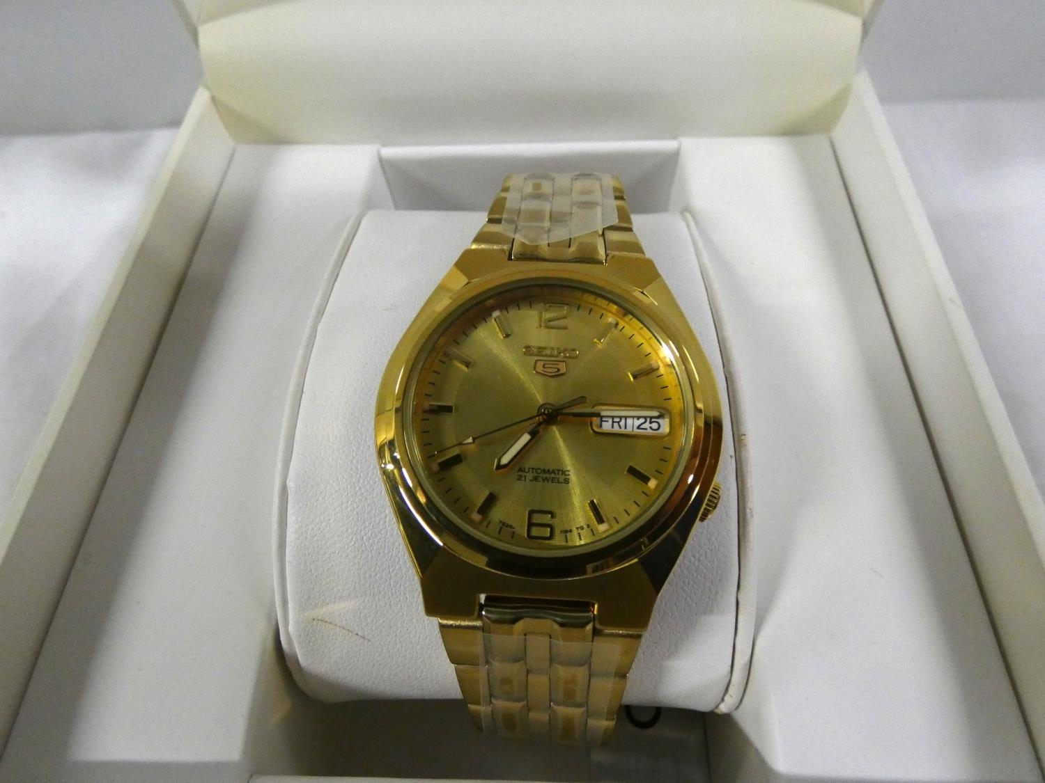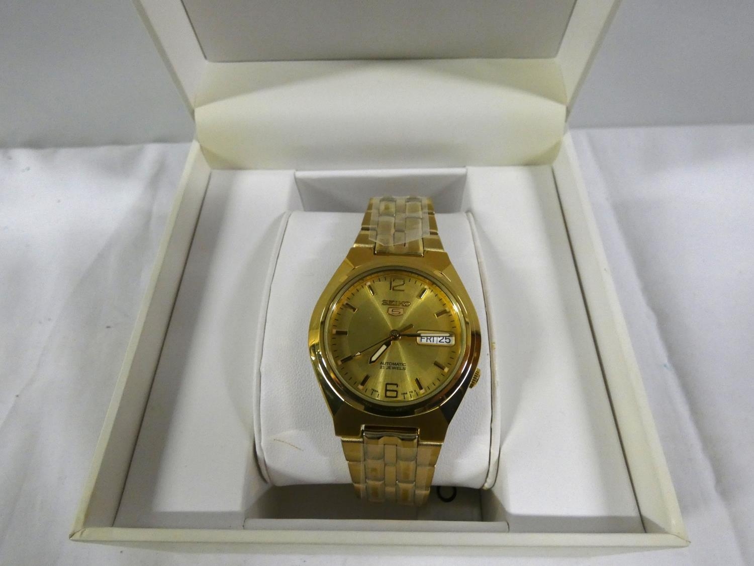 Men's boxed Seiko five 21 jewels watch.