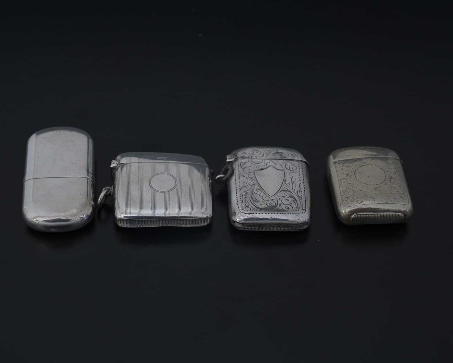 A George V silver lighter, by E S Barnsley & Co., Birmingham 1920, of rounded rectangular form, with detachable cover, length 6.3cm, together with two hallmarked silver vesta cases, and a single plated vesta (4)