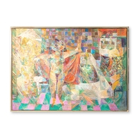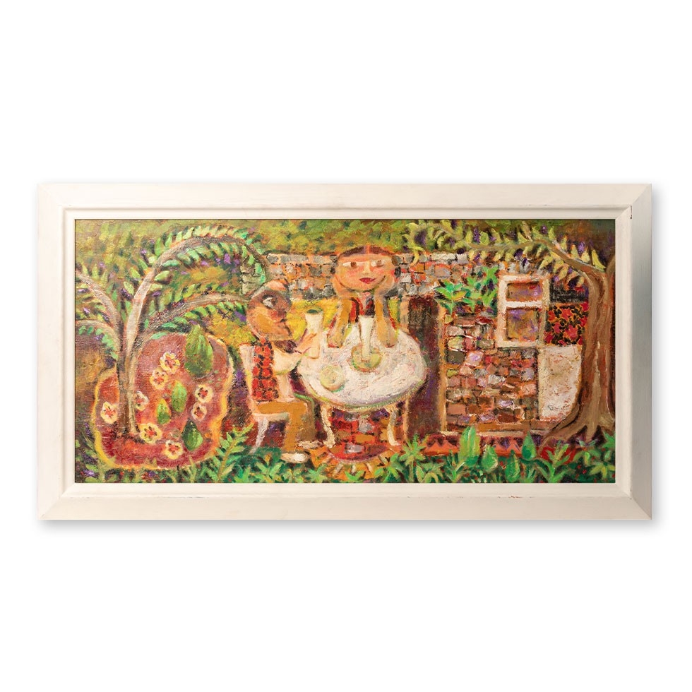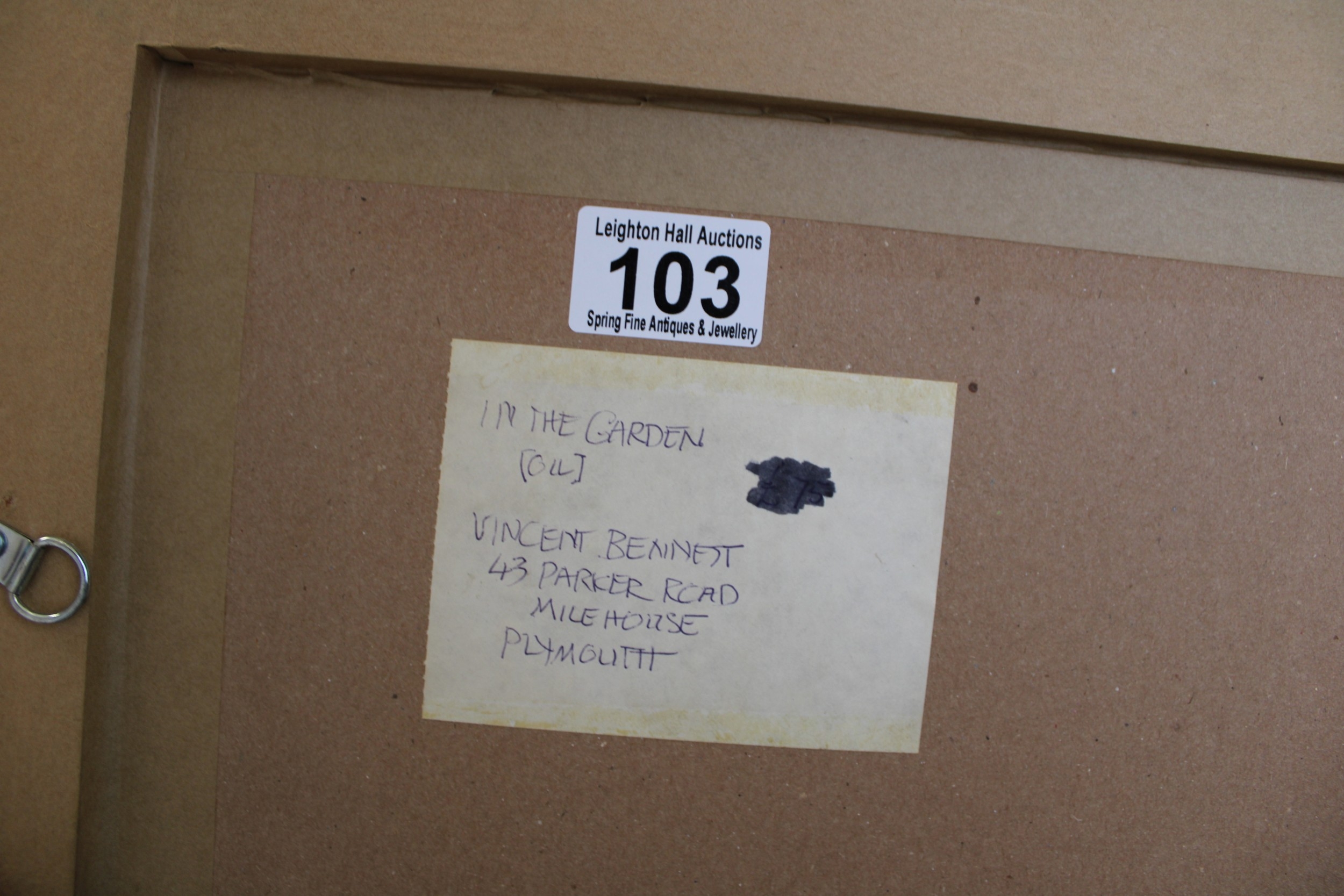 Vincent Bennett (1910 - 1993) Oil on board, 'In The Garden' Signed to verso, framed, 37cm x 74.5cm.