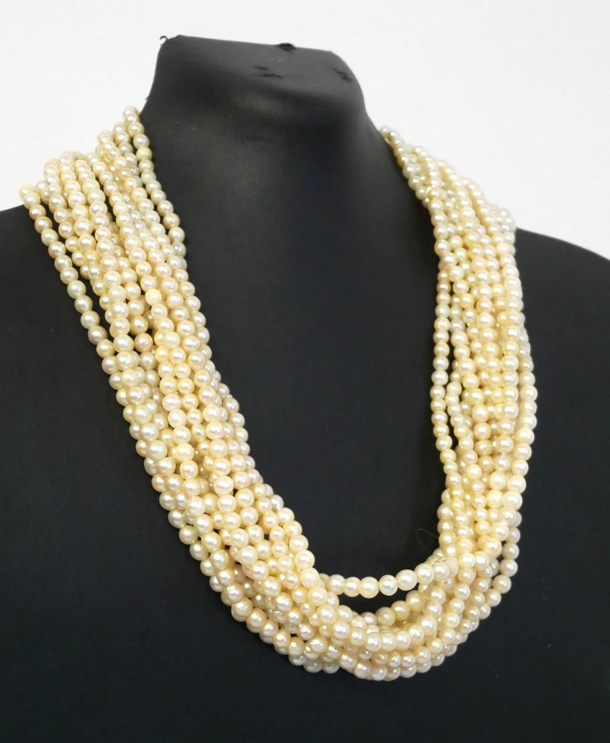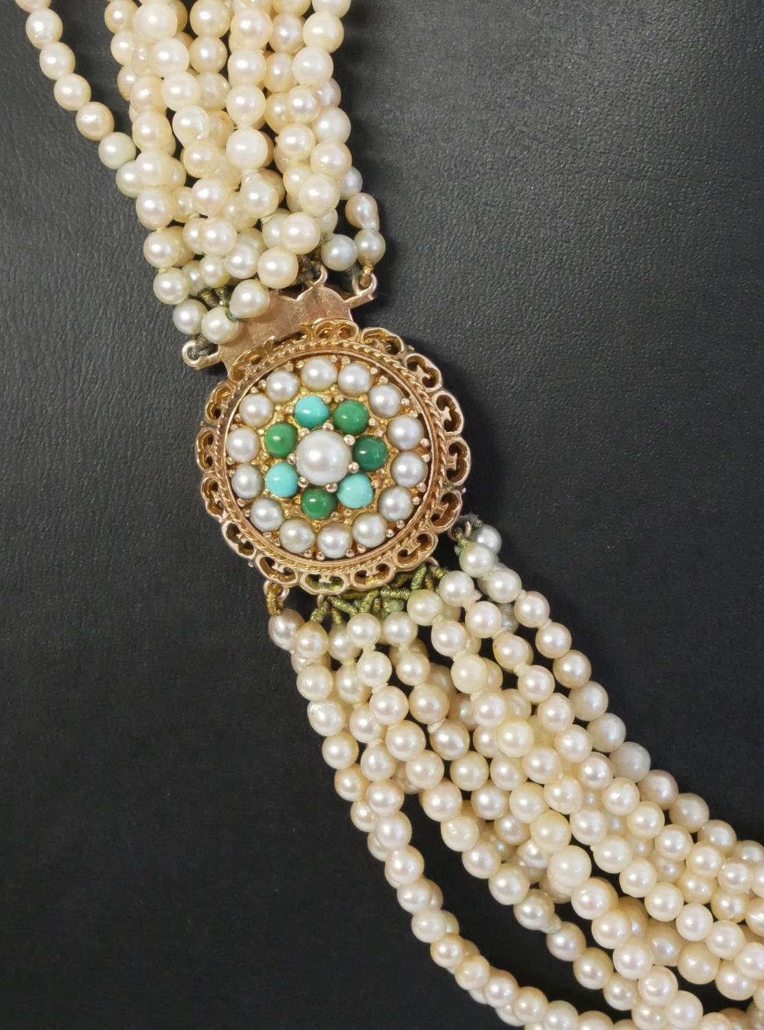 Having a 9ct yellow gold circular pierced clasp, decorated with turquoise and pearls, a multi strand twisted design to necklace consisting of twelve strands, in original retailer box ‘Tecla, London’.