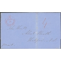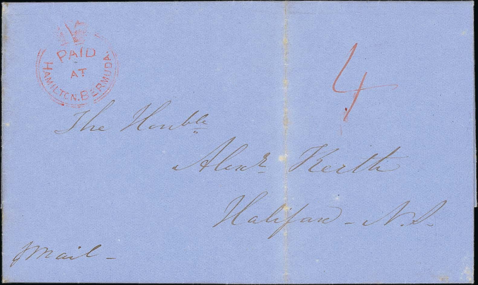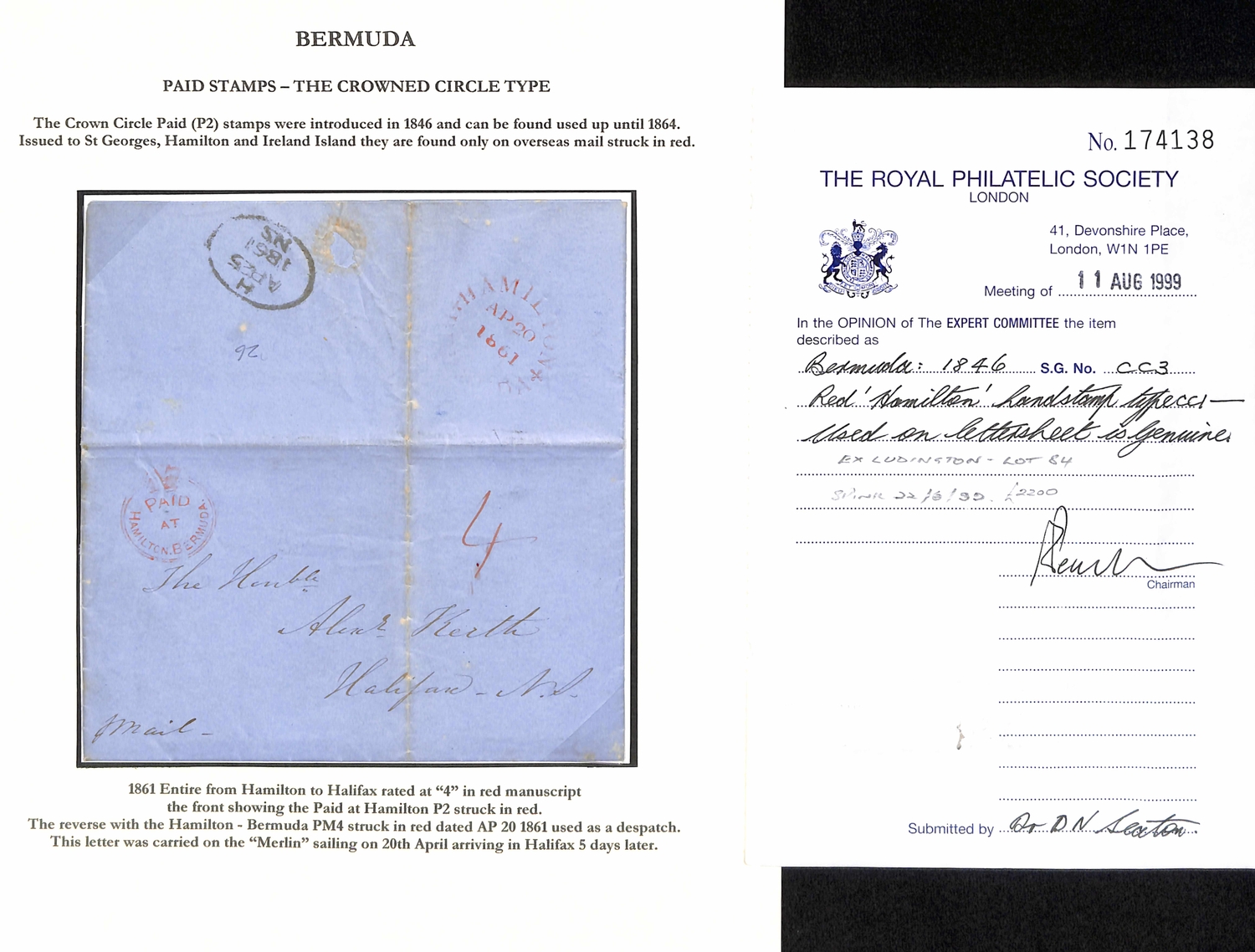 Hamilton. 1861 (Apr 20) Entire letter to Halifax, Nova Scotia, prepaid 4d, a fine red Hamilton crowned circle on the front, backstamped with red Hamilton datestamp type PM4, and at Halifax (Apr 25), carried on the "Merlin", vertical file fold, otherwise fine with an unusually good strike of the crowned circle. Ex Ludington and Osborn Collections, with R.P.S Certificate (1999). S.G. £4,000. Photo on Inside Front Cover.