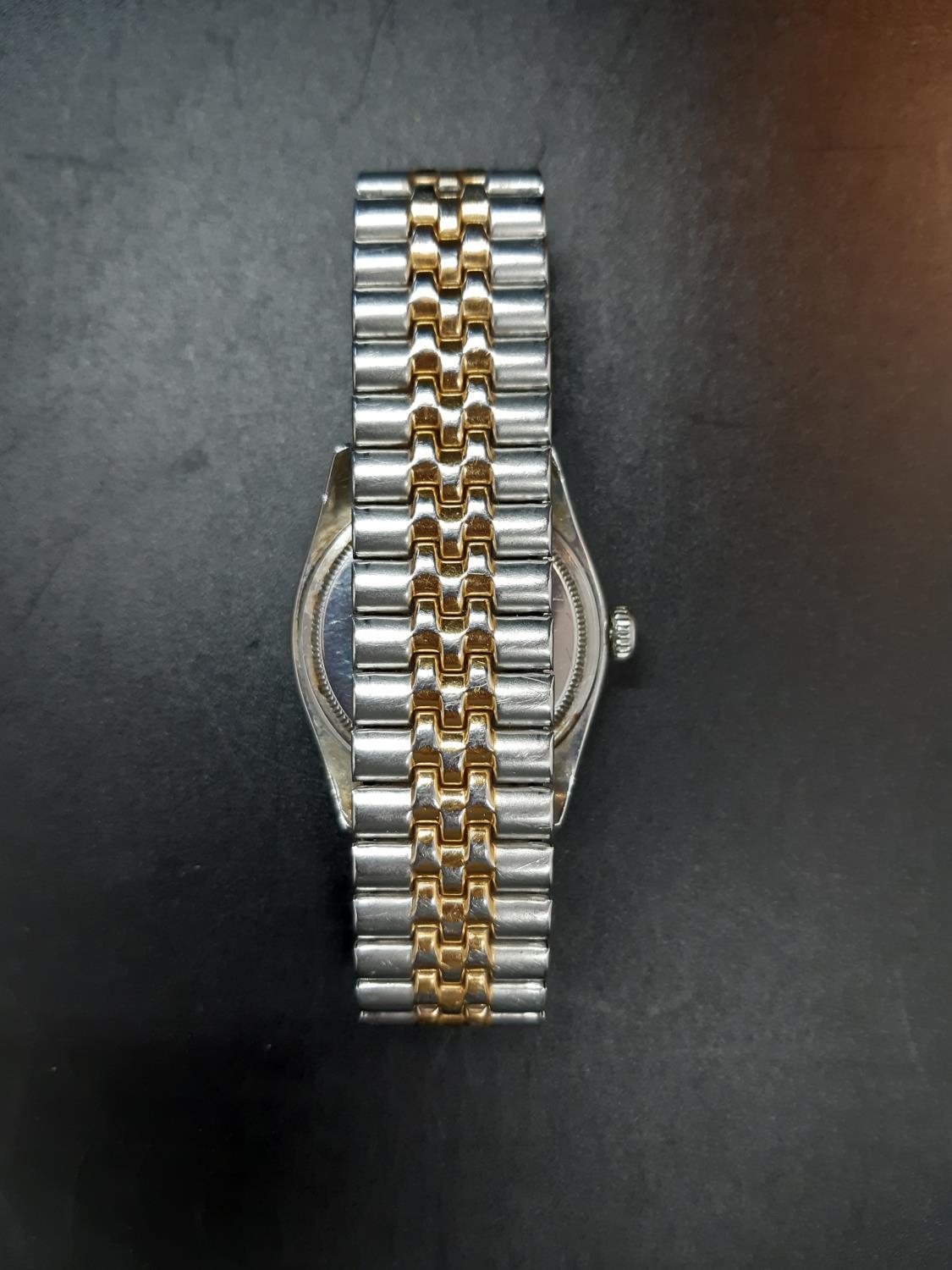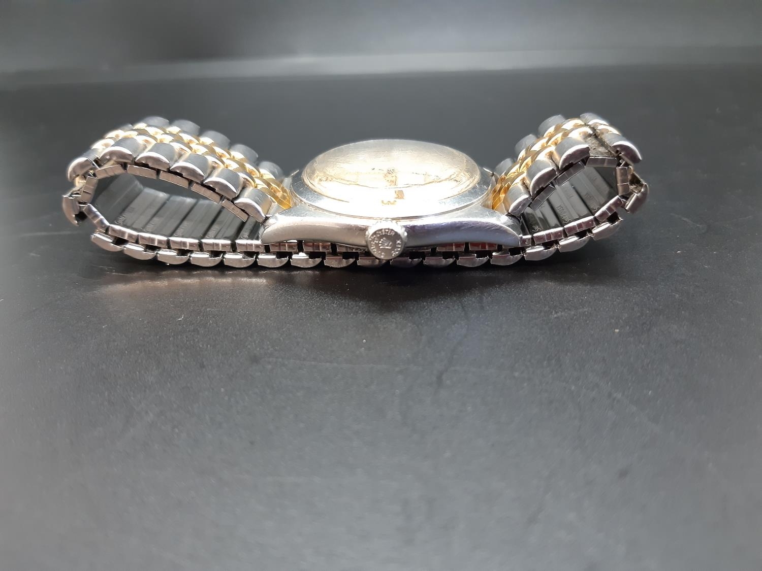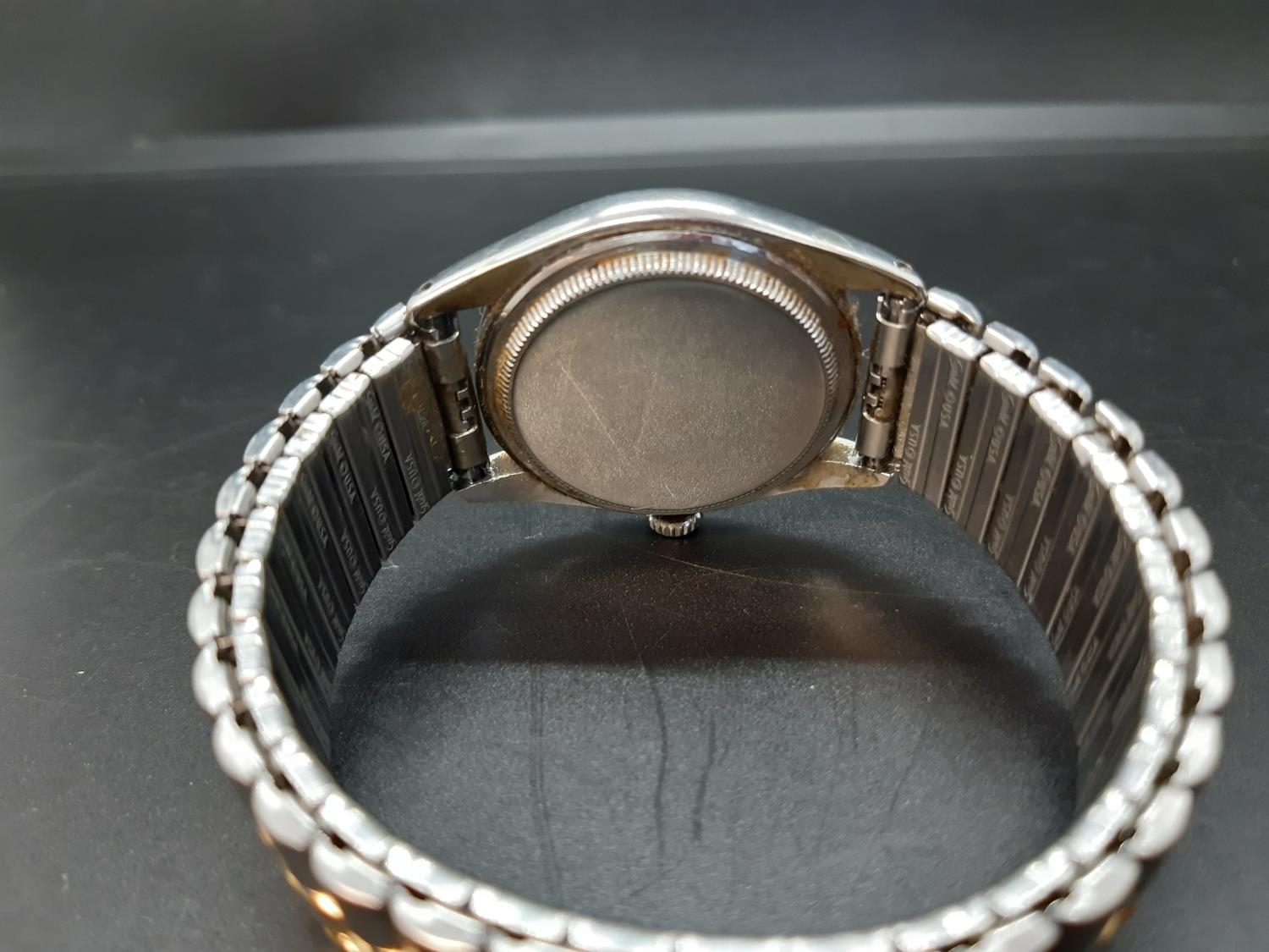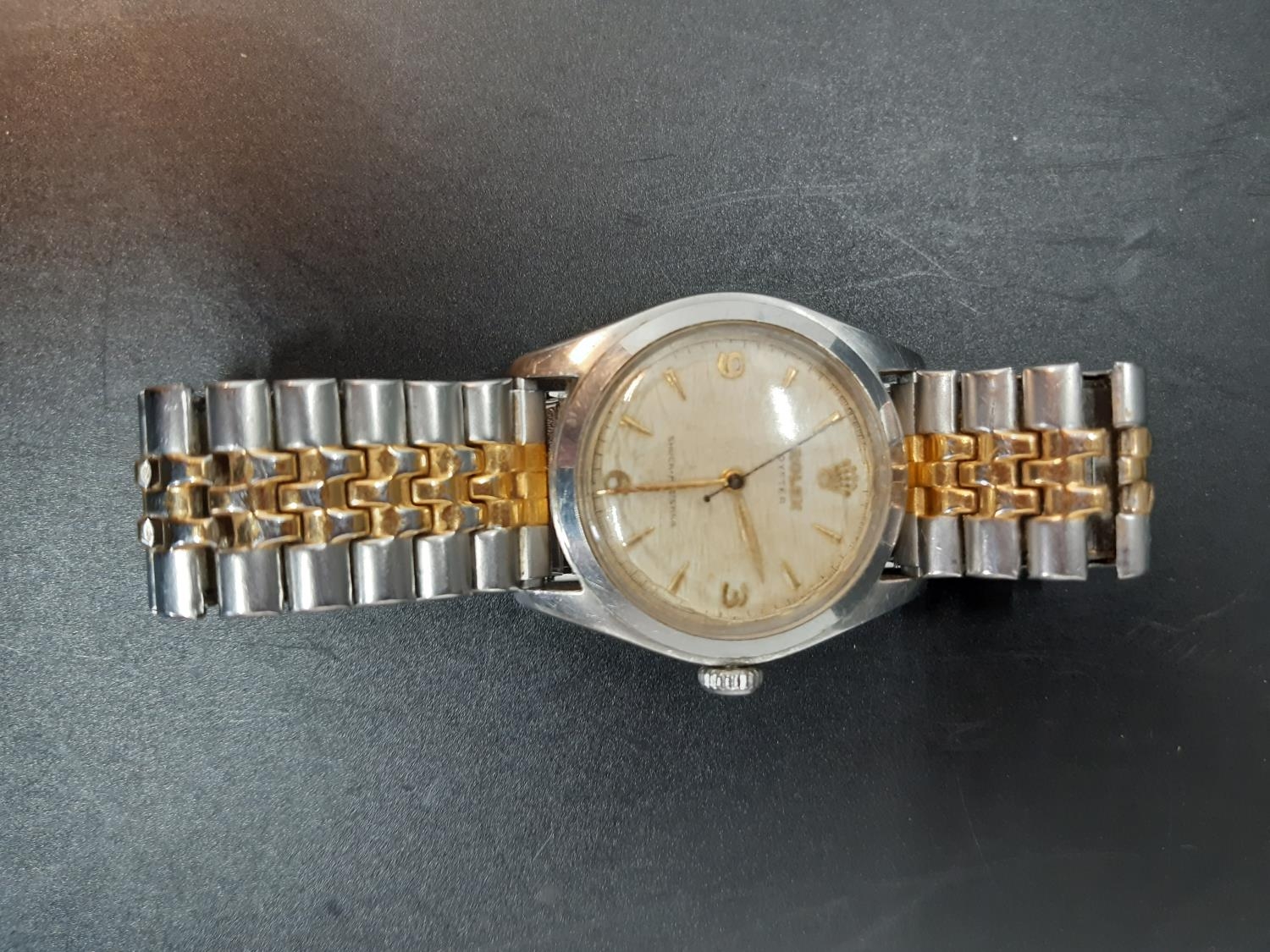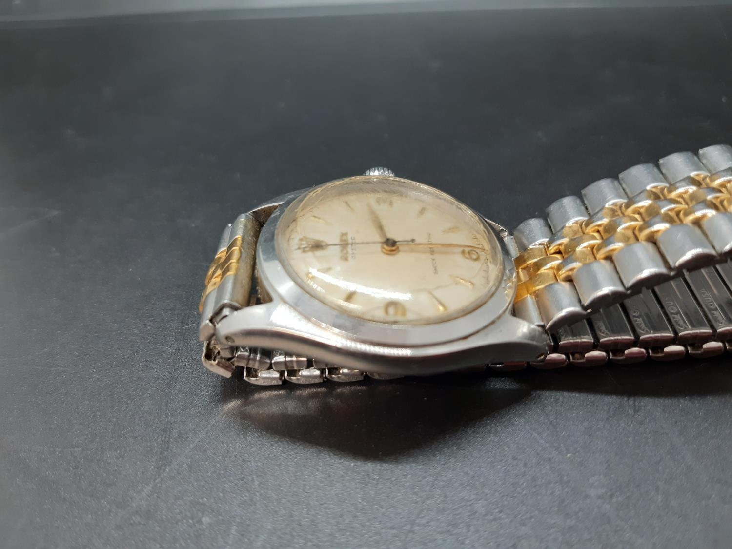 A late 1950s Rolex Oyster 6082 manual wind wristwatch with off-white dial, 15 jewel movement, a mixture of Applied gilt Arabic numerals and applied arrowhead batons, stamped “Rolex Oyster” to top with crown/coronet logo, signed “shock-resisting” to base of dial, pointed hands, screw down back, later added elasticated stainless steel and gold plated “special USA” strap and “special oyster” crown wind