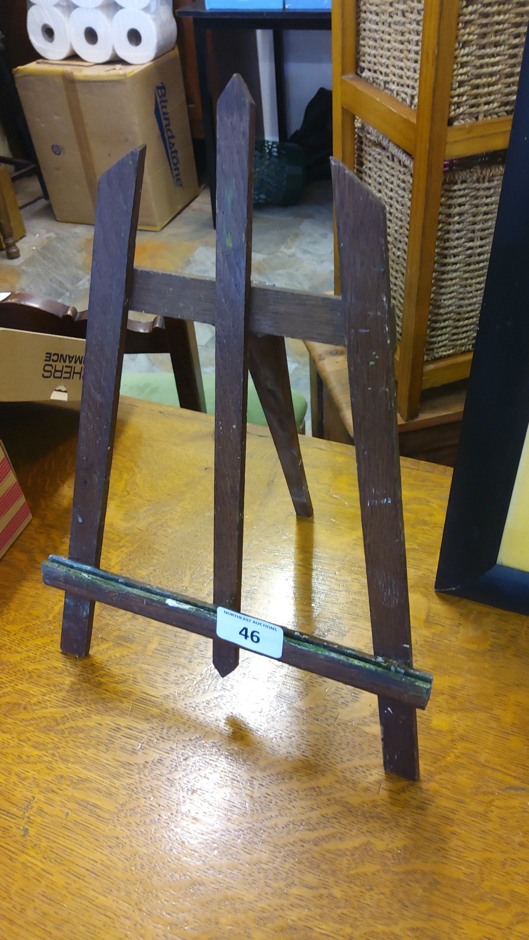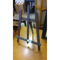 Artist’s tabletop easel in stained wood, with three slatted uprights, an A-frame rear support, and a stepped ledge for holding a canvas or board; folding construction.