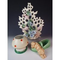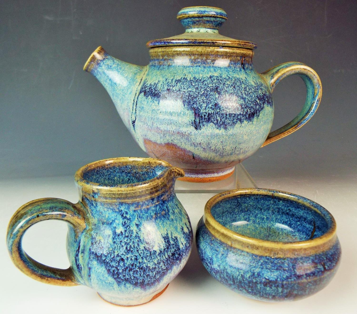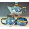 Pretty stoneware teapot with matching milk jug and sugar bowl. Excellent condition.