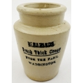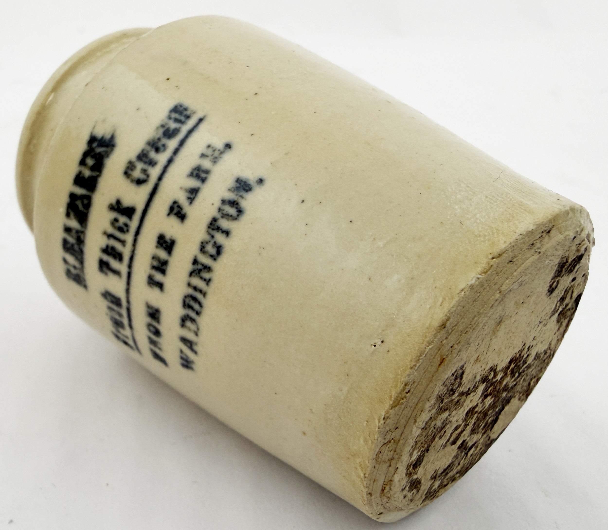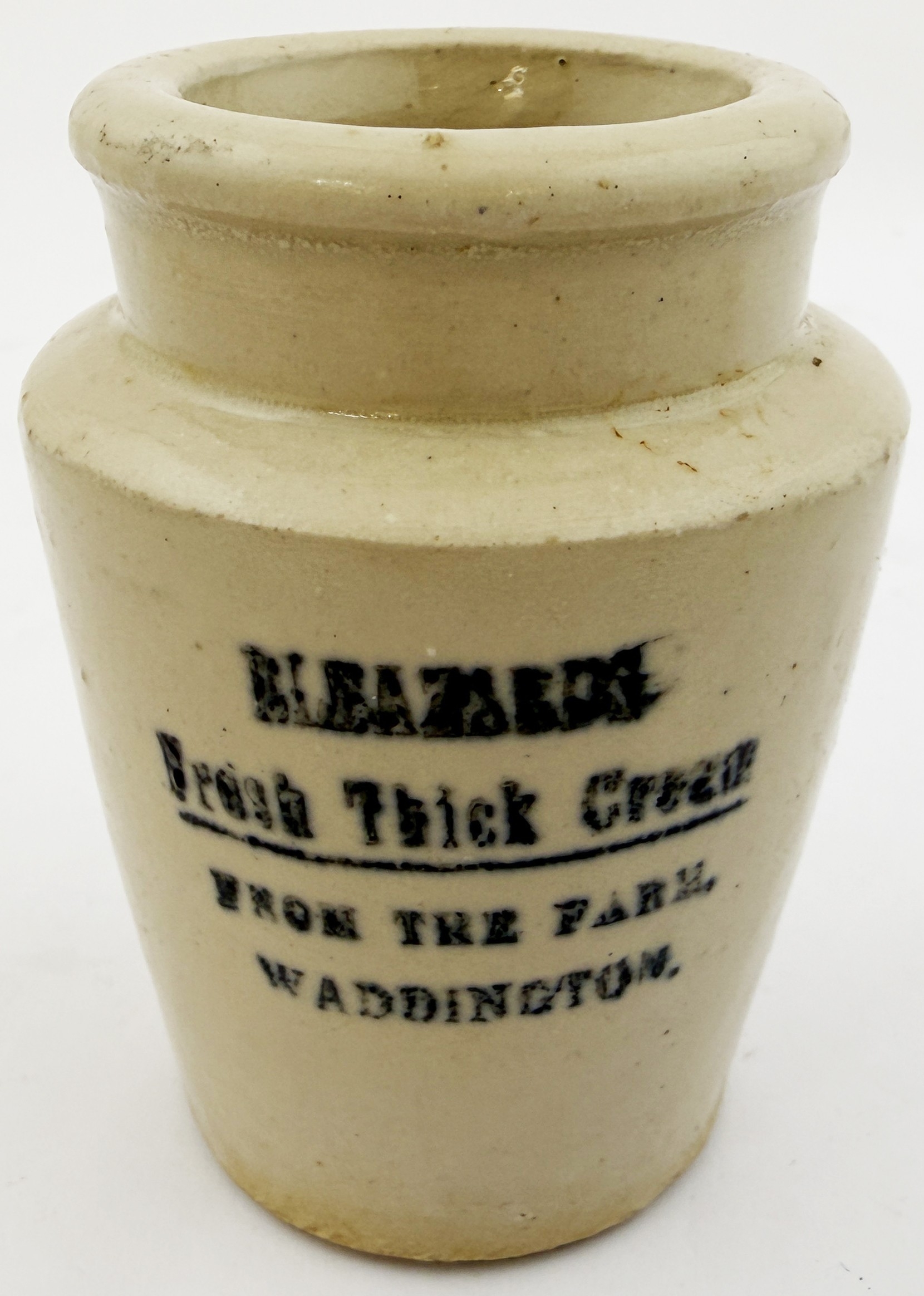 BLEAZARDS WADDINGTON CREAM POT. 2.8ins. Small size all white cream pot printed BLEAZARDS/ Fresh Thick Cream/ FROM THE FARM/ WADDINGTON. Waddington is near Clitheroe Lancashire. Hugh Davidson collection. Excellent condition,