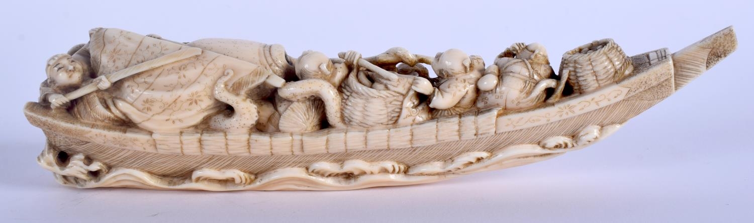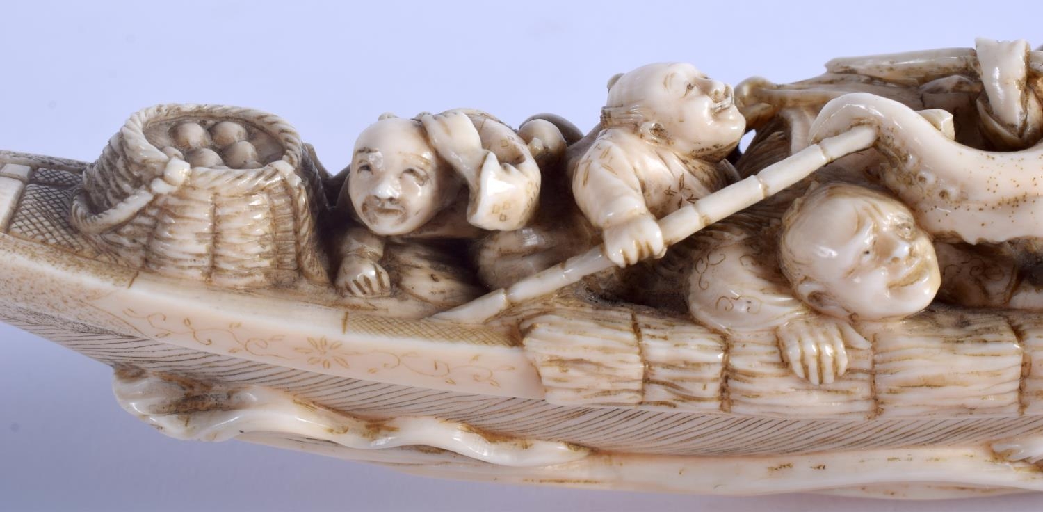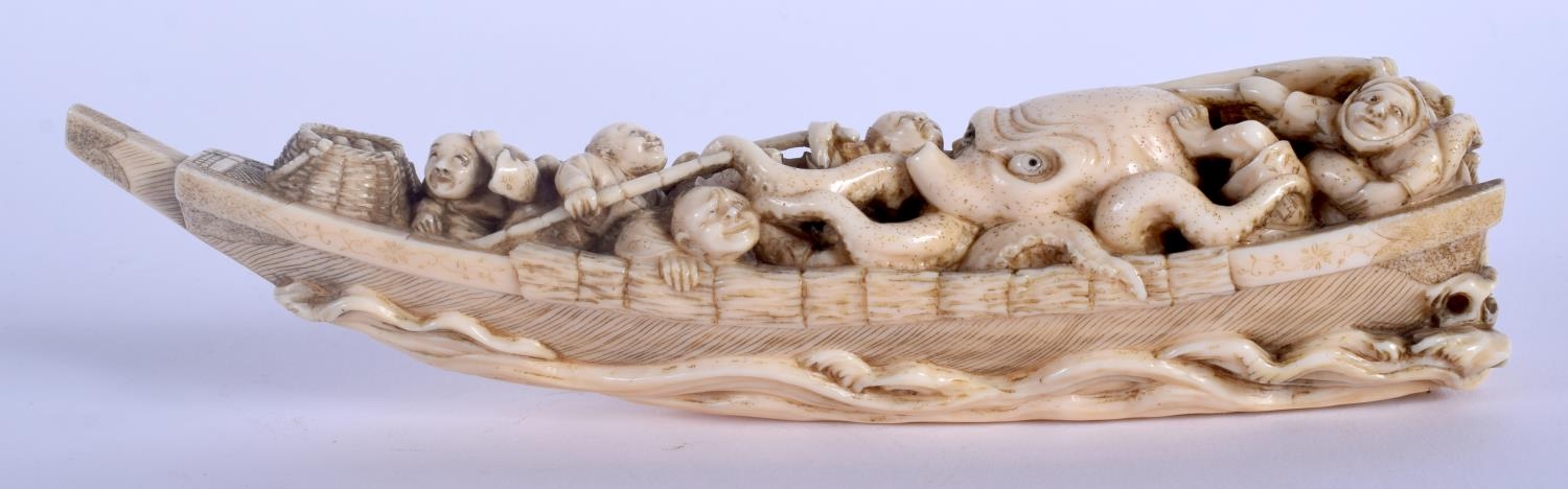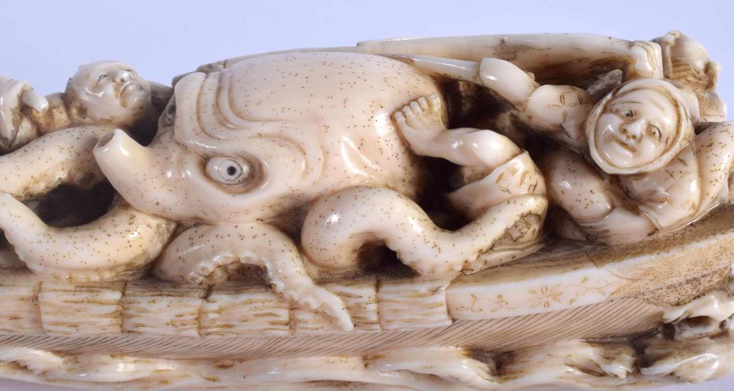 A 19TH CENTURY JAPANESE MEIJI PERIOD CARVED IVORY OKIMONO modelled as figures beside an octopus. 17 cm wide.