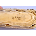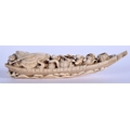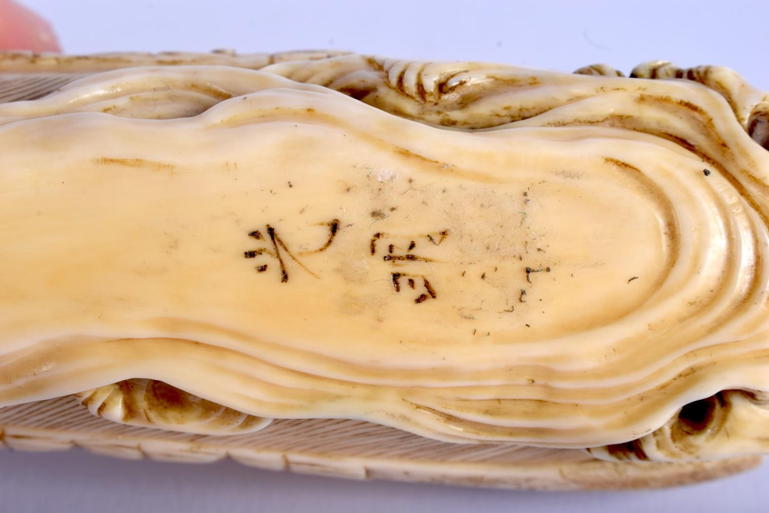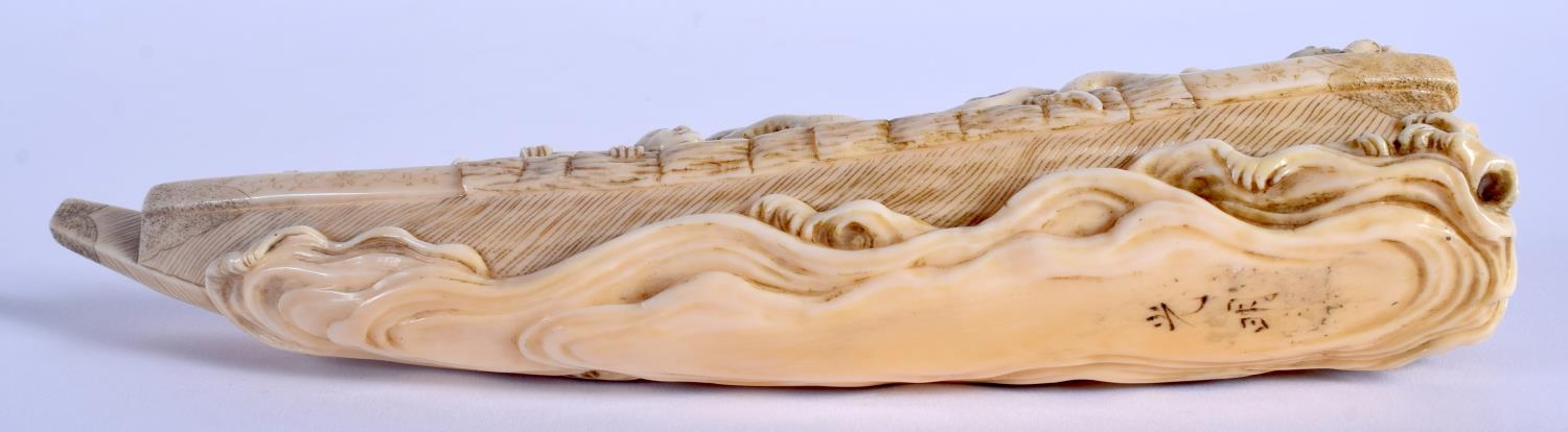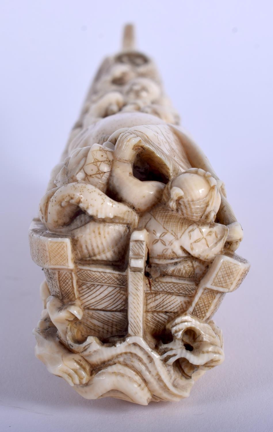 A 19TH CENTURY JAPANESE MEIJI PERIOD CARVED IVORY OKIMONO modelled as figures beside an octopus. 17 cm wide.