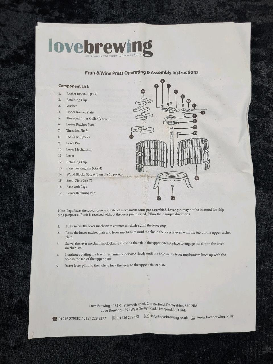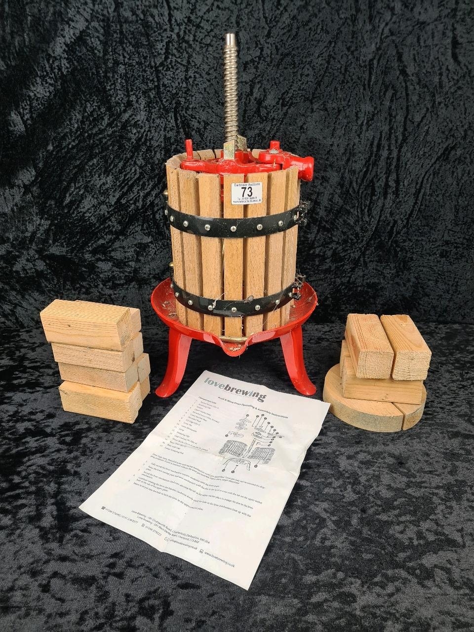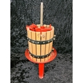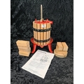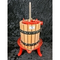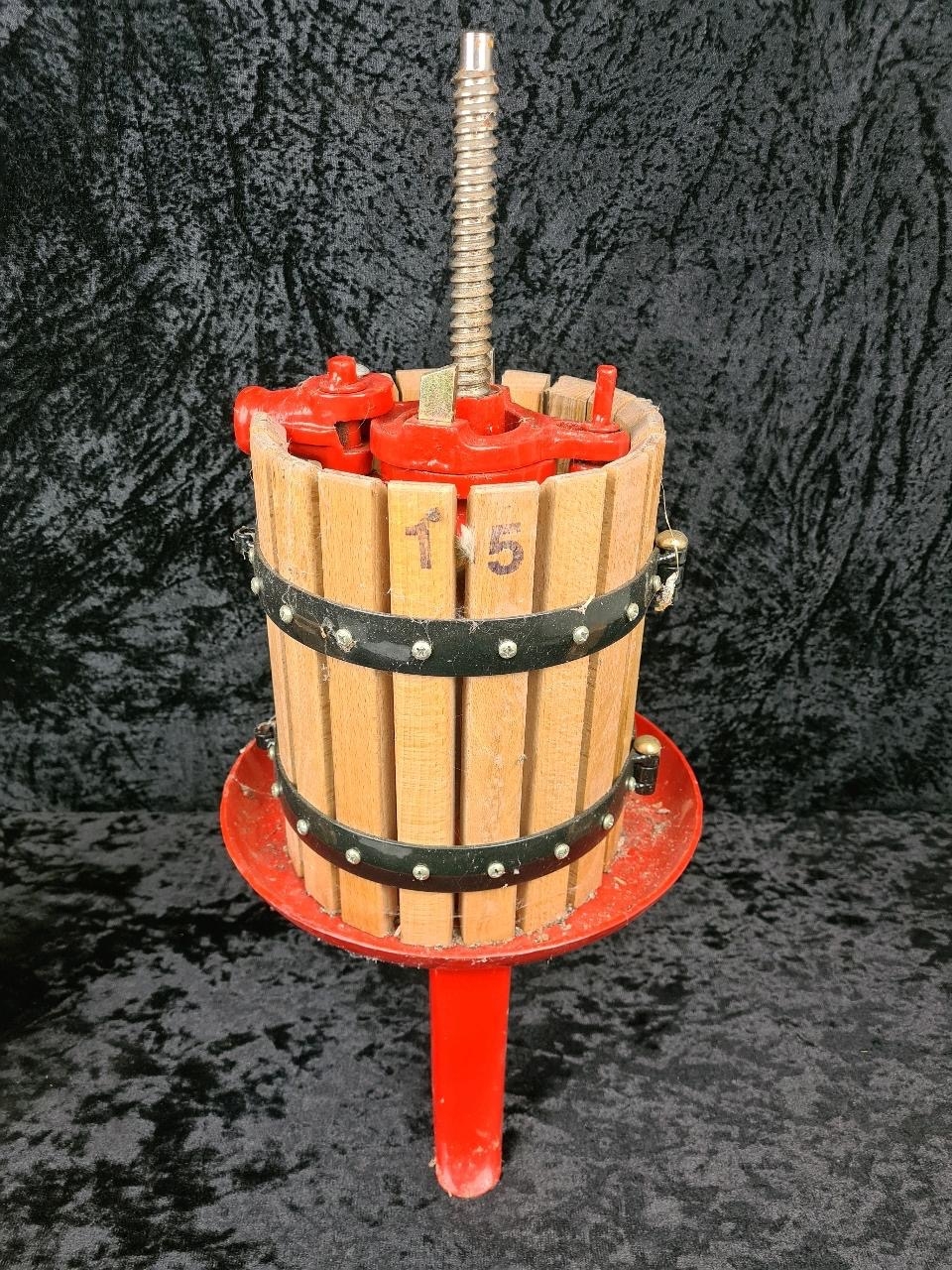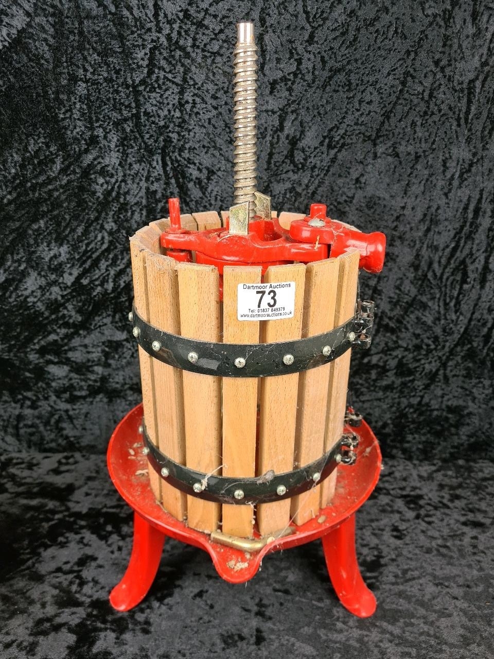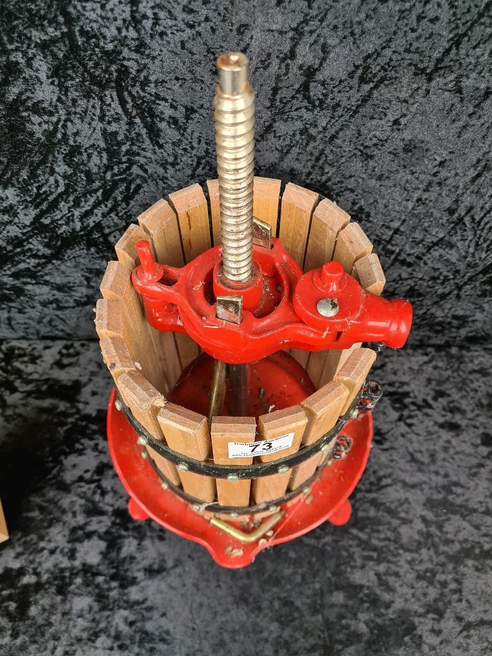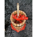 Nice table top wood and painted cast iron fruit and wine press with wooden blocks - missing top handles. Approx H49cm.