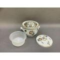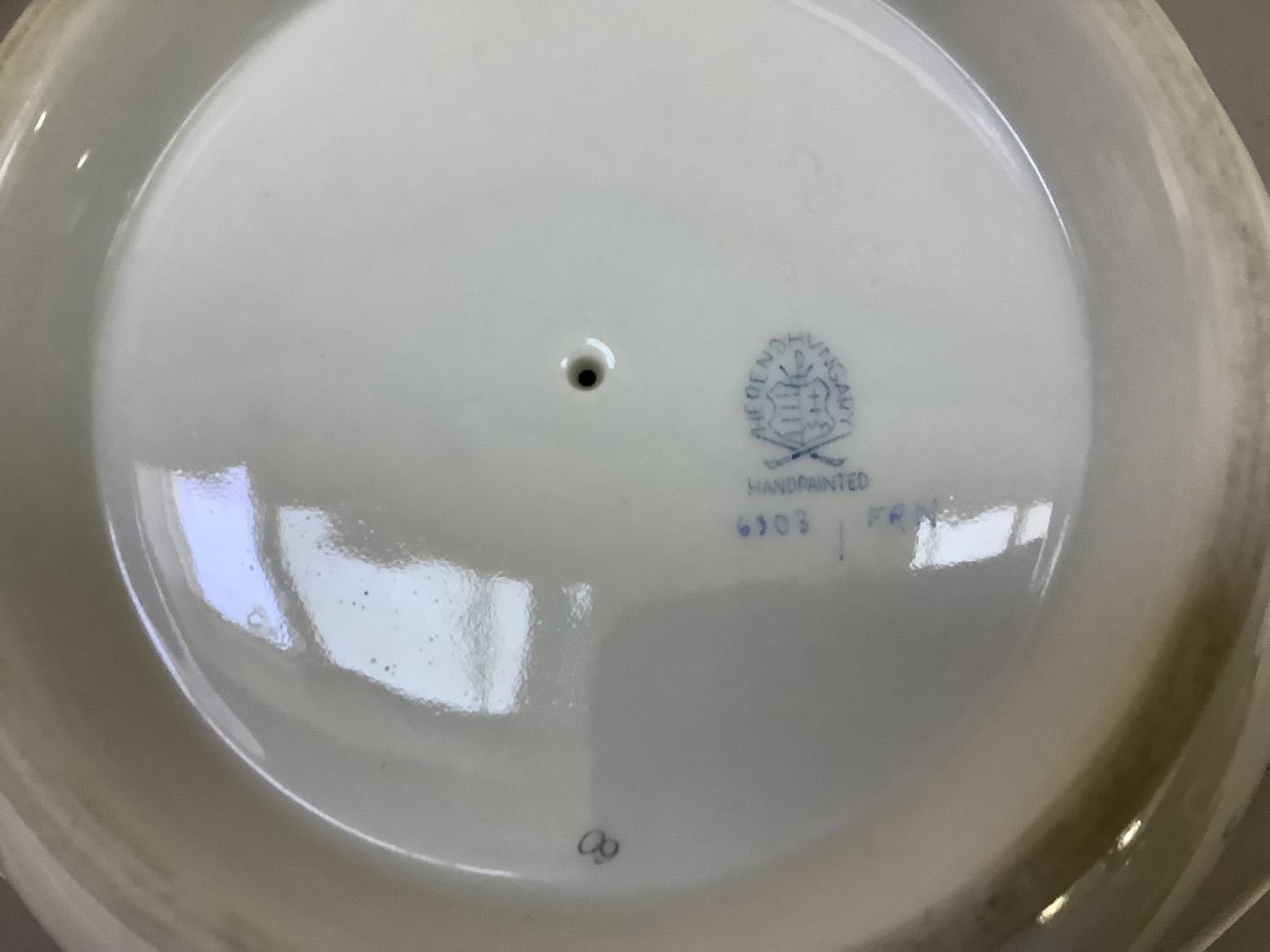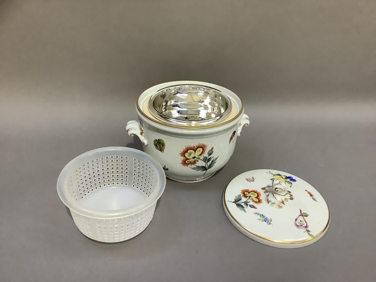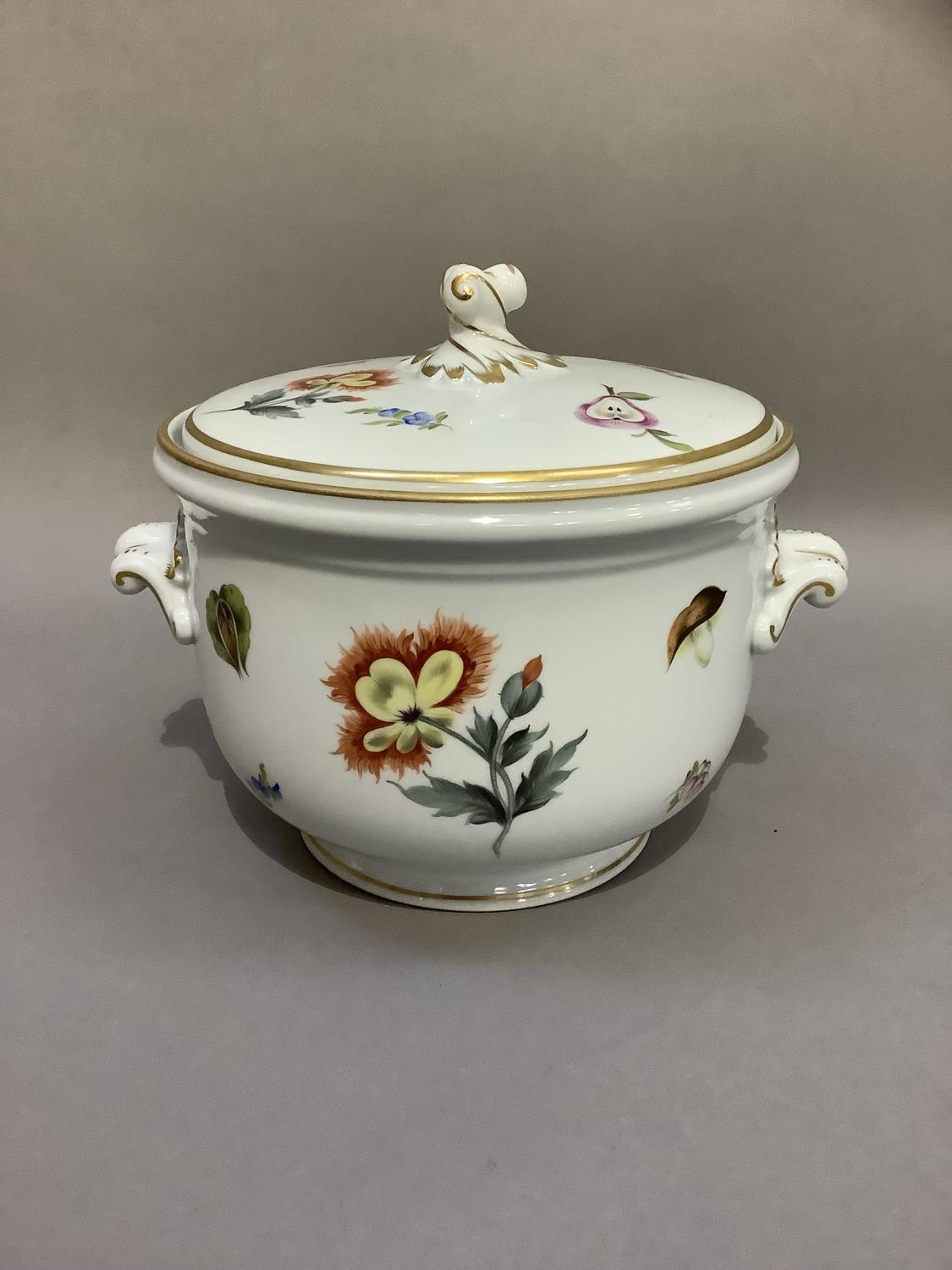 A Herend porcelain ice pail and cover polychrome hand painted with flowers and fruits highlighted in gilt, twin scroll handles and finial, approx 23cm over handles by 18.5cm