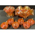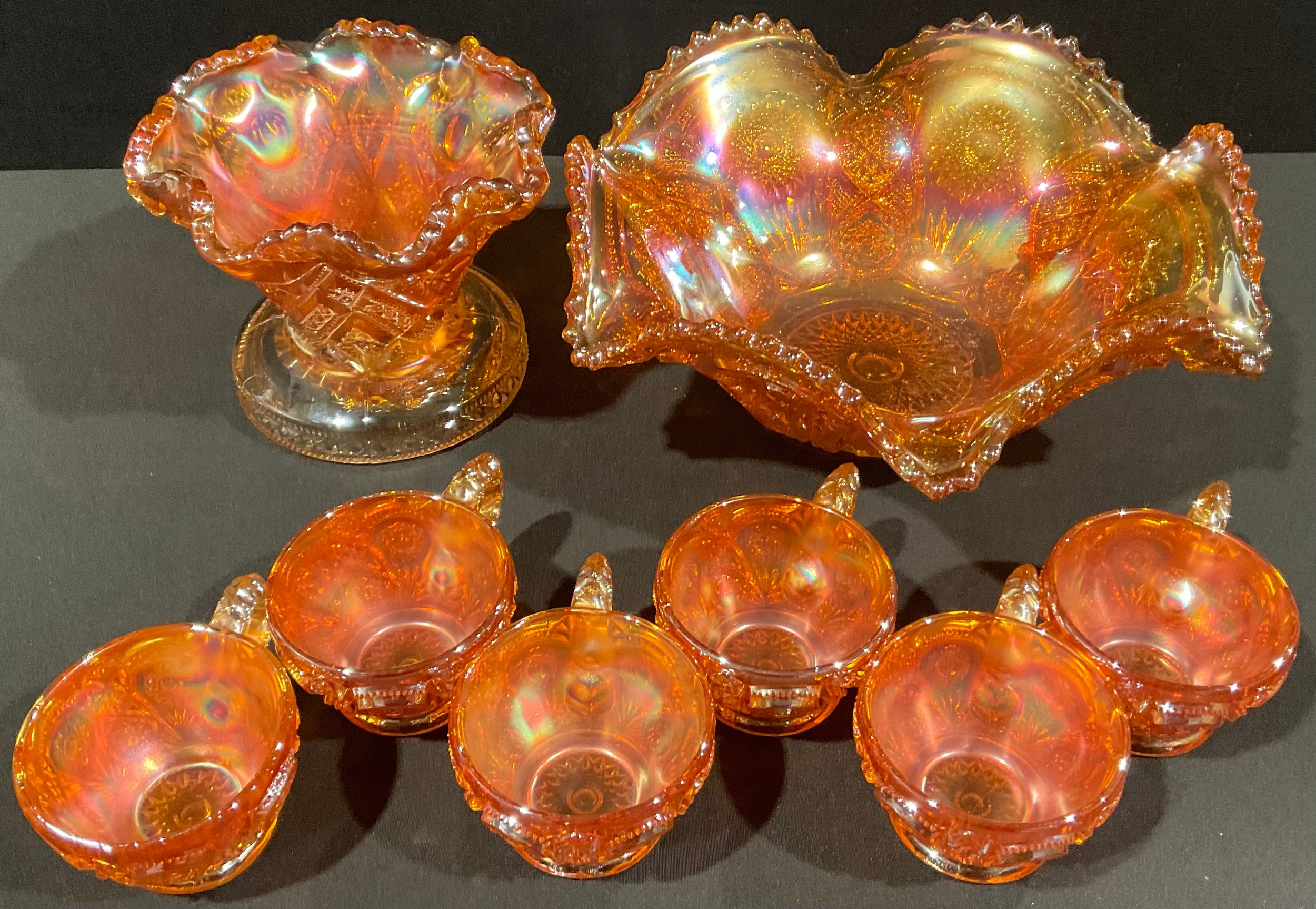 An Imperial Fashion pattern marigold colour carnival glass bowl, vase and cups set