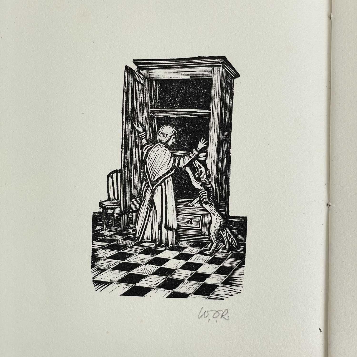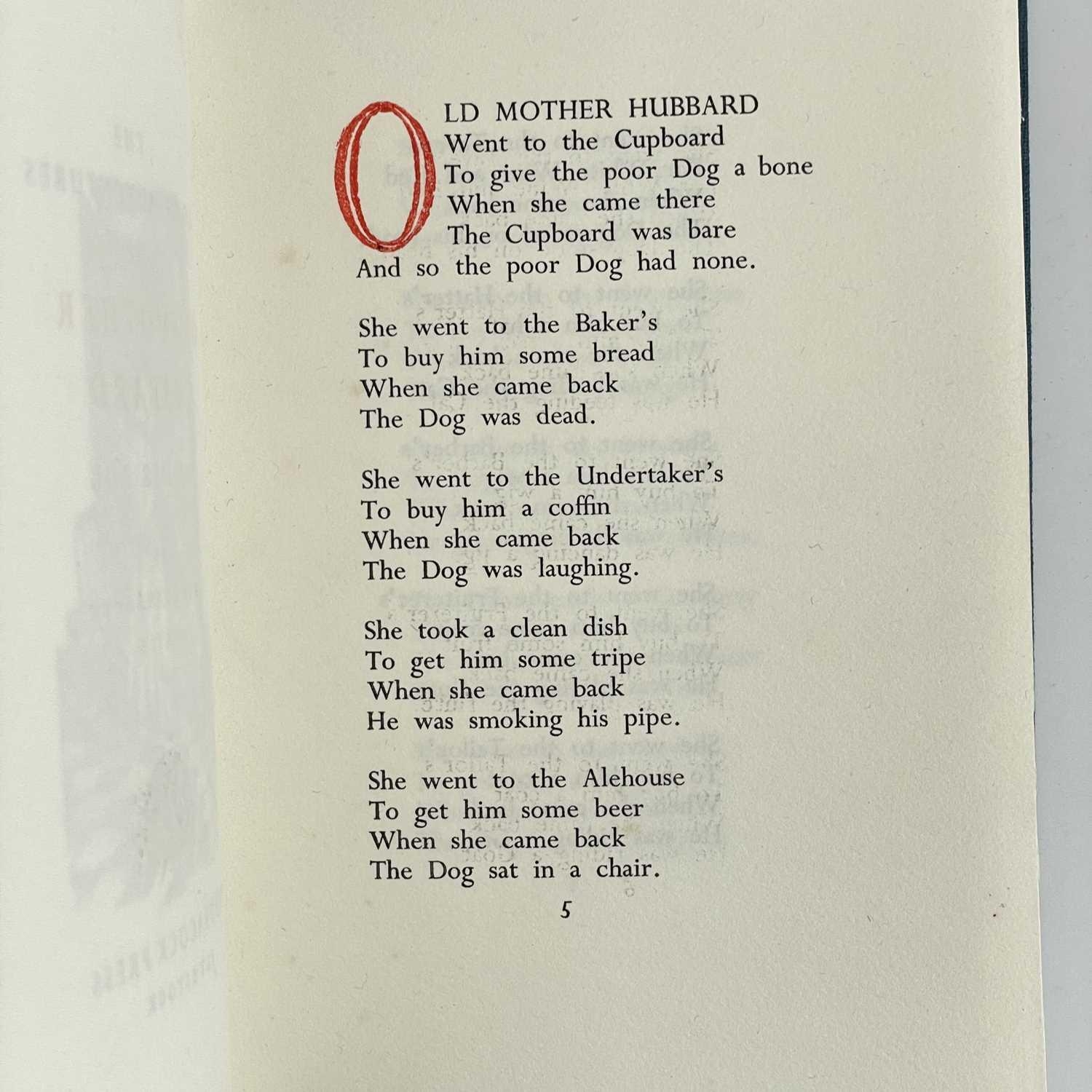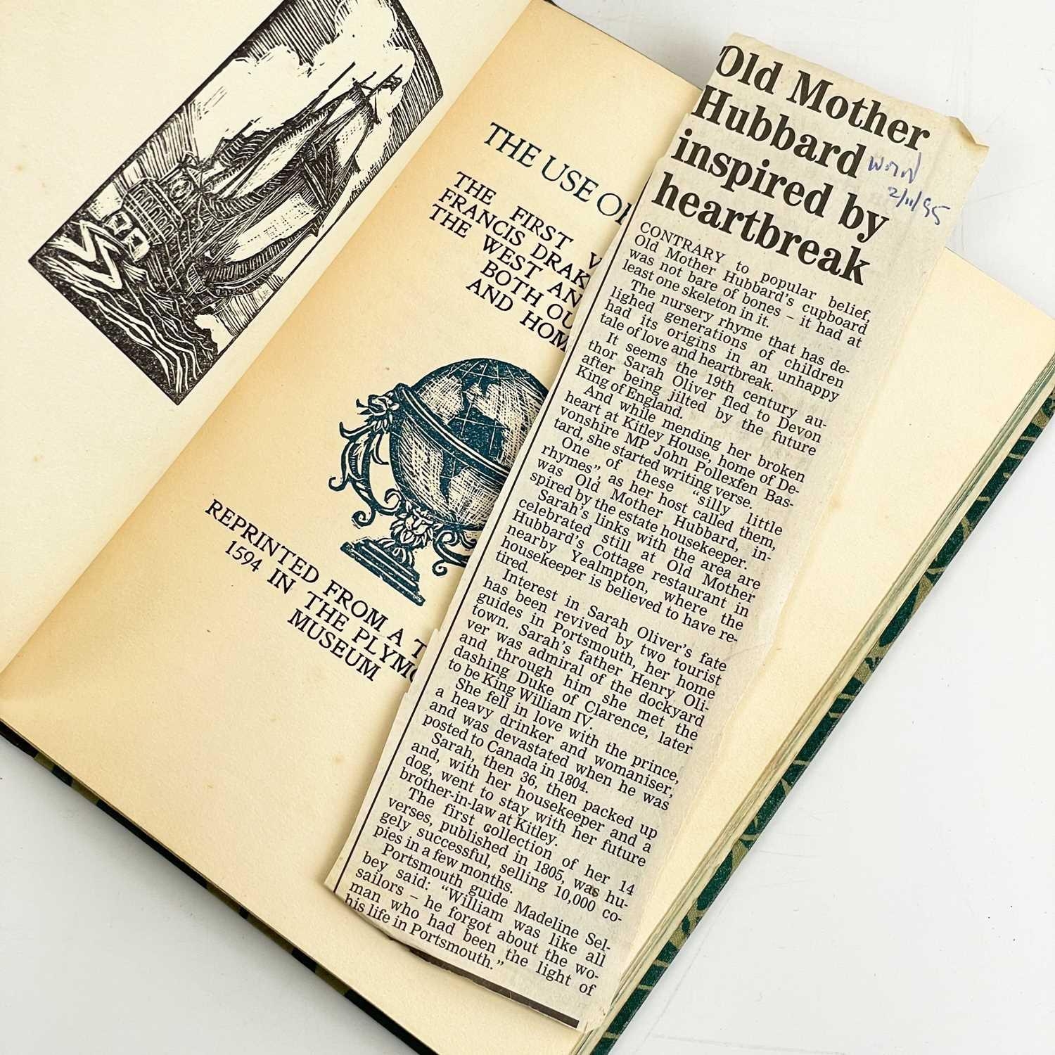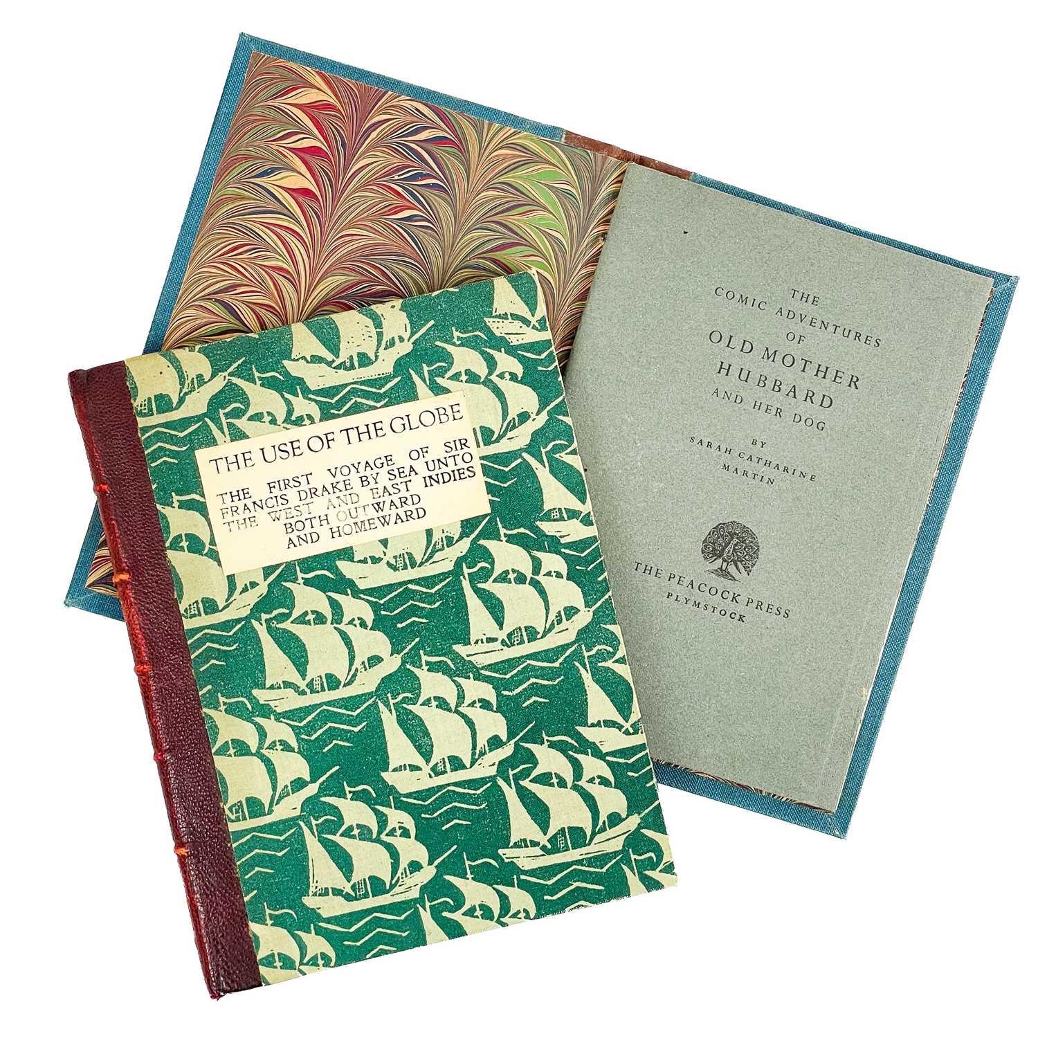 Two private Peacock Press works Old Mother Hubbard & Francis Drake The Comic Adventures of Old Mother Hubbard and her Dog, Sarah Catherine Martin; woodcut frontis and vignette woodcut to final page; limited edition of 120 copies printed by W. O. Reynolds at the Peacock Press, Plymstock, Devon and completed on the 28th of December 1951. This is number two. Numbers one to six were printed on Whatman handmade paper. The Use of the Globe: the first voyage of Sir Francis Drake by sea unto the West and East Indies both outward and Homeward; Reynolds, W. O. (Printer); Published by Peacock Press, Plymstock, Devon, 1942; reprinted from a tract of 1594 in the Plymouth Museum; woodcut frontis and capital pieces. End paper reads: 120 copies have been set and printed by W. O. Reynolds at the Peacock Press, Plymstock, Devon and completed on the first day of November, 1942. The text has been taken from a mercator tract printed by John Windet in 1594 being the first published account of a Sir Francis Drake's voyage around the world. This is number 98.