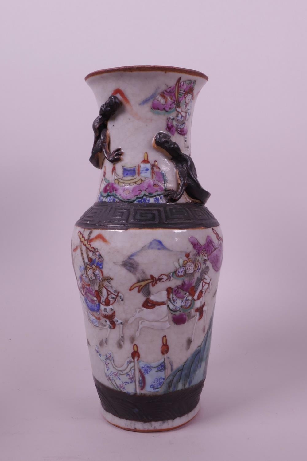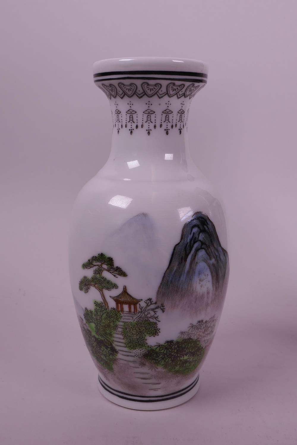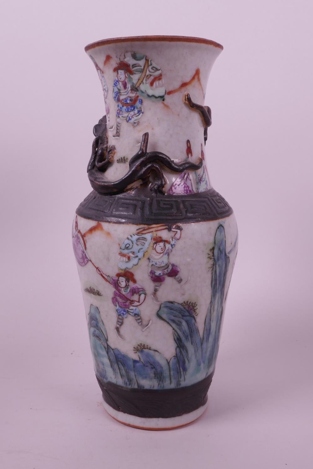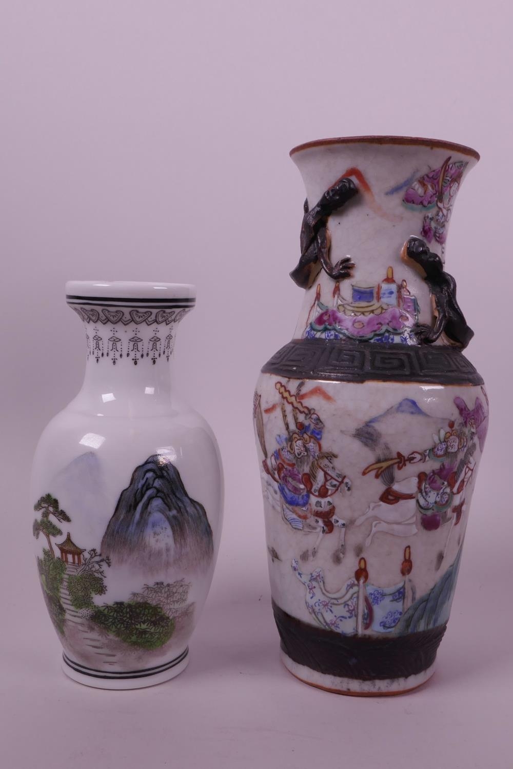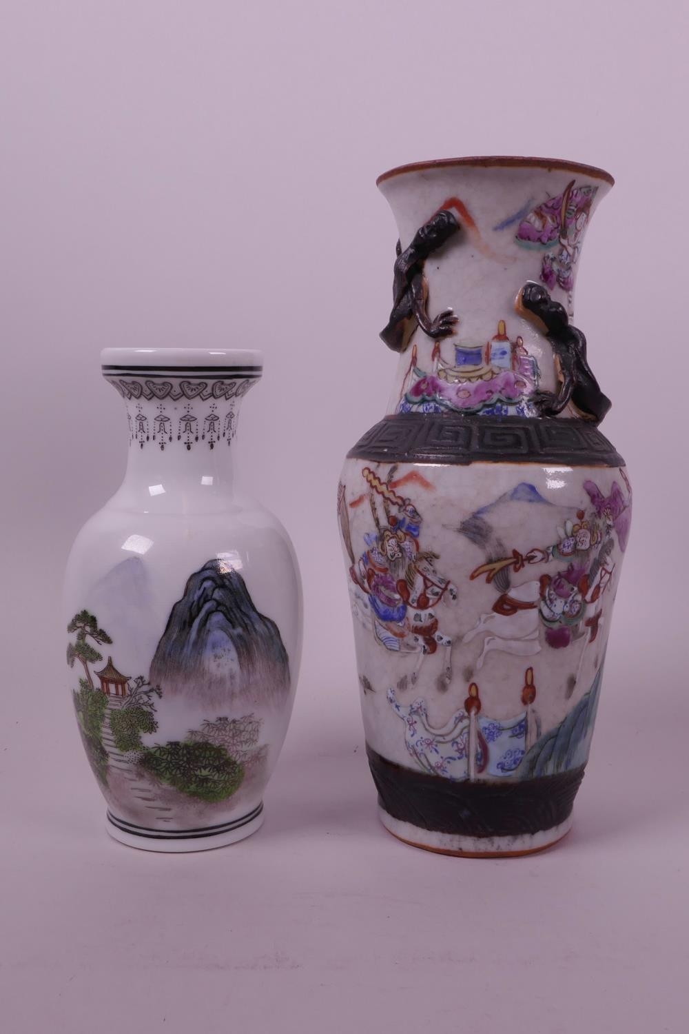A small Chinese Republic porcelain vase decorated with a famille verte enamel landscape, together with a crackle ground vase decorated with warriors on horseback, largest 7½" high, marks to base