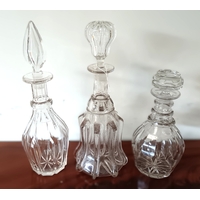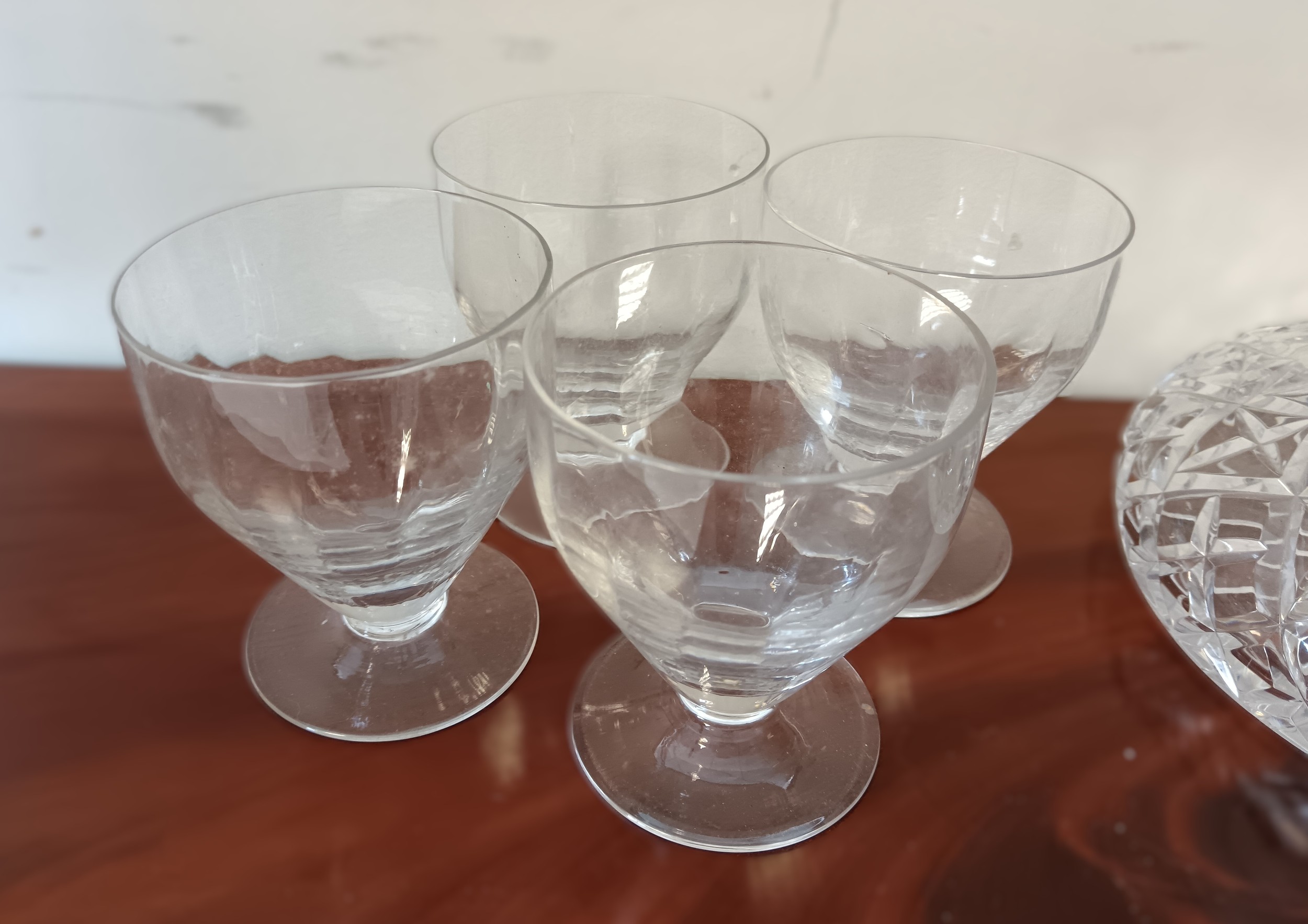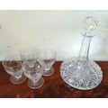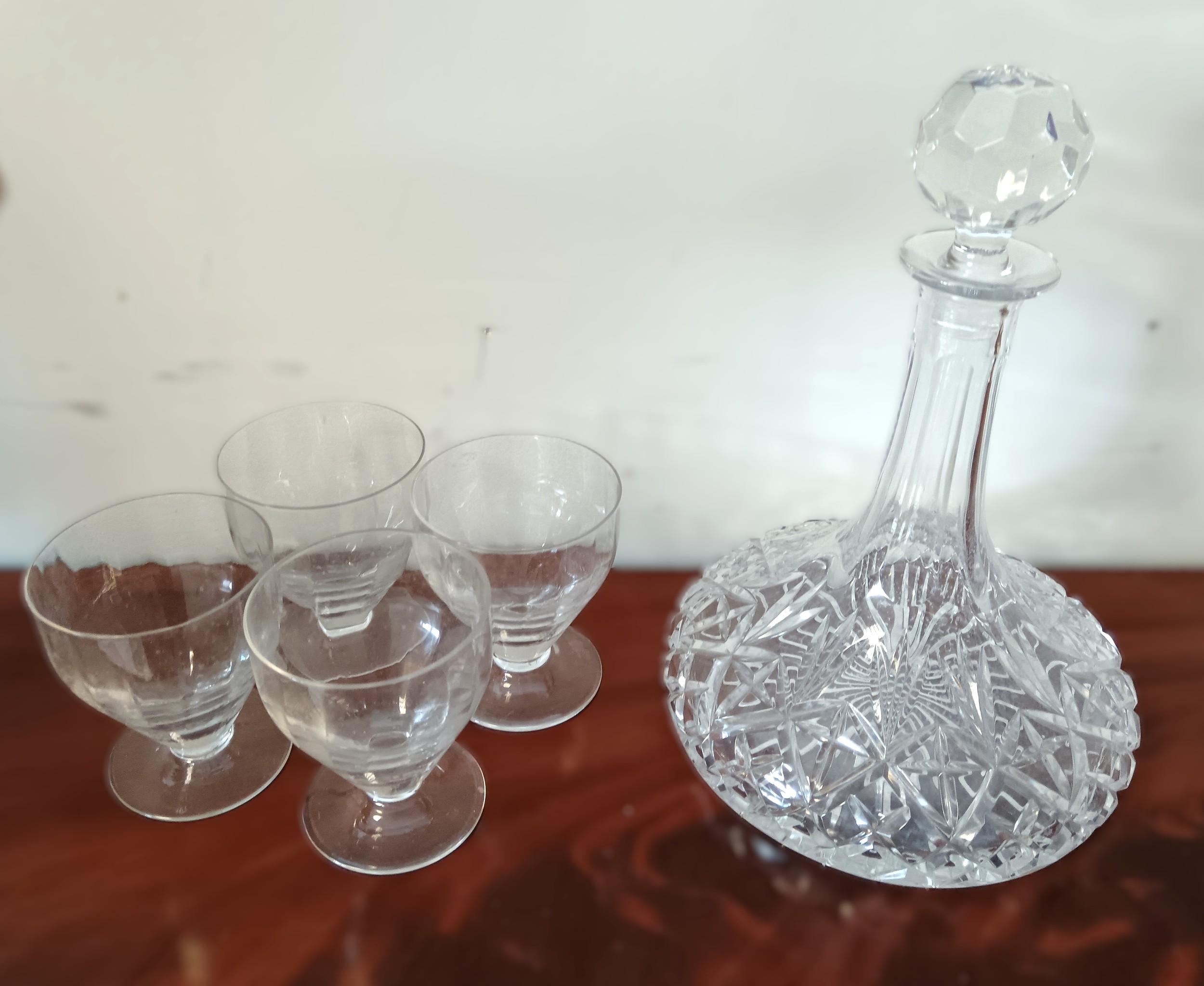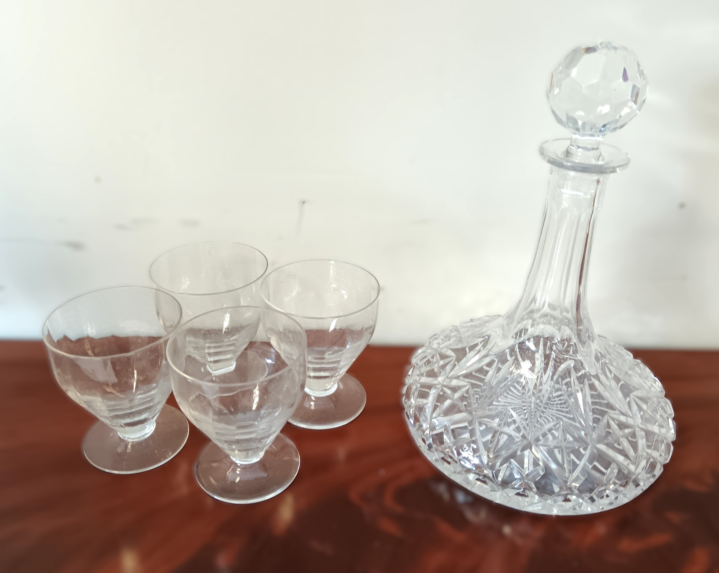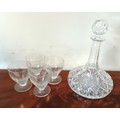 A set of four 19th century glasses, together with a decanter, each with cut detail and faceted decoration
