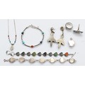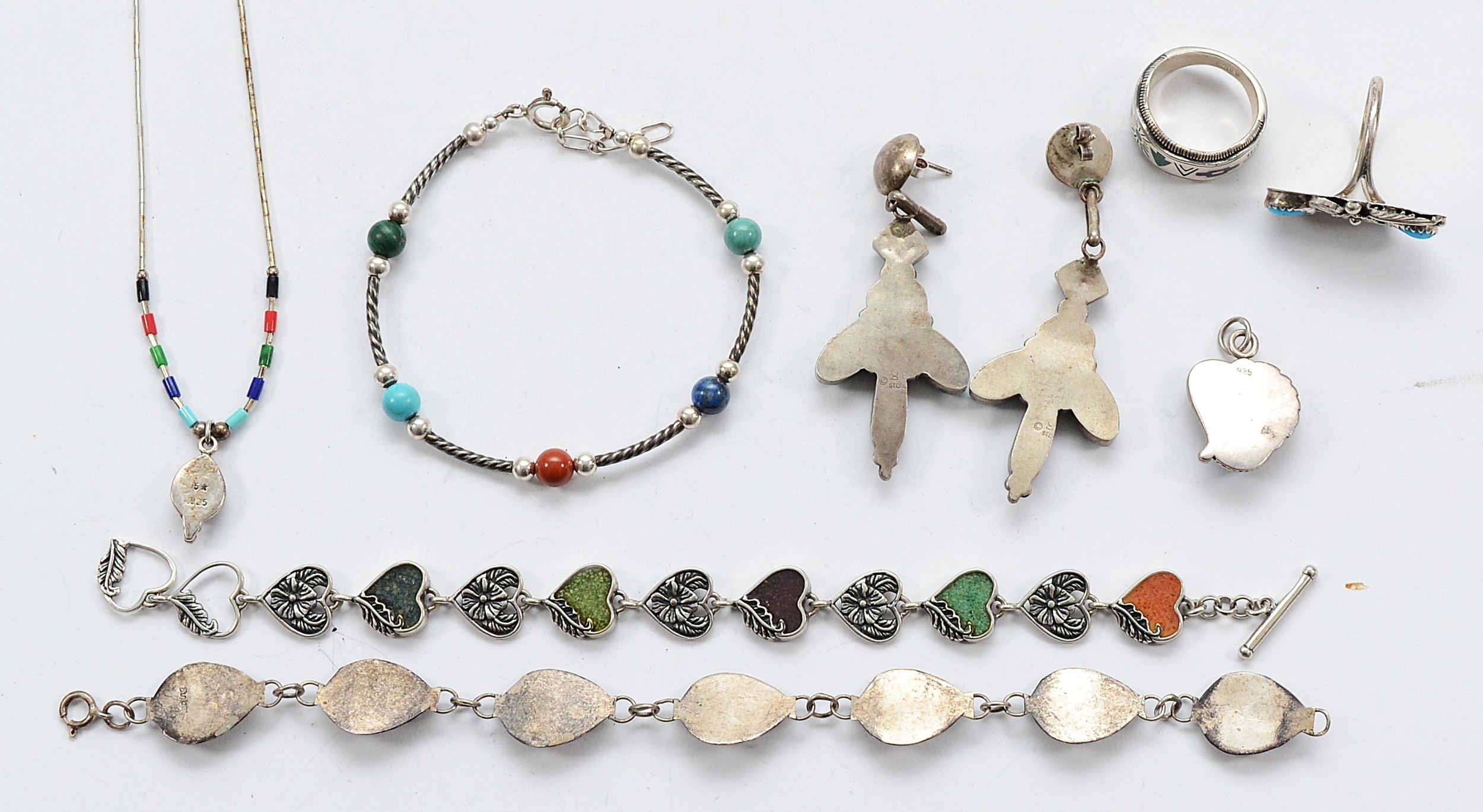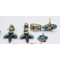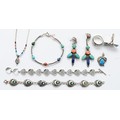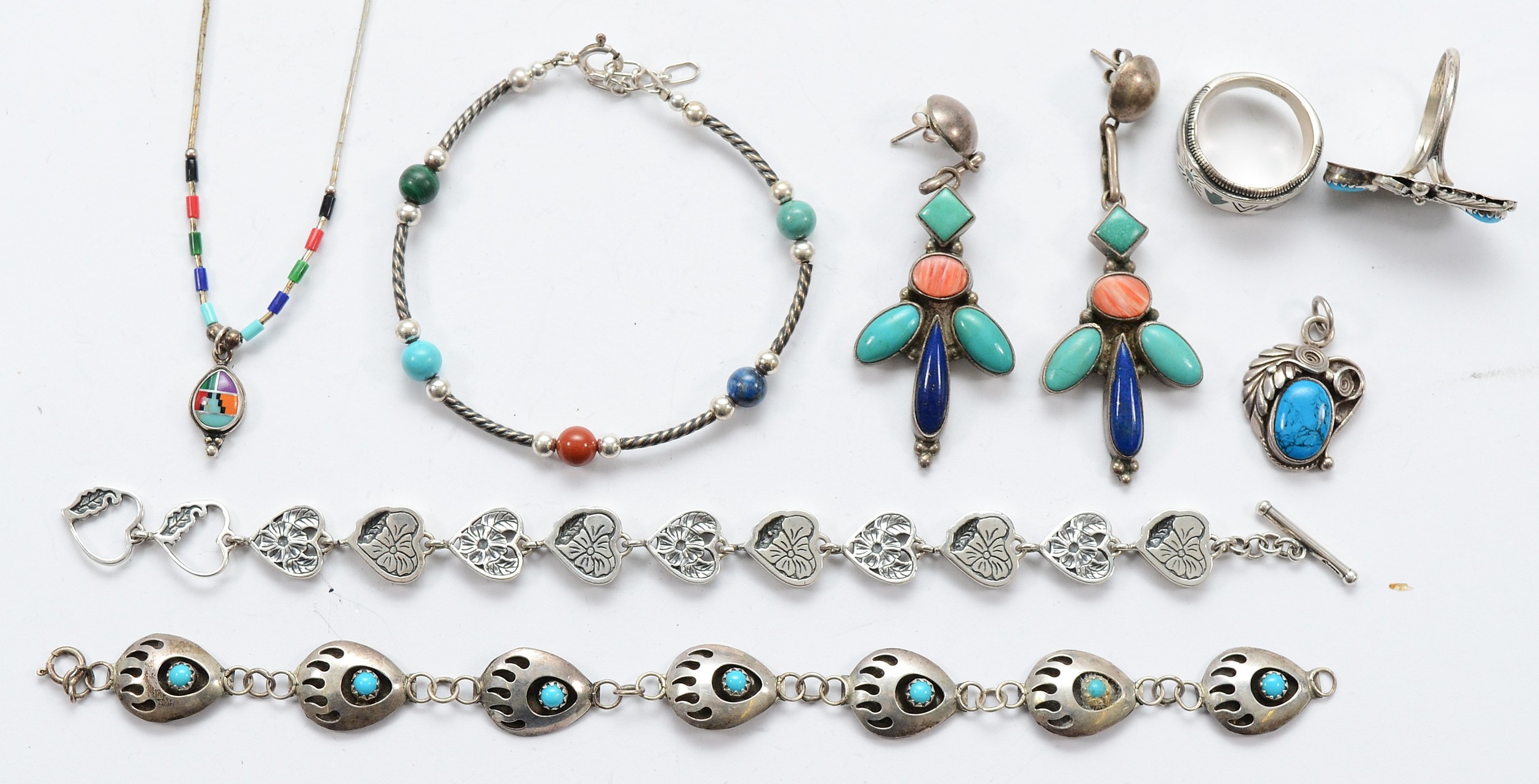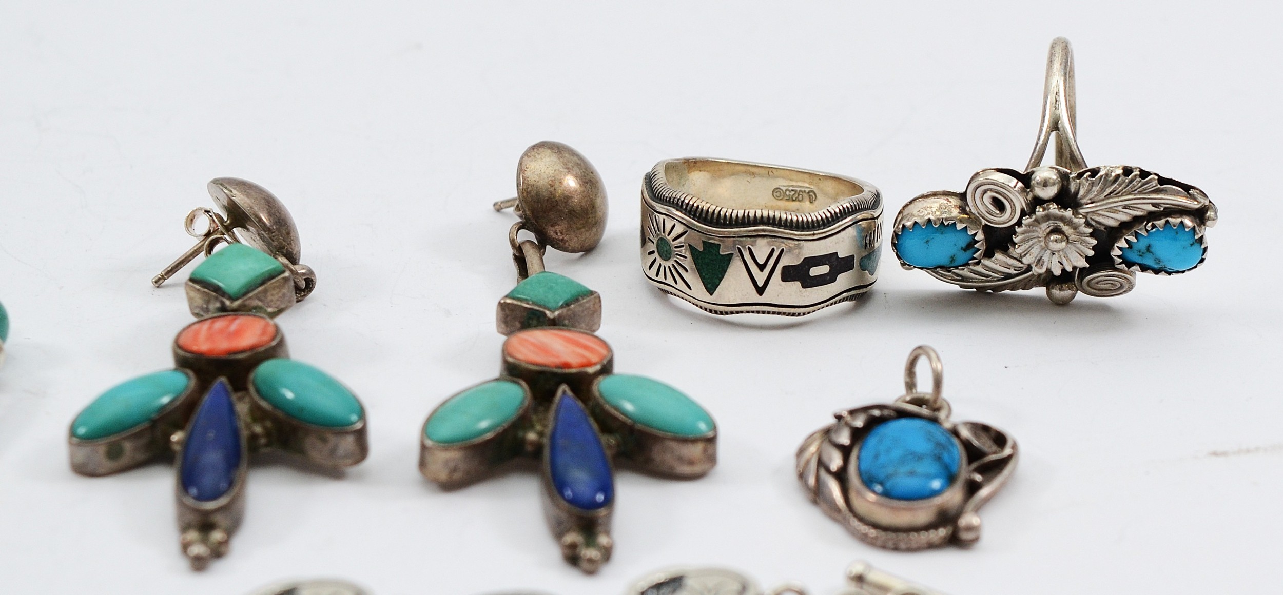 Three 925 silver turquoise bracelets, a silver beaded necklace, a pair of silver turquoise drop earrings, a 925 silver turquoise pendant and two 925 silver rings, O-S, 66g