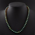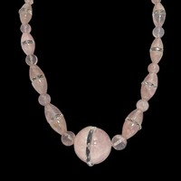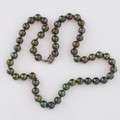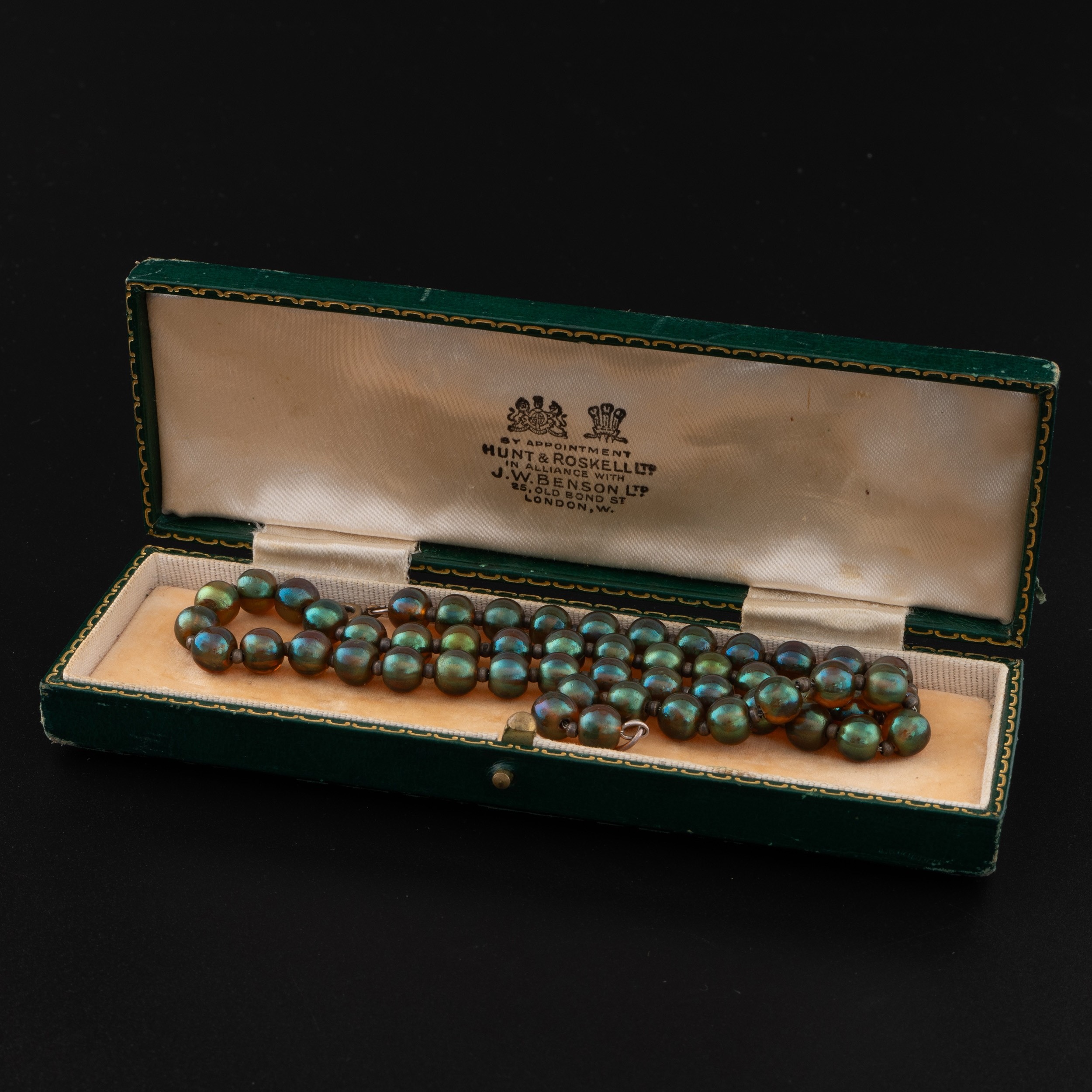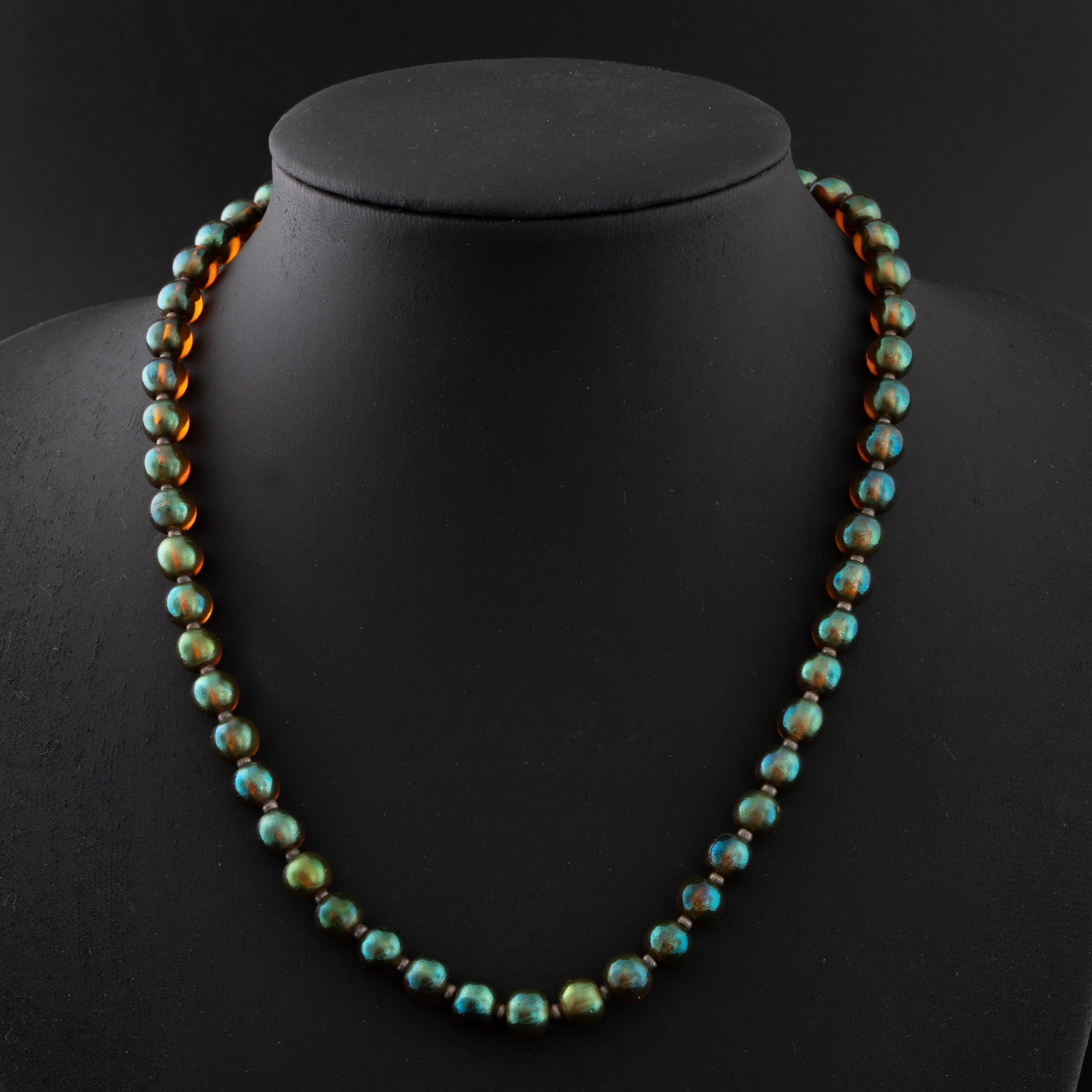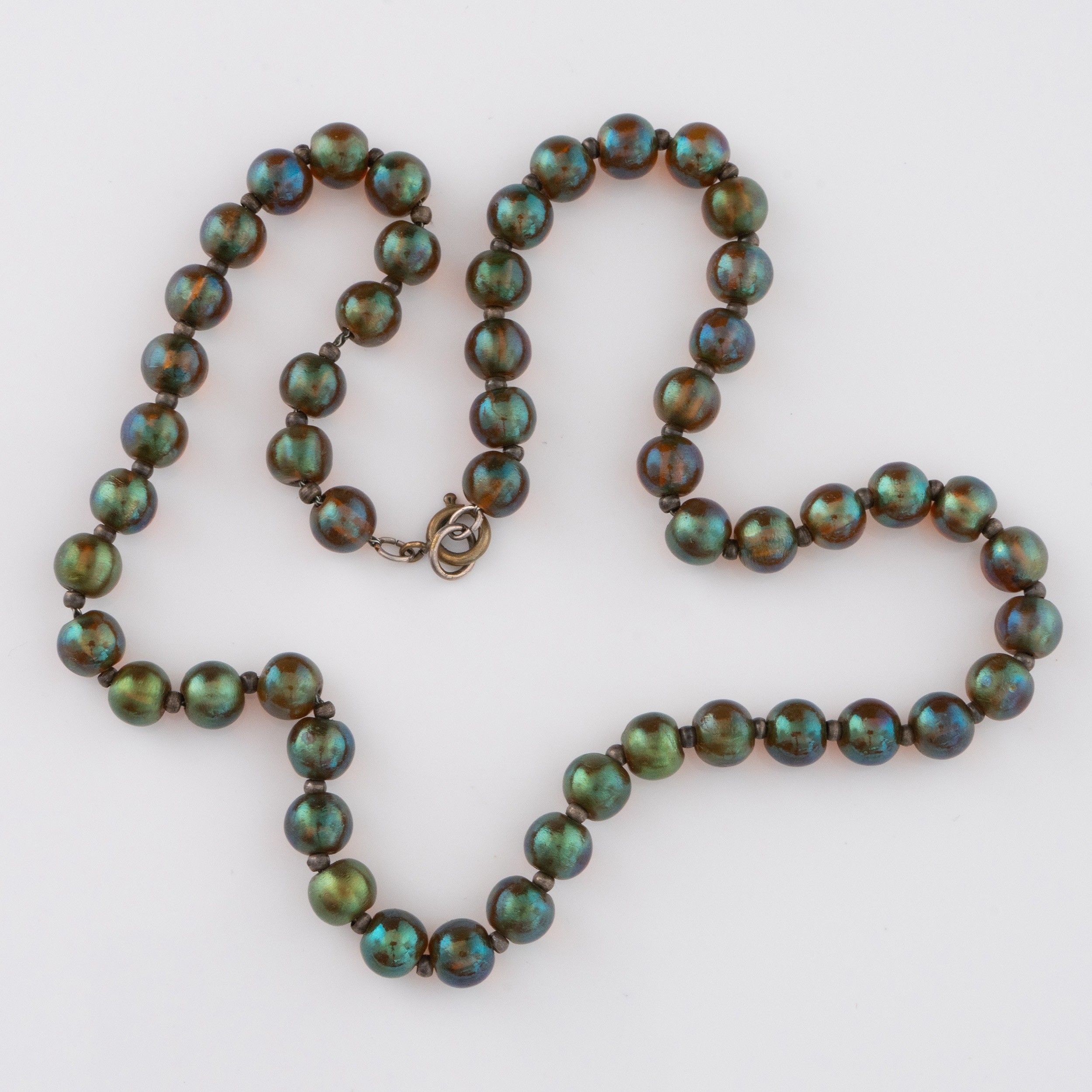 A 1930s German WMF 'Myra-Krystall' necklace, designed by Karl Weidmann 1926, decorated with iridescent beads in green and purple tones separated by small metal spacers, 44cm total length, together with a Hunt & Roskell box (LDC14256)