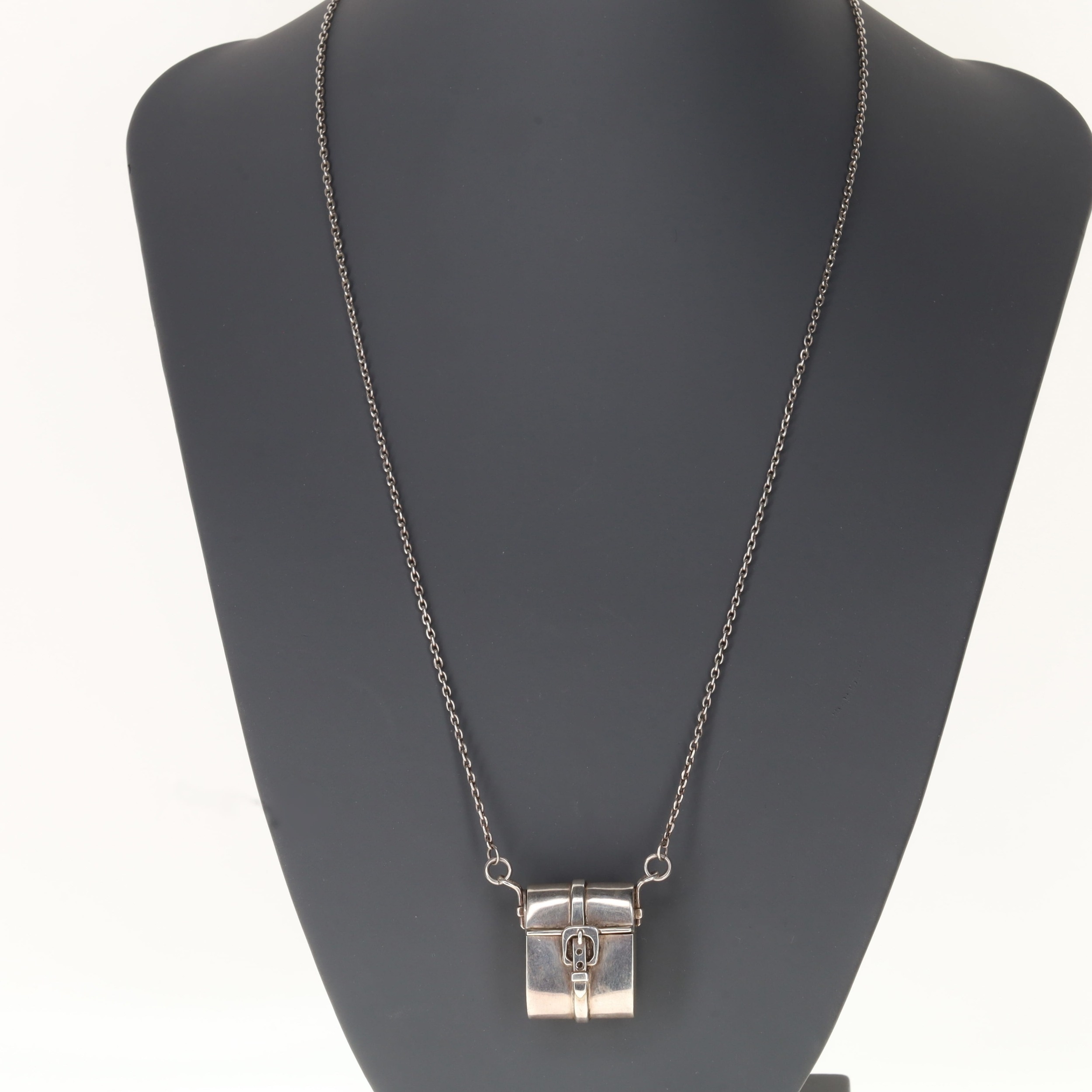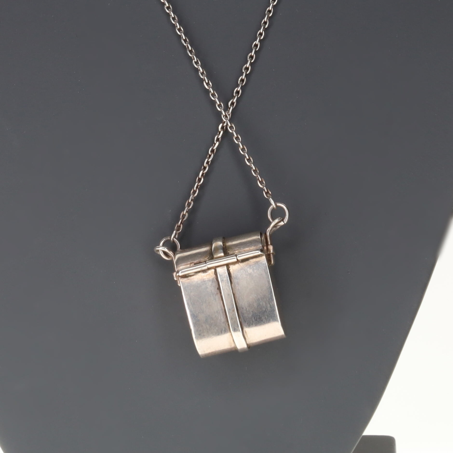 Silver Novelty Satchel Keepsake Pendant Necklace. This necklace has been tested as sterling silver. Clasp and closures are in working order and there is minimal surface wear. Chain measures approx. 49cm, pendant measures approx. 2.3 x 1.9cm. Weighs in total 10g.