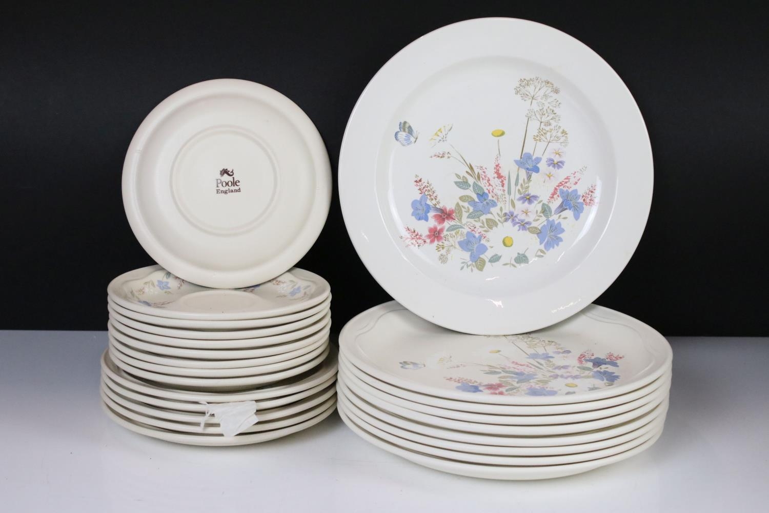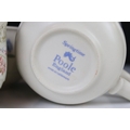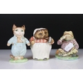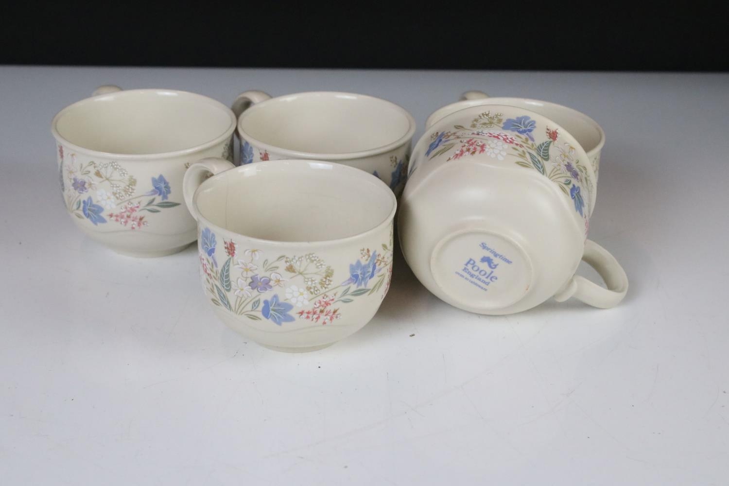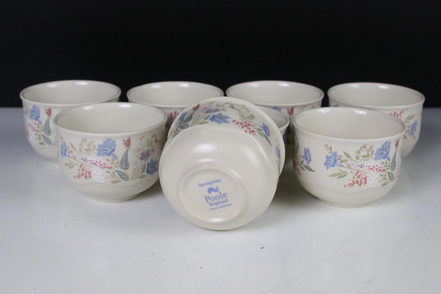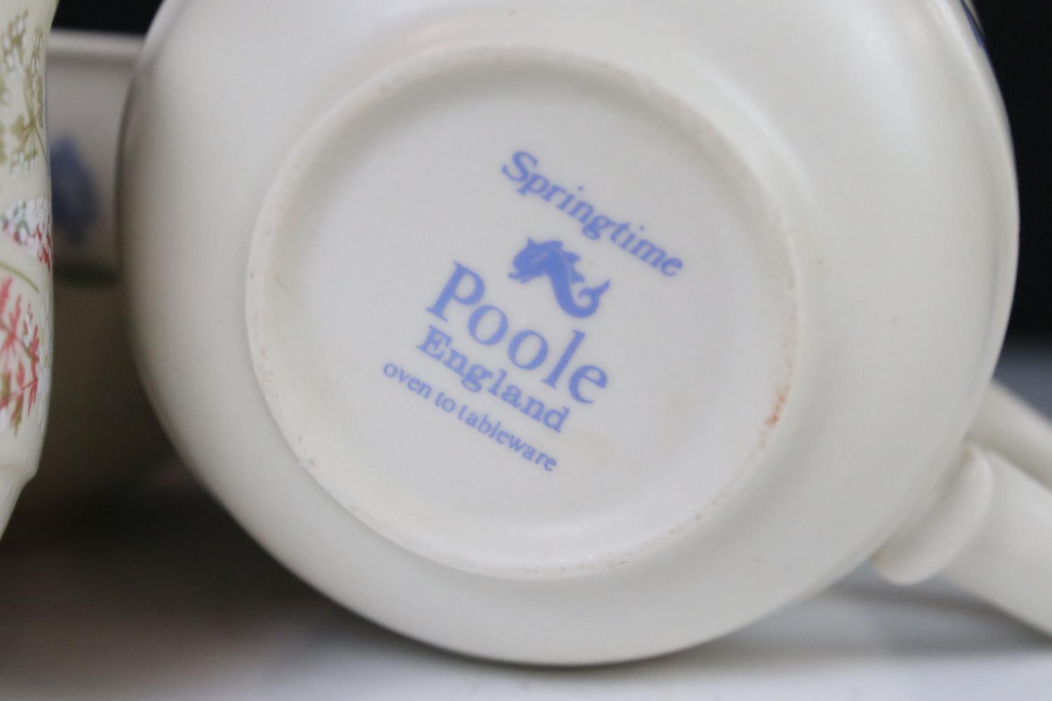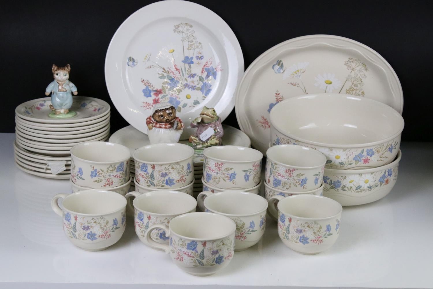 Poole Pottery ' Springtime ' ware comprising 5 Tea Cups, 9 saucers, 5 tea plates, 9 breakfast plates, 8 sugar bowls, 2 serving bowls and a sandwich plate together with Three Beswick Beatrix Potter Figures being Tom Kitten, Mr Jeremy Fisher and Mrs Tiggy Winkle plus a Tiffany style Light Shade