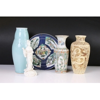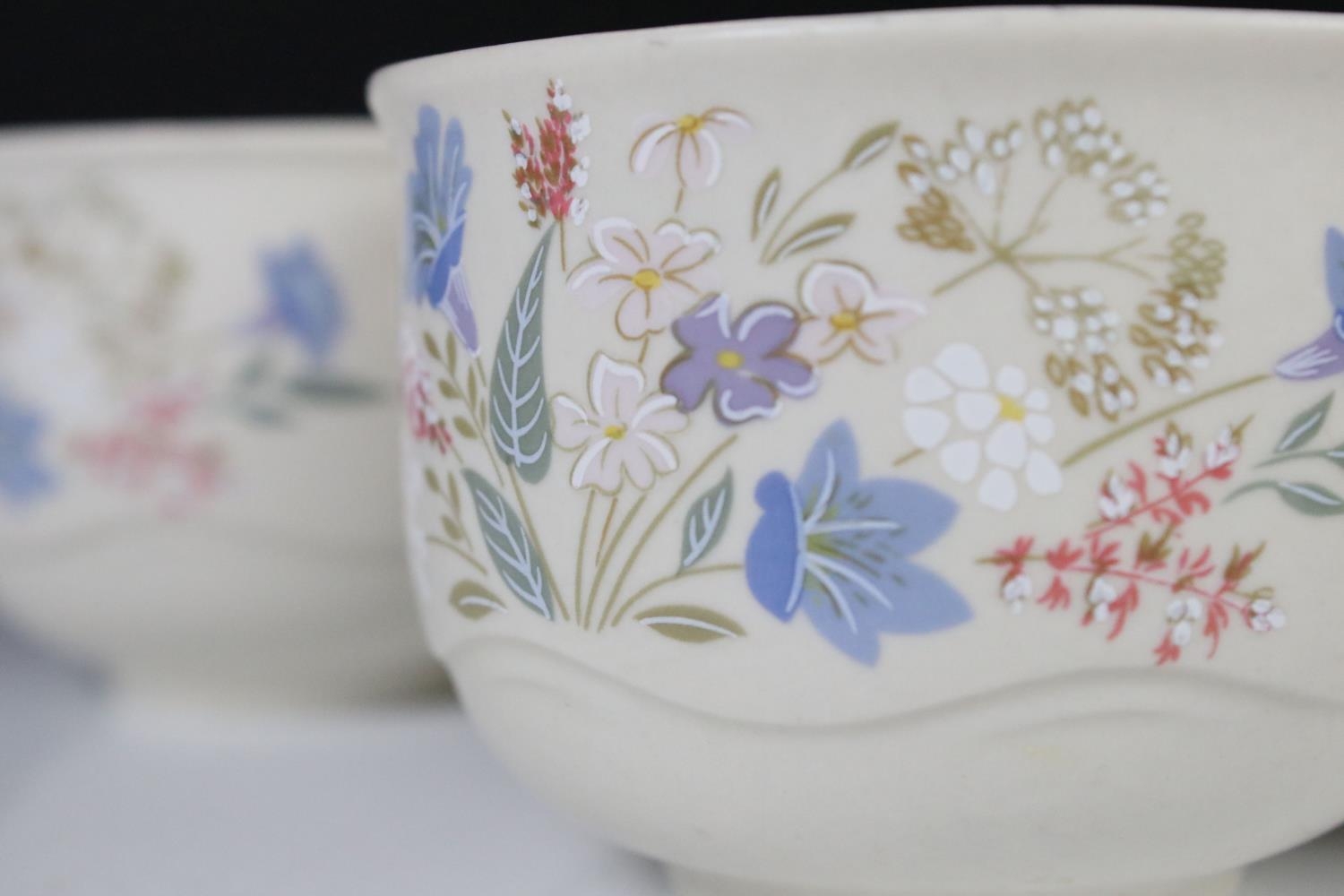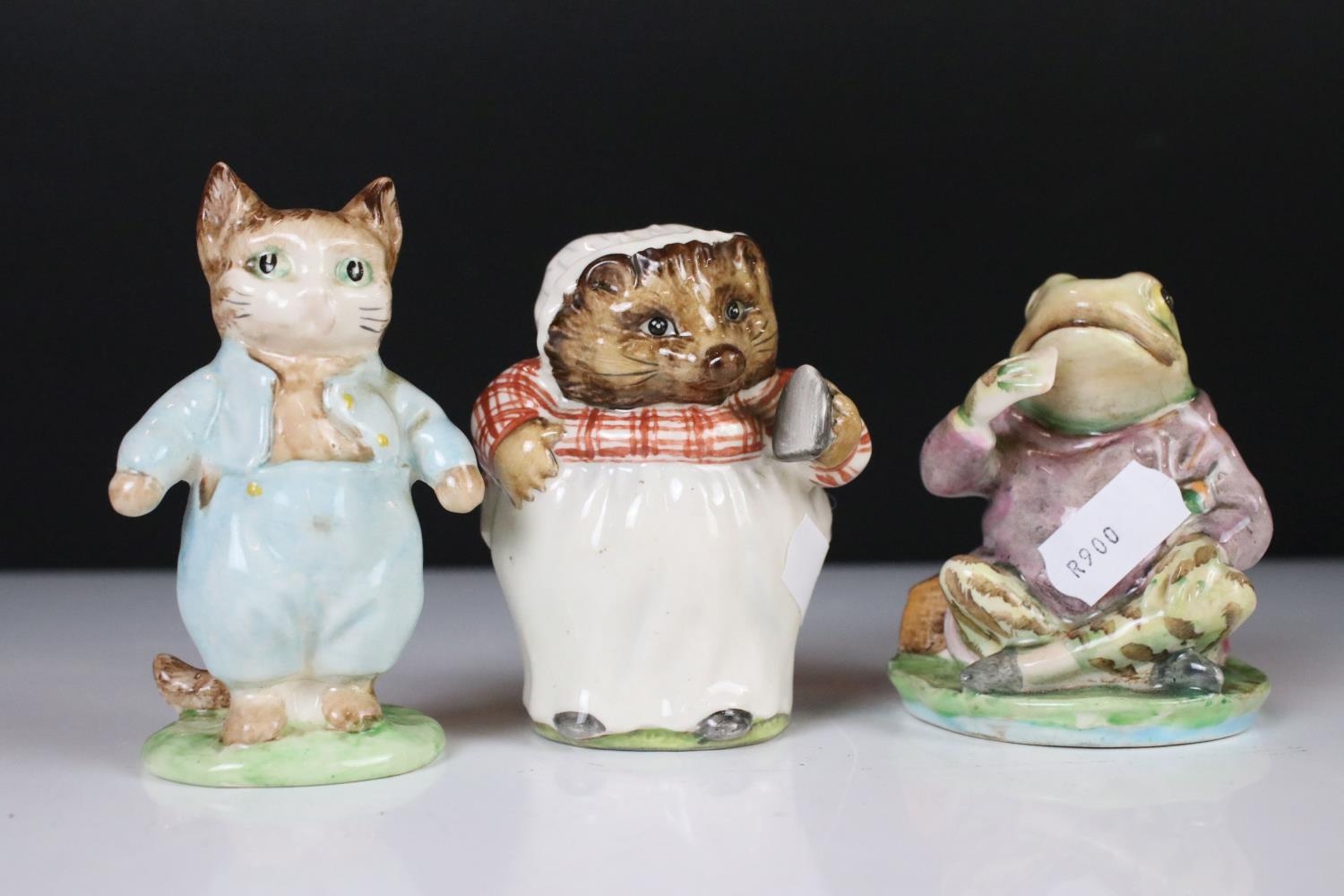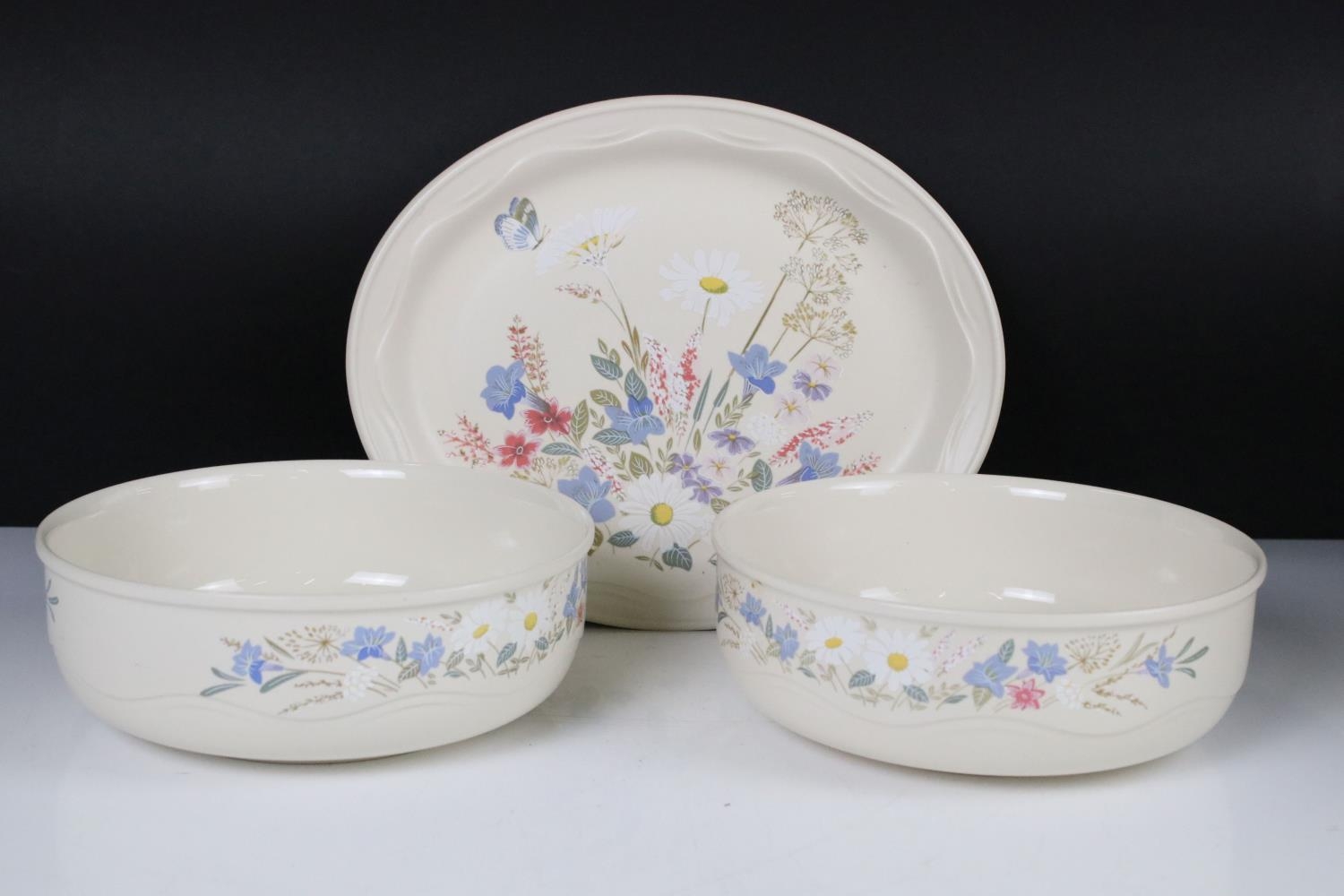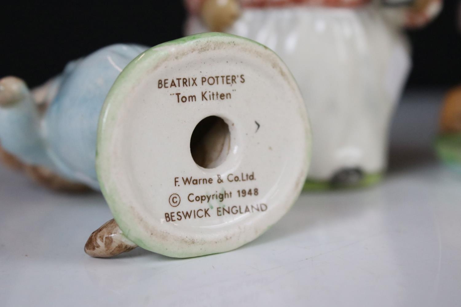 Poole Pottery ' Springtime ' ware comprising 5 Tea Cups, 9 saucers, 5 tea plates, 9 breakfast plates, 8 sugar bowls, 2 serving bowls and a sandwich plate together with Three Beswick Beatrix Potter Figures being Tom Kitten, Mr Jeremy Fisher and Mrs Tiggy Winkle plus a Tiffany style Light Shade