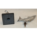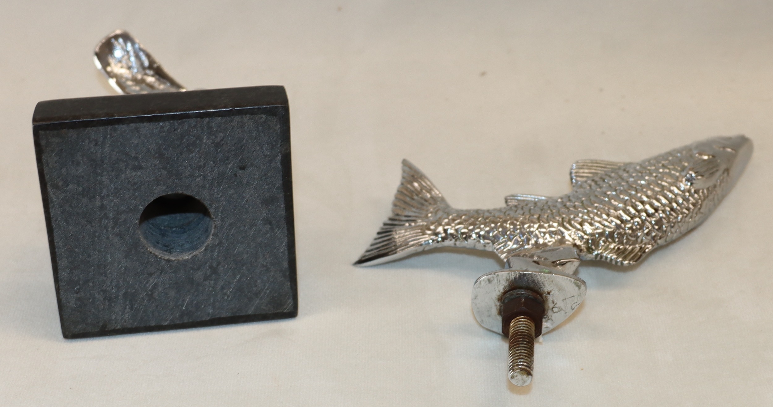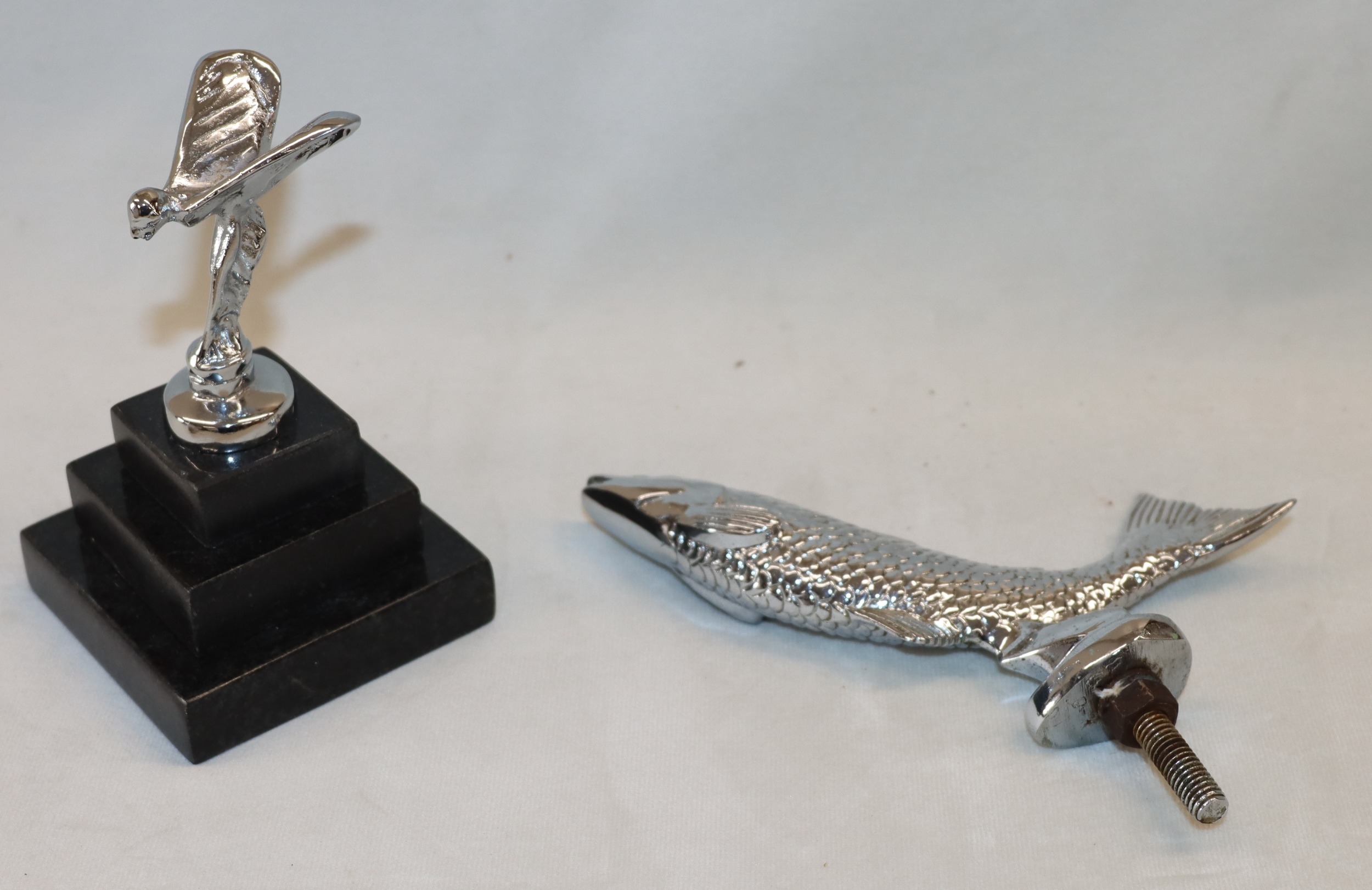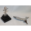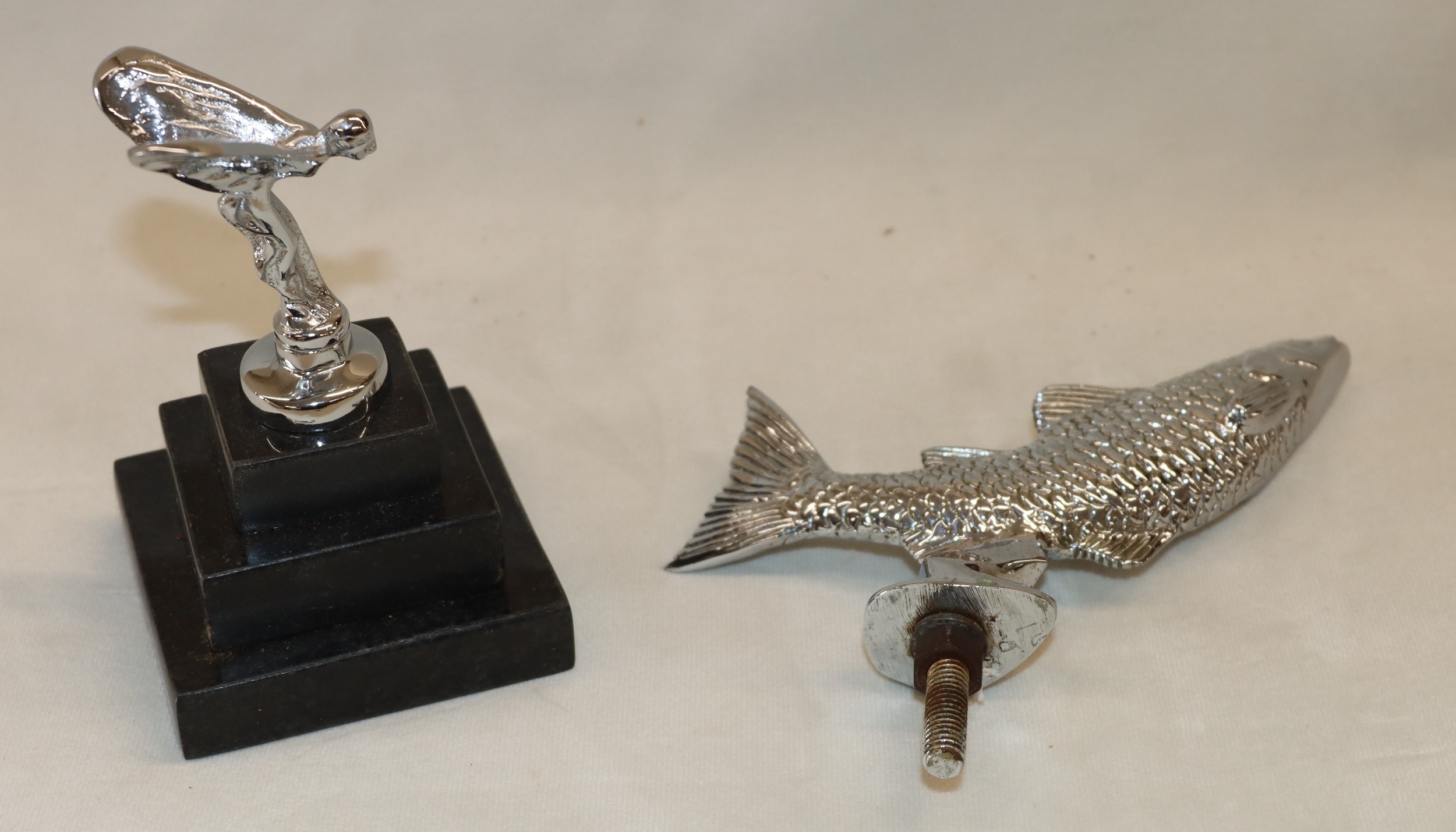 A Rolls Royce mascot on marble base, 12.5cm high and a leaping salmon bonnet mascot, 16cm long. (2)