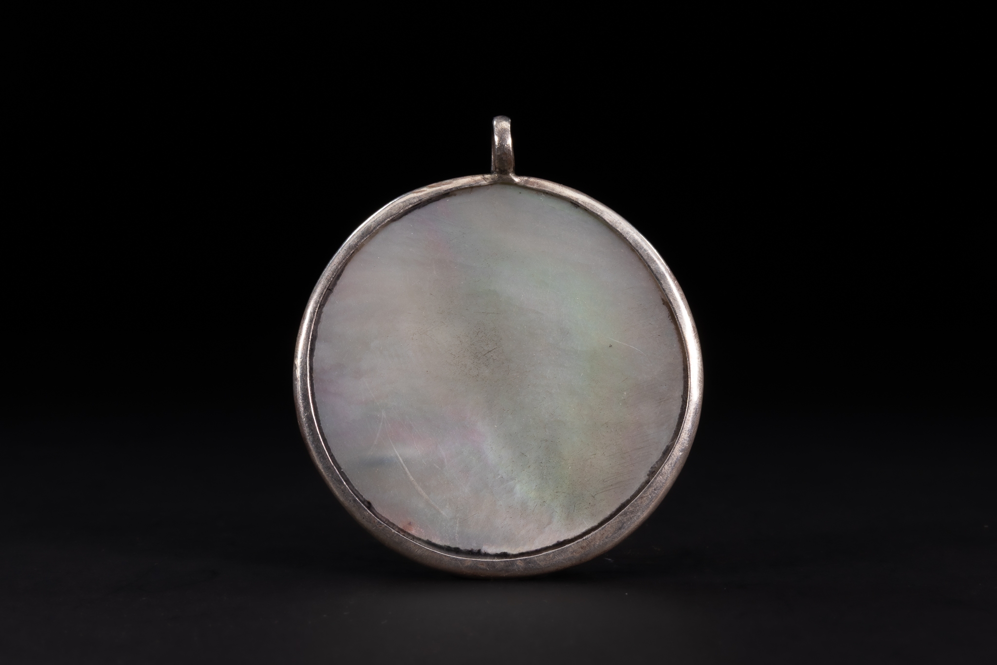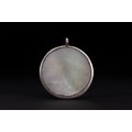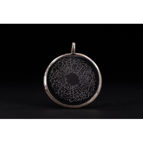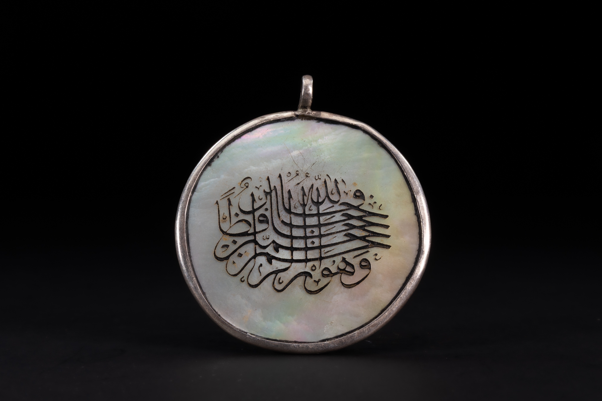 A circular amulet pendant carved from iridescent mother-of-pearl and set within a silver mount with a single suspension loop. One face is engraved with flowing Arabic calligraphy arranged in a compact, emblematic composition, the darkened lines standing in contrast against the luminous surface of the shell. The inscription is devotional in nature, executed in a stylised calligraphic form.