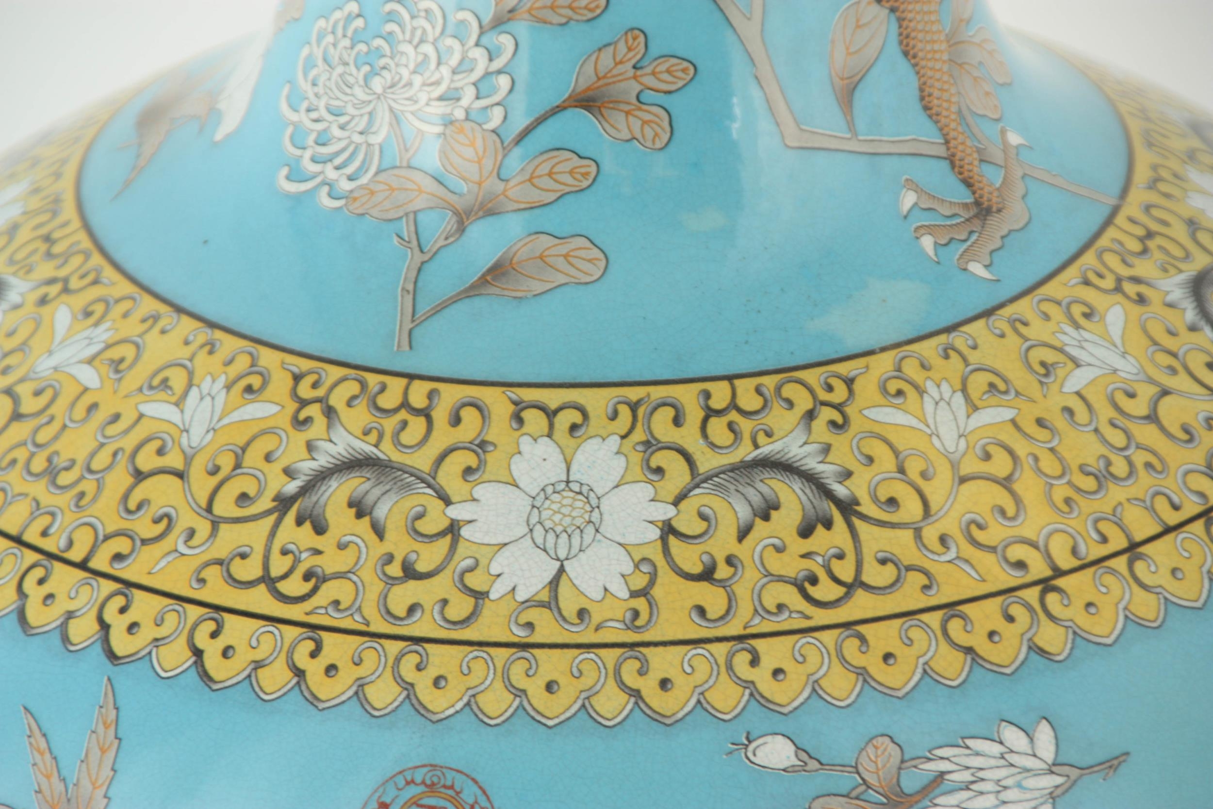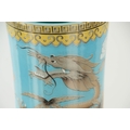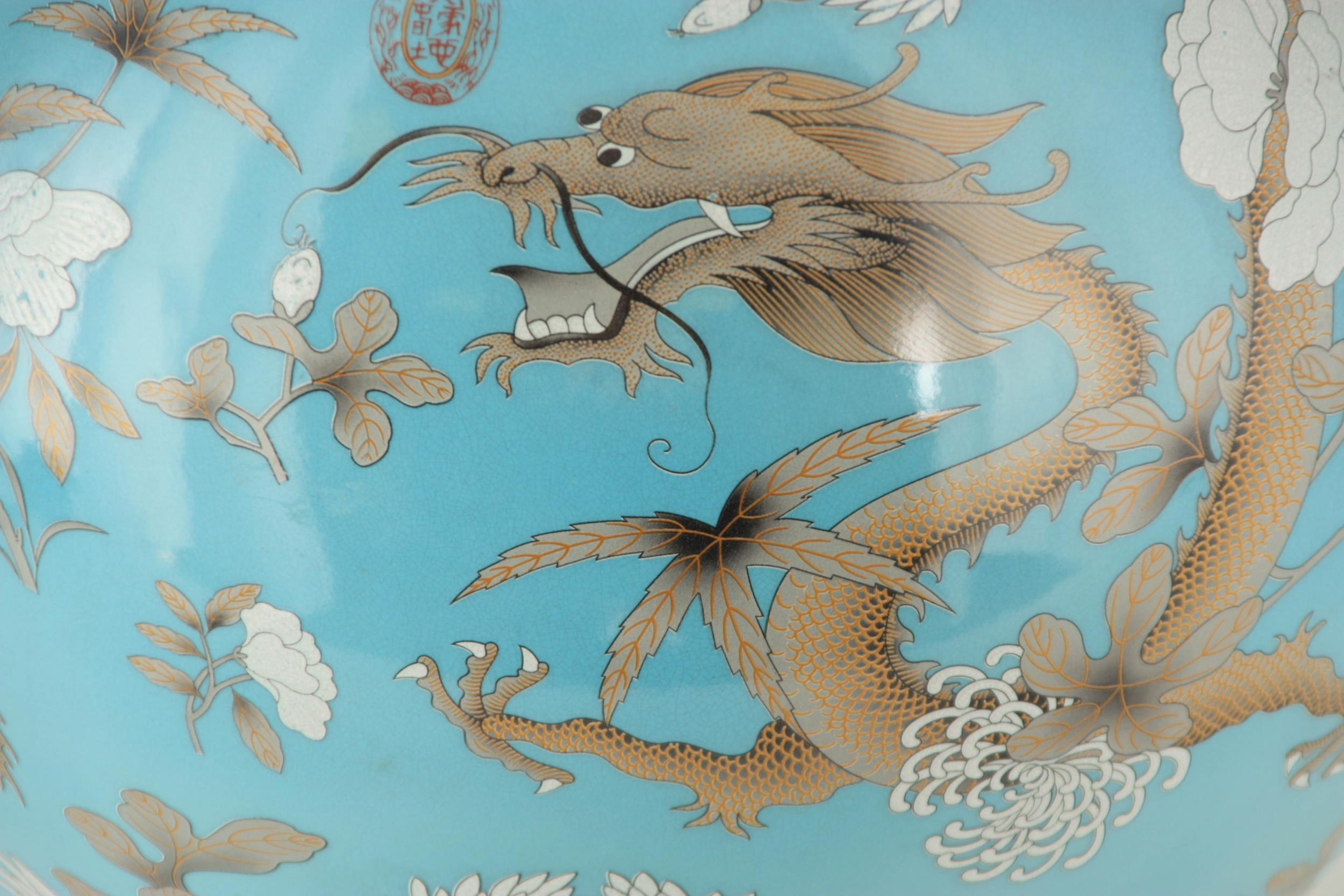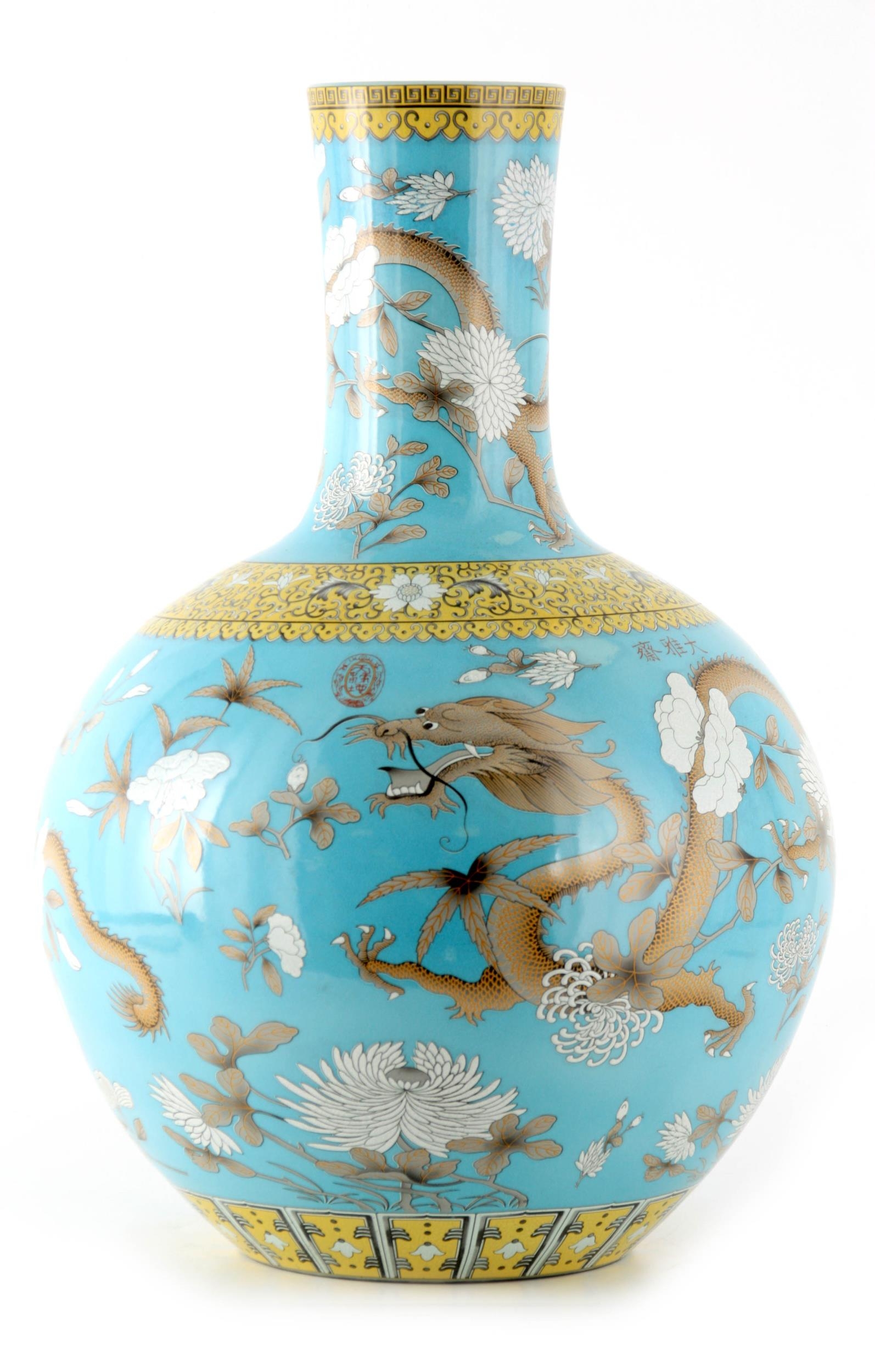 A MASSIVE 20TH CENTURY CHINESE BULBOUS VASE WITH SLENDER NECK pale blue ground with scrolled leaf decorated pale yellow collar, foot band and rim; the body and neck with enamelled white flowerhead and leaf decoration within cavorting dragons. (53cm high)