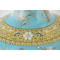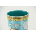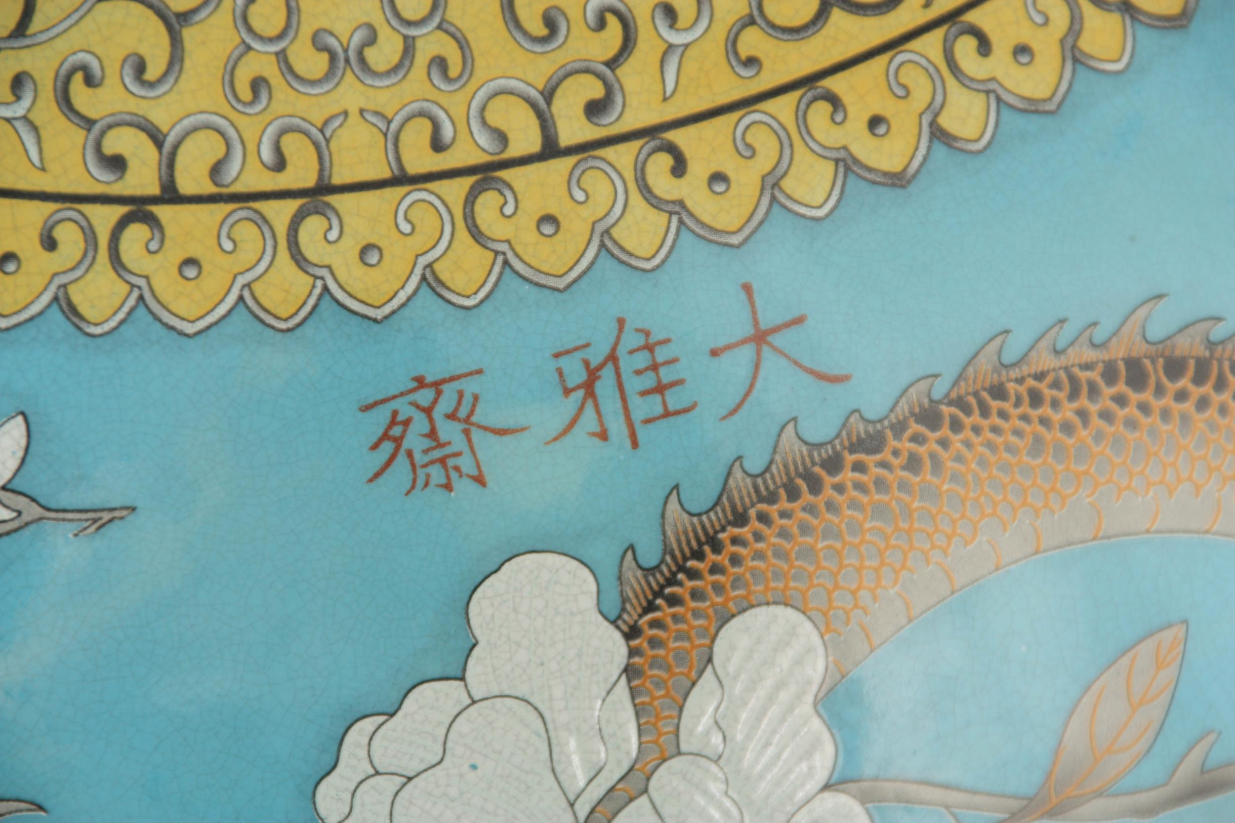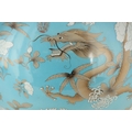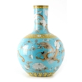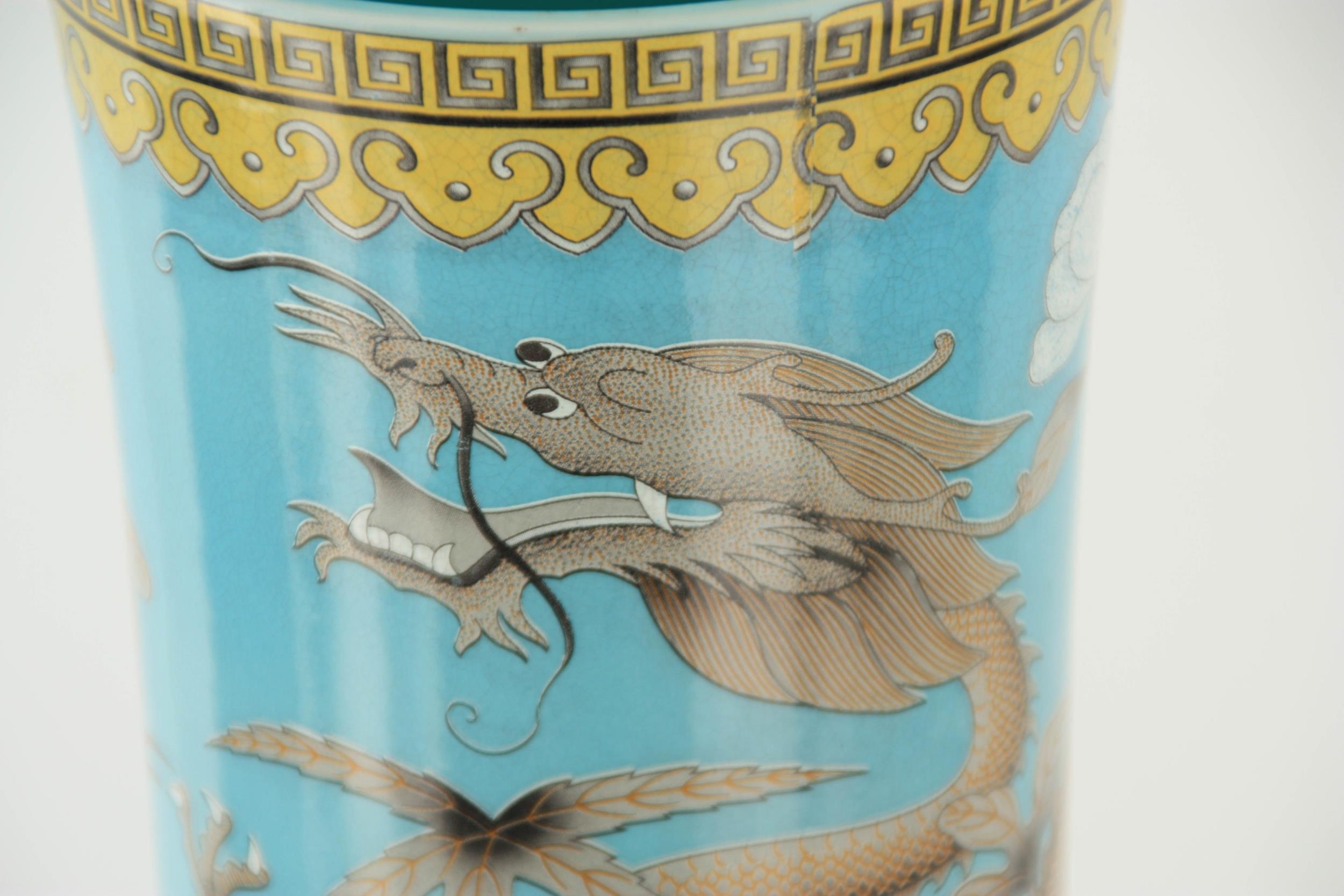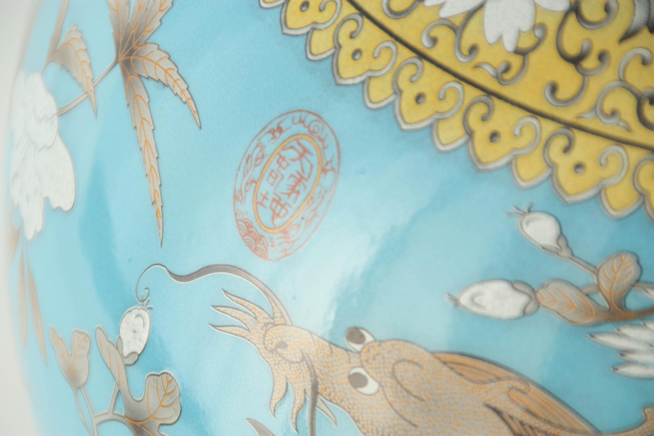 A MASSIVE 20TH CENTURY CHINESE BULBOUS VASE WITH SLENDER NECK pale blue ground with scrolled leaf decorated pale yellow collar, foot band and rim; the body and neck with enamelled white flowerhead and leaf decoration within cavorting dragons. (53cm high)