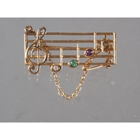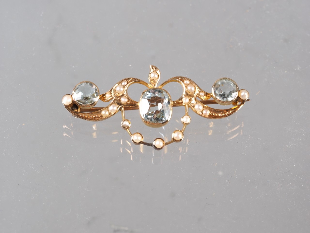 An Edwardian 15ct gold brooch set three topaz and seed pearls, 5.2g
