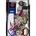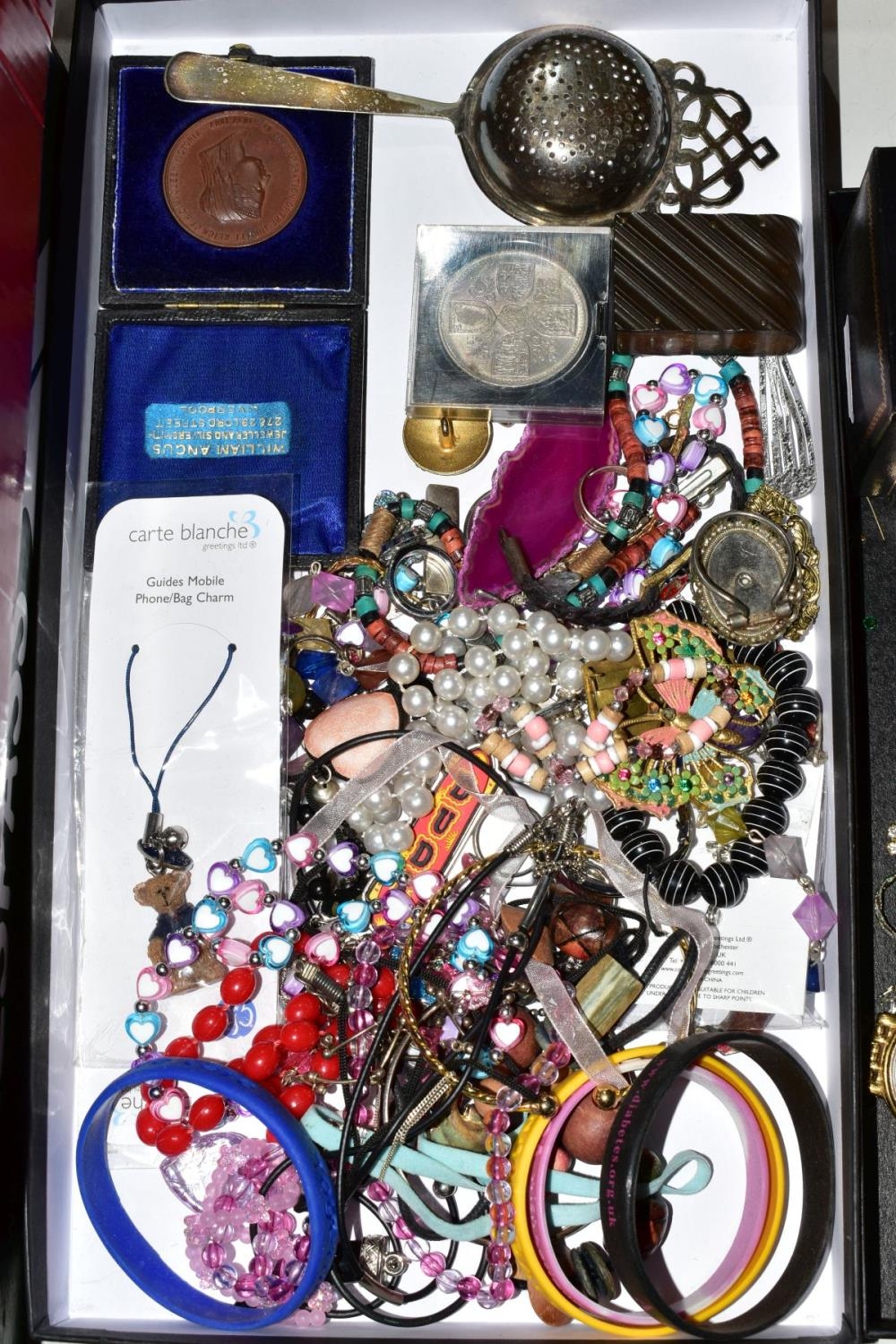 A SELECTION OF COSTUME JEWELLERY, to include mainly modern costume jewellery, bracelets, rings, necklaces, two commemorative coins, a tea strainer spoon etc