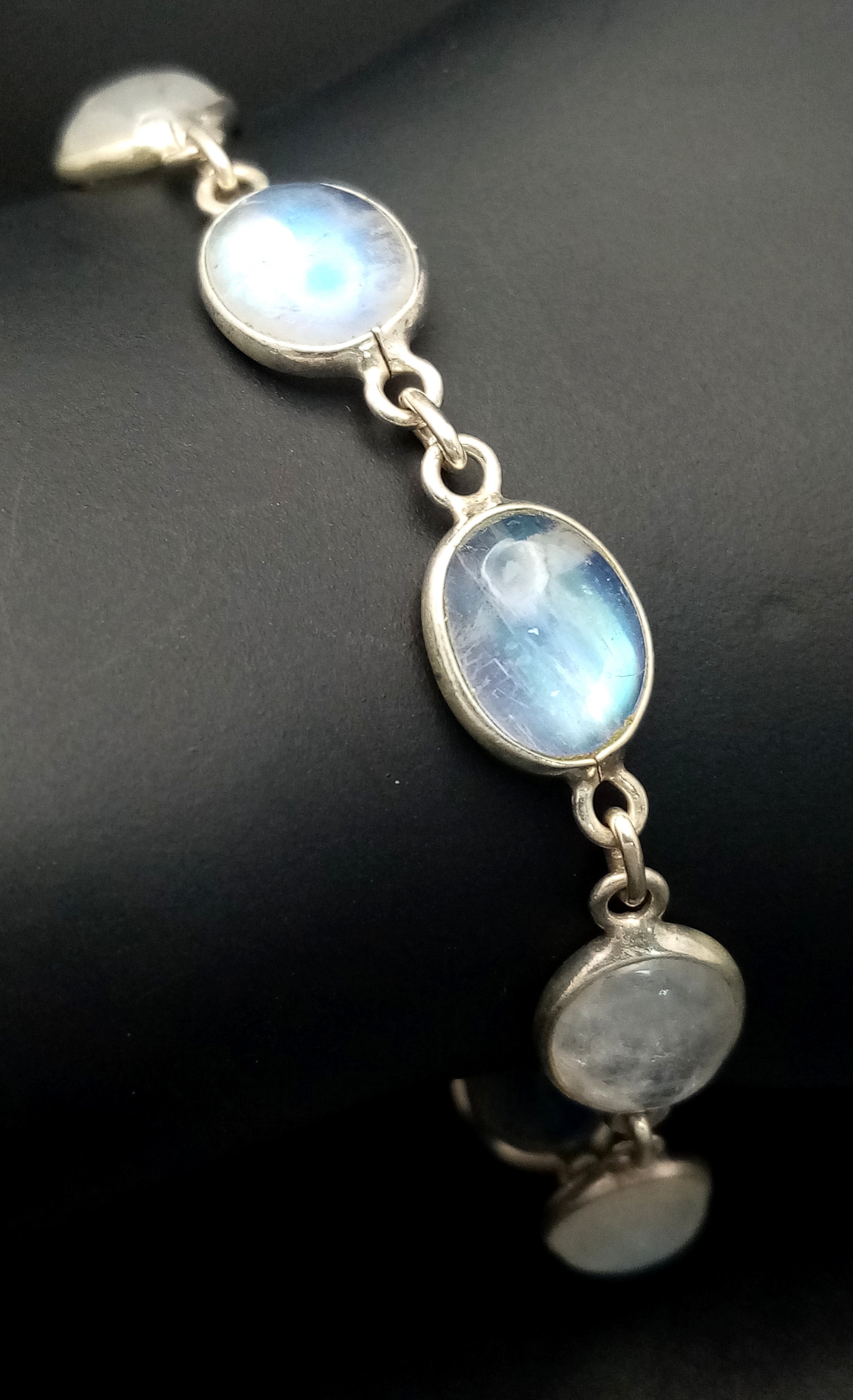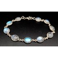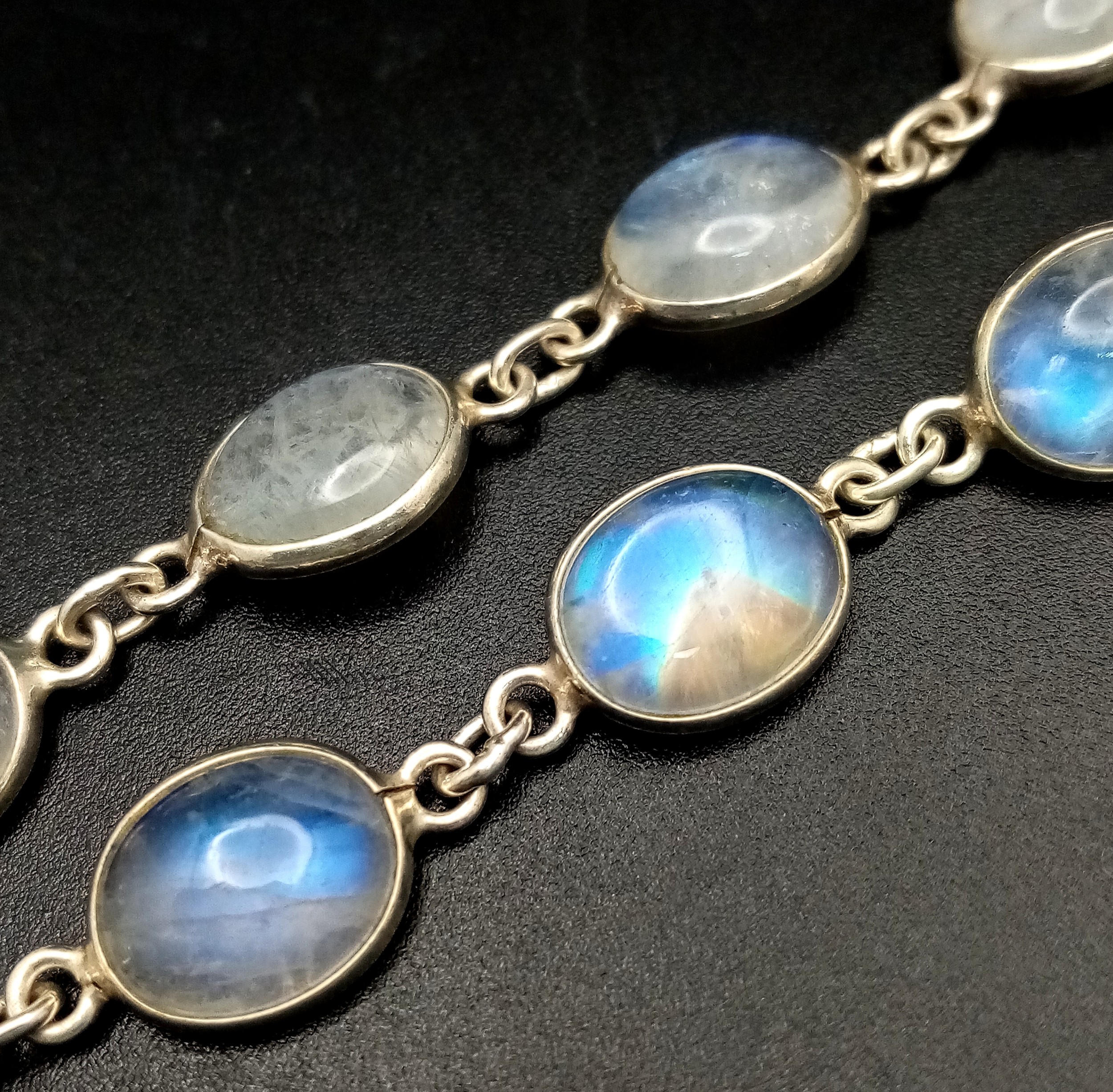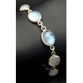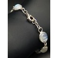 A Very Attractive Sterling Silver and Moonstone Set Tennis Bracelet- 20.5cm Length. Set with Ten 1cm Long Oval Moonstone Cabochons. Gross Weight 8.4 Grams.