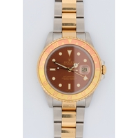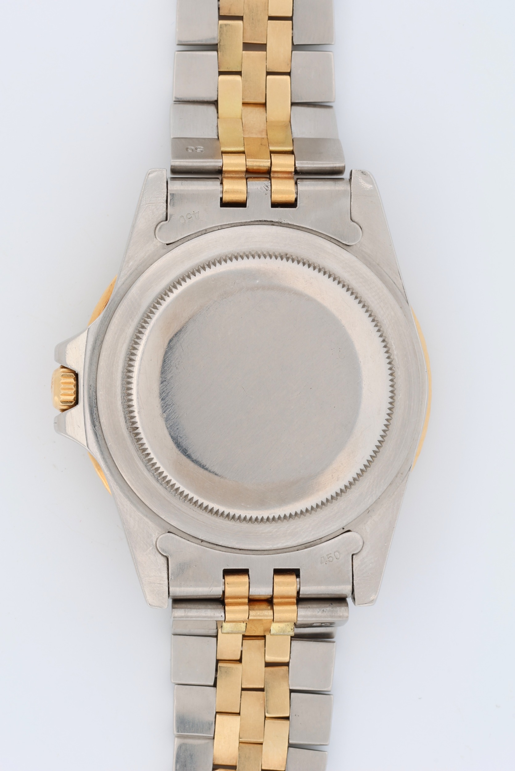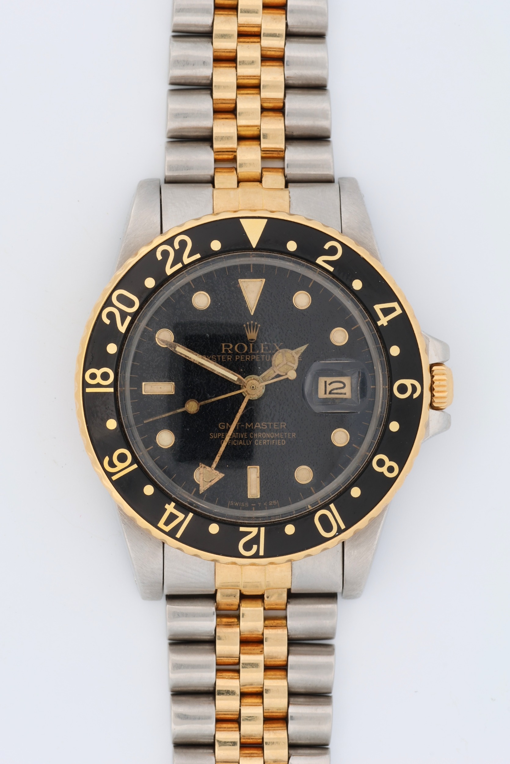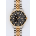 Rolex Oyster Perpetual Date GMT-Master, steel and gold, ref. 16753, 8,2xx,xxx serial (1984). The black gilt dial with luminous hour indices, date aperture, gilt hands. Rolex automatic cal.3075 movement, signed 62523H bracelet, H6 clasp code, 40mm case. Working when catalogued