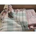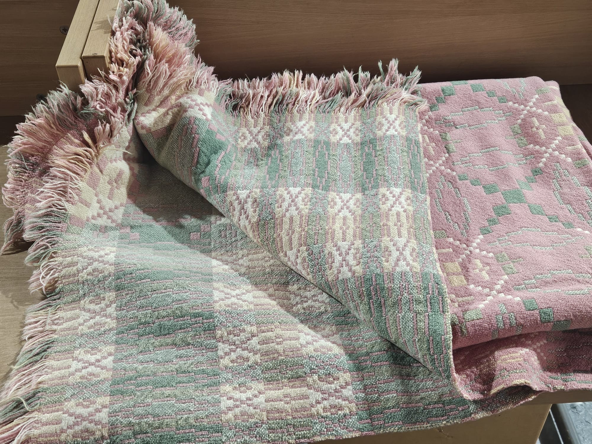 A double sided Welsh blanket - pink, green and yellow - double - good condition