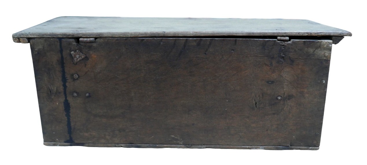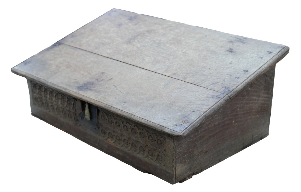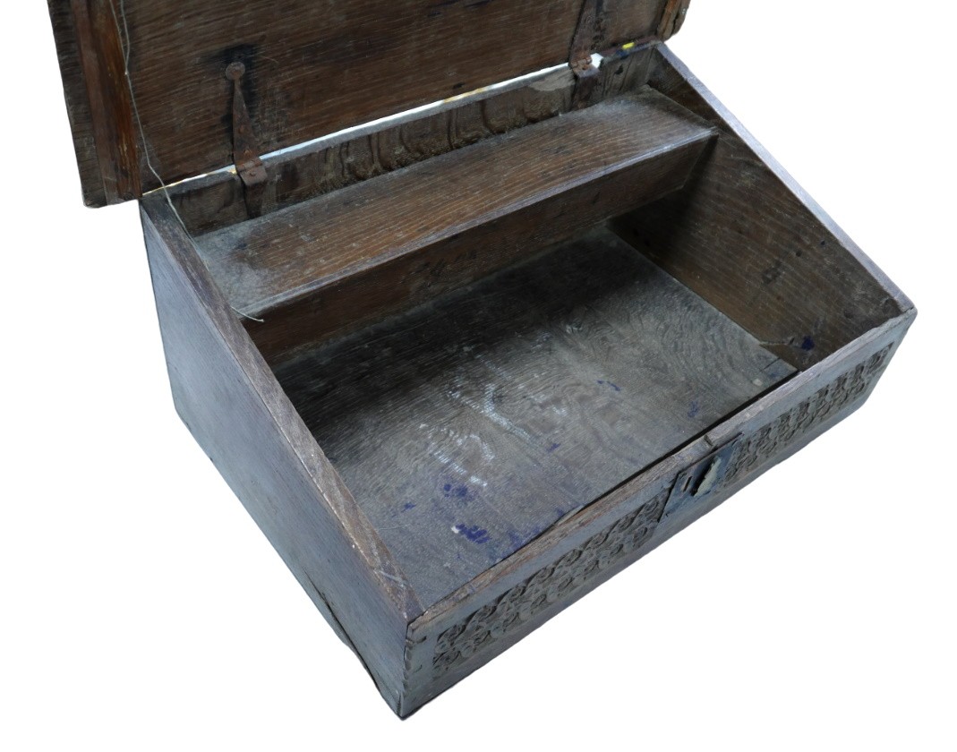 A 19th century oak Bible box, with a blind carved frieze panel to its front, 65 by 39 by 26cm high.