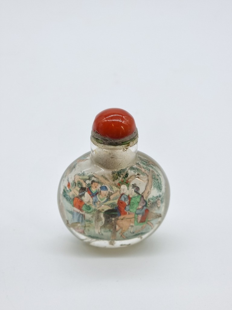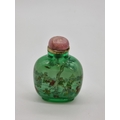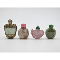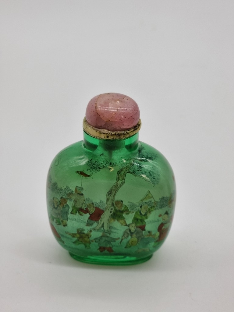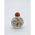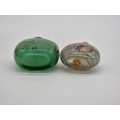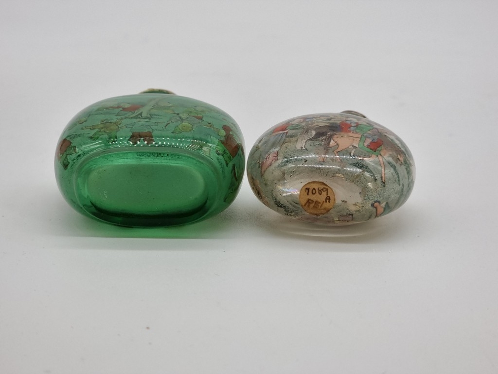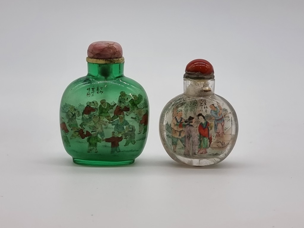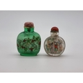 Two Chinese internally painted glass snuff bottles and hardstone stoppers, probably 19th century, each inscribed, total height of largest 8.3cm, (flaws to smallest, both stoppers glued in place). (2)