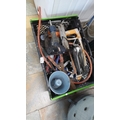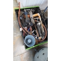 A mixed crate of industrial hand and power tools, including an electric drill, hacksaw, metal guide rail, clamps, and various hoses and fittings, in a plastic storage crate.