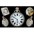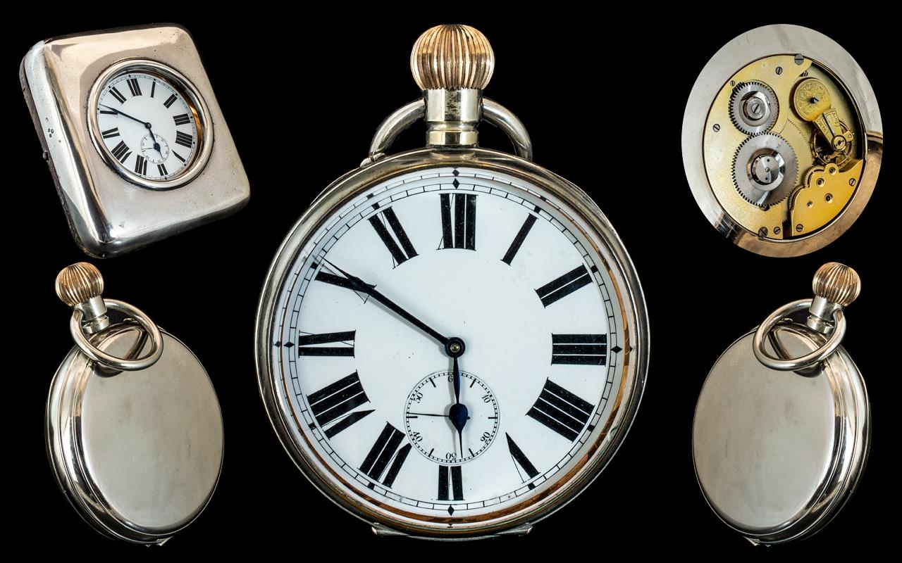 Late Victorian Period 1837 - 1901 Huge Silver Plated Keyless Desk Clock with Sterling Silver Display Stand with Leather Back. Hallmark London 1899, Maker William Comyns. Clock Size 6 Inches High & 4 Inches Wide, With Display Stand Size 6.5 x 4.5 Inches - 16.25 x 11.25 cms. Clock / Watch Excellent Condition, Includes Case / Dial / Movement - Please Confirm with Photo, Working at time of Cataloging.