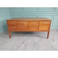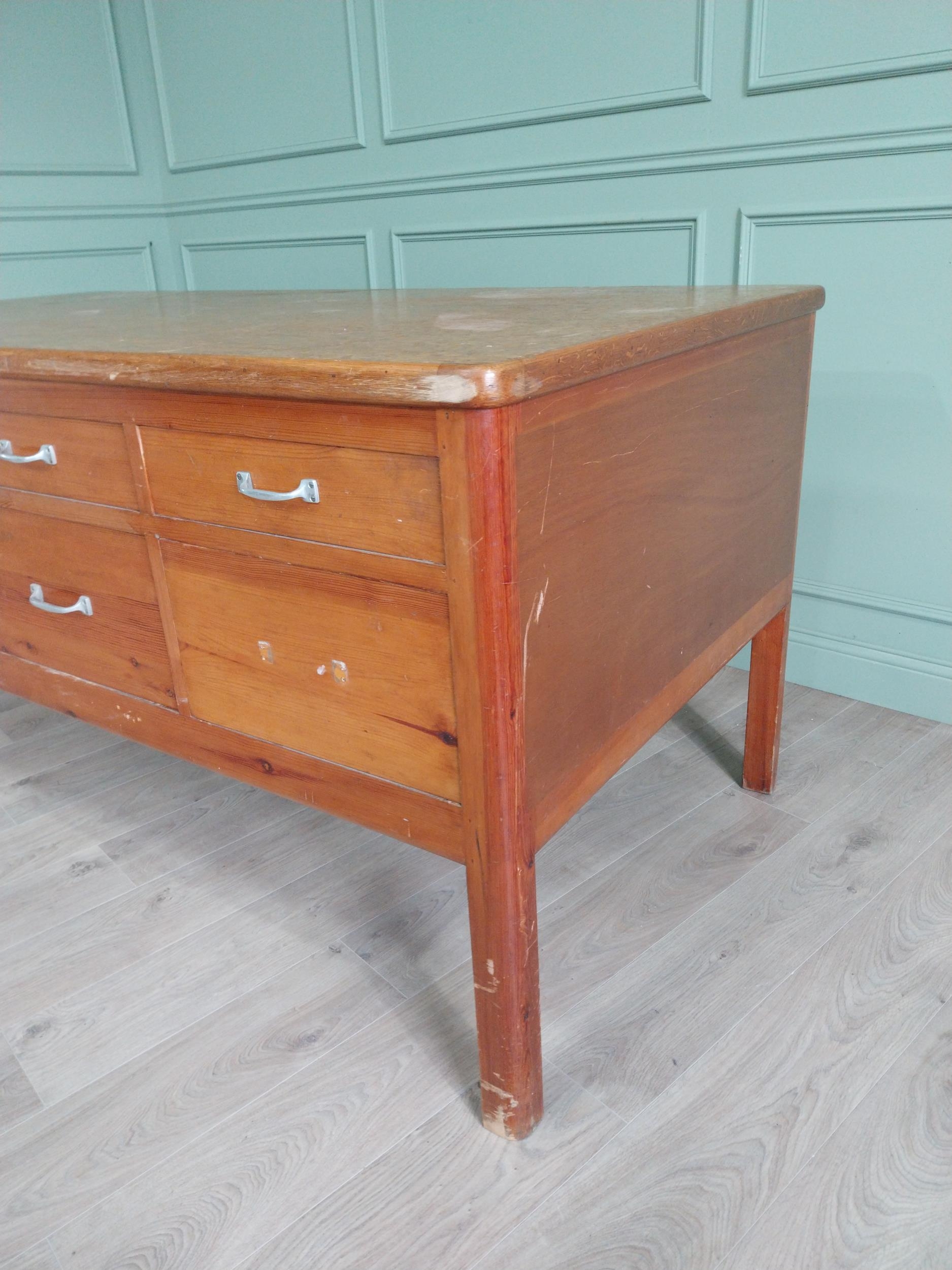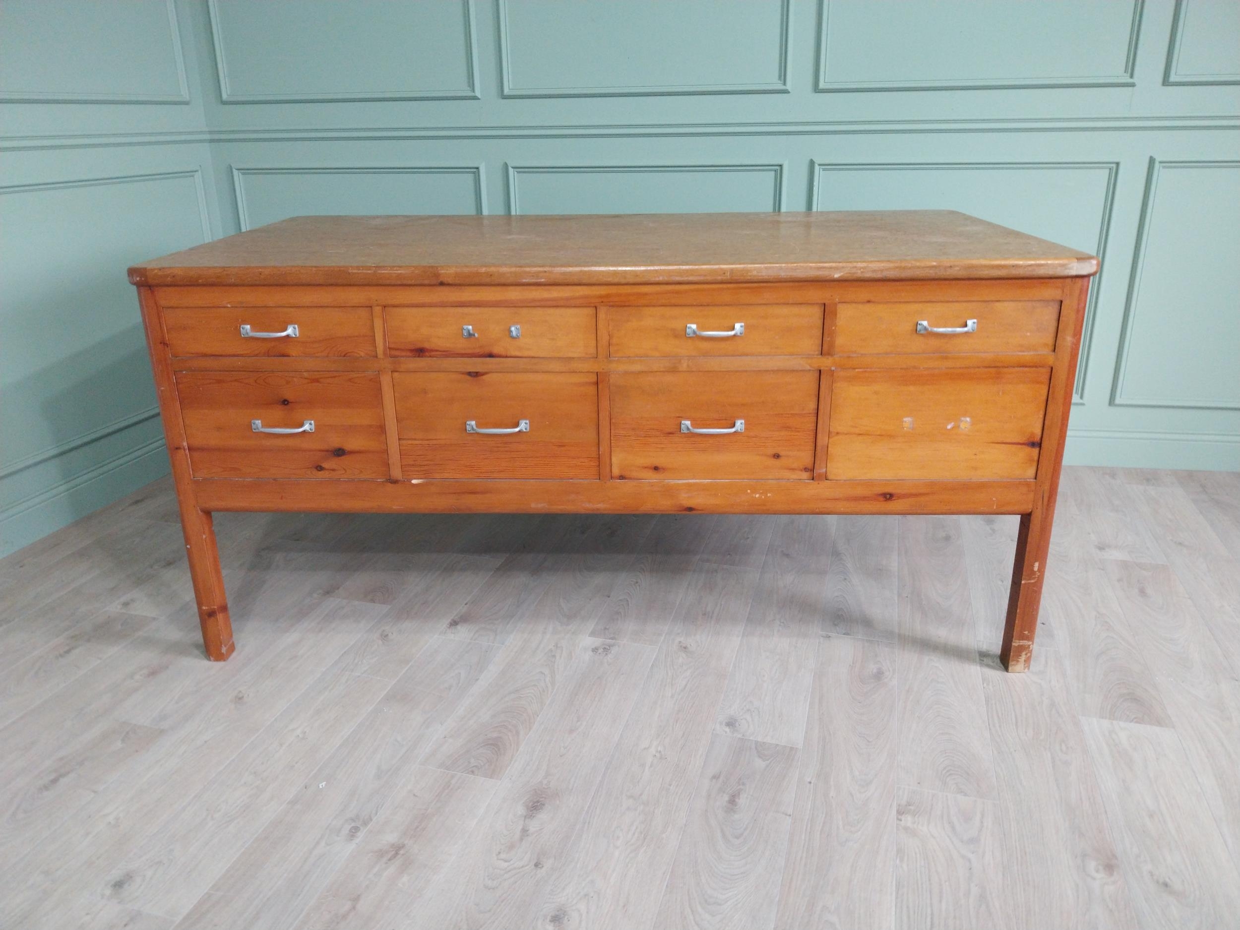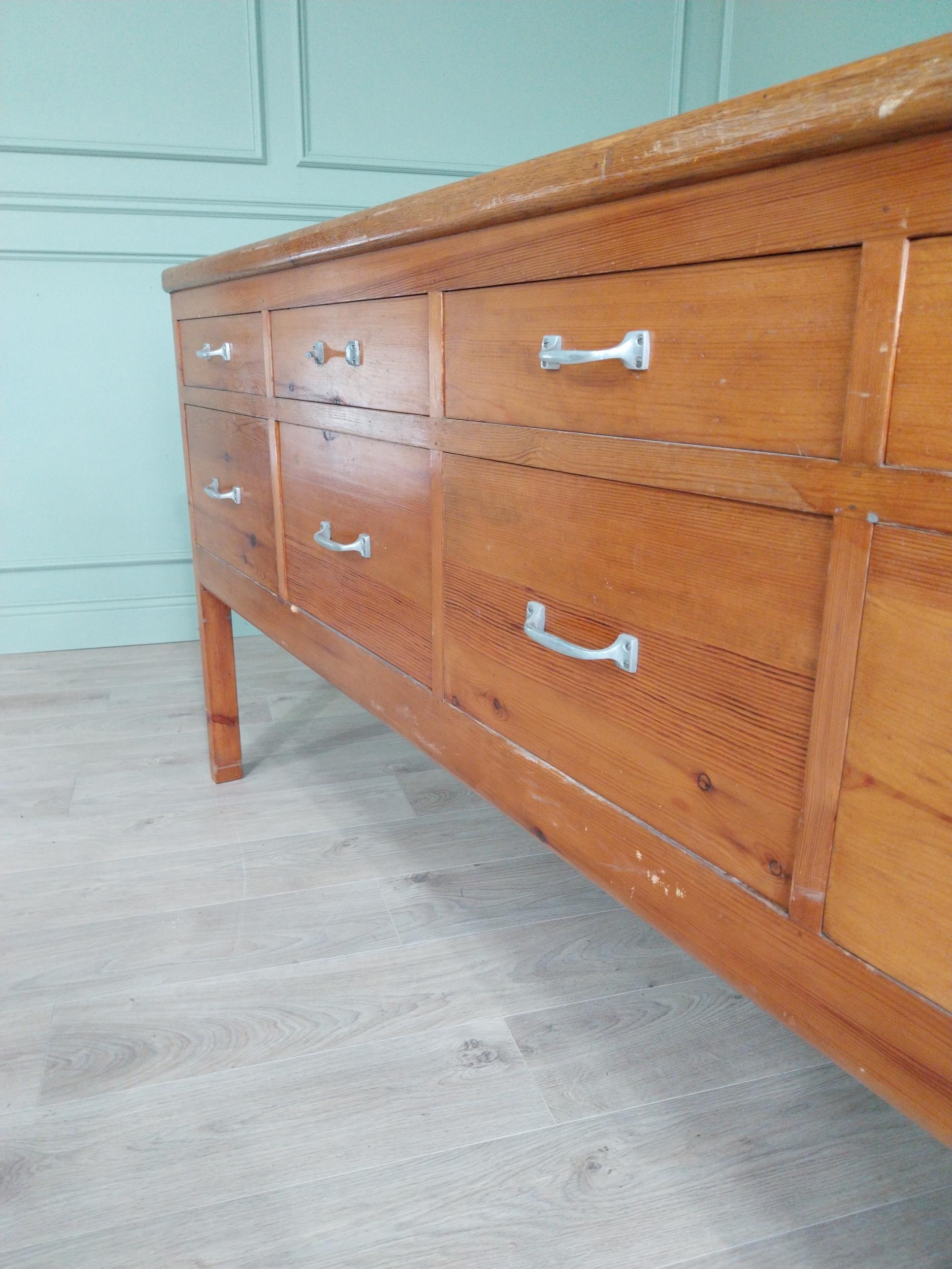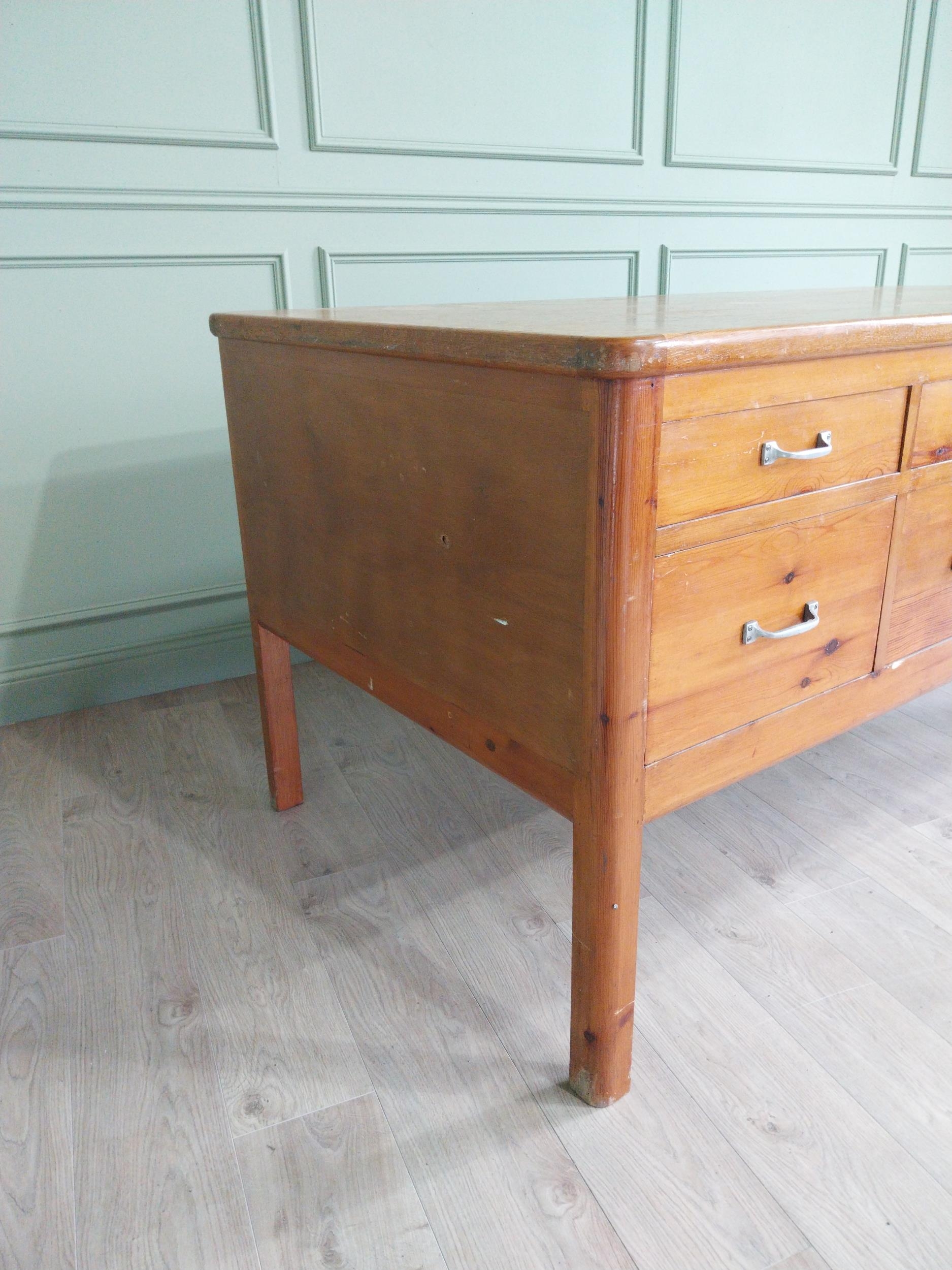 1950s pine kitchen island with eight bank of drawers raised on square legs {96 cm H x 202 cm W x 103 cm D}.