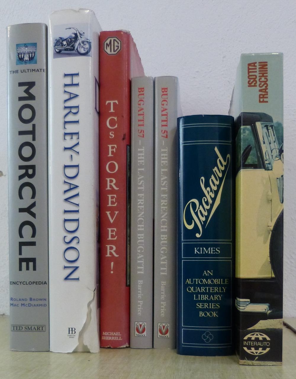 Motoring books; MG TC's Forever, Bugatti 57 x 2, Isotta Fraschini, Packard, Harley Davidson and the Ultimate Motorcycle Encyclopedia (7).