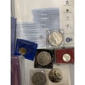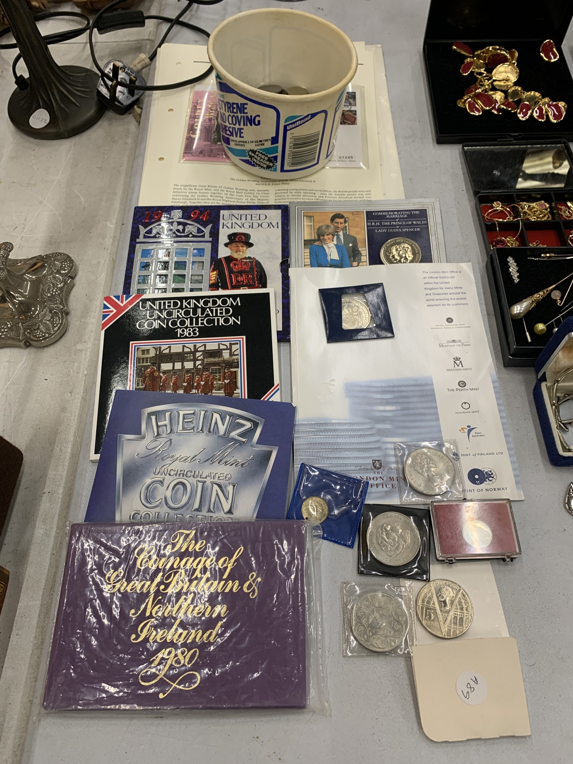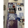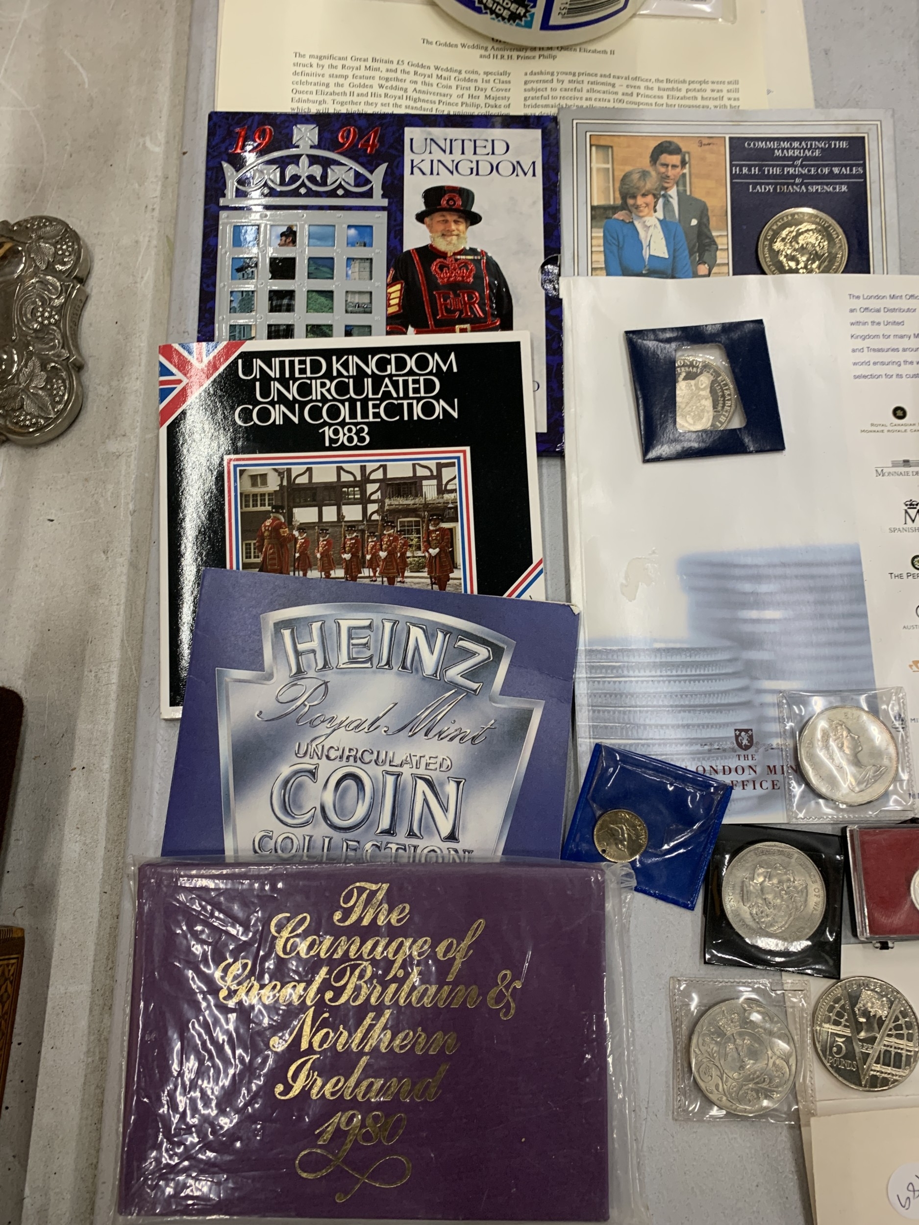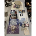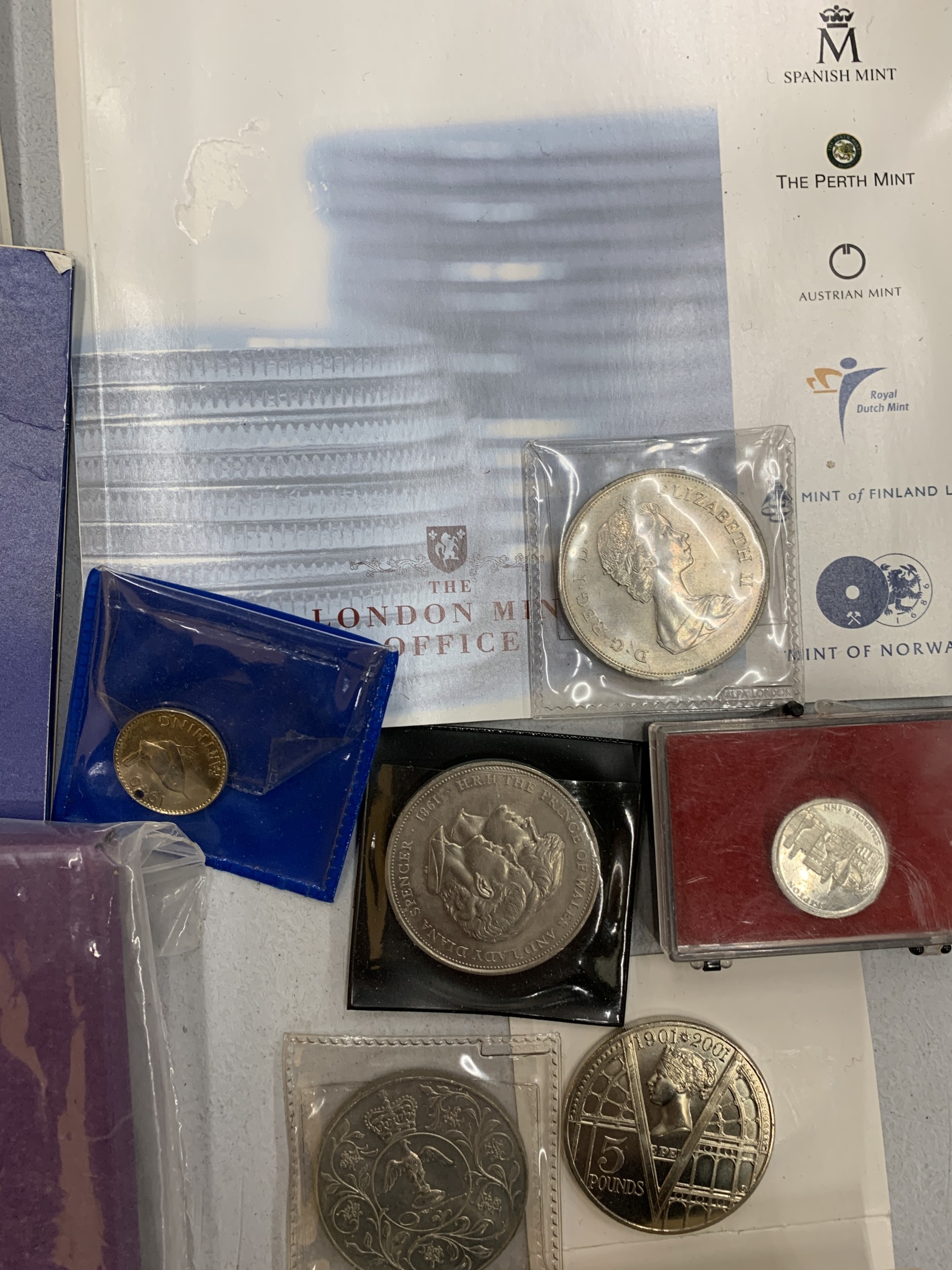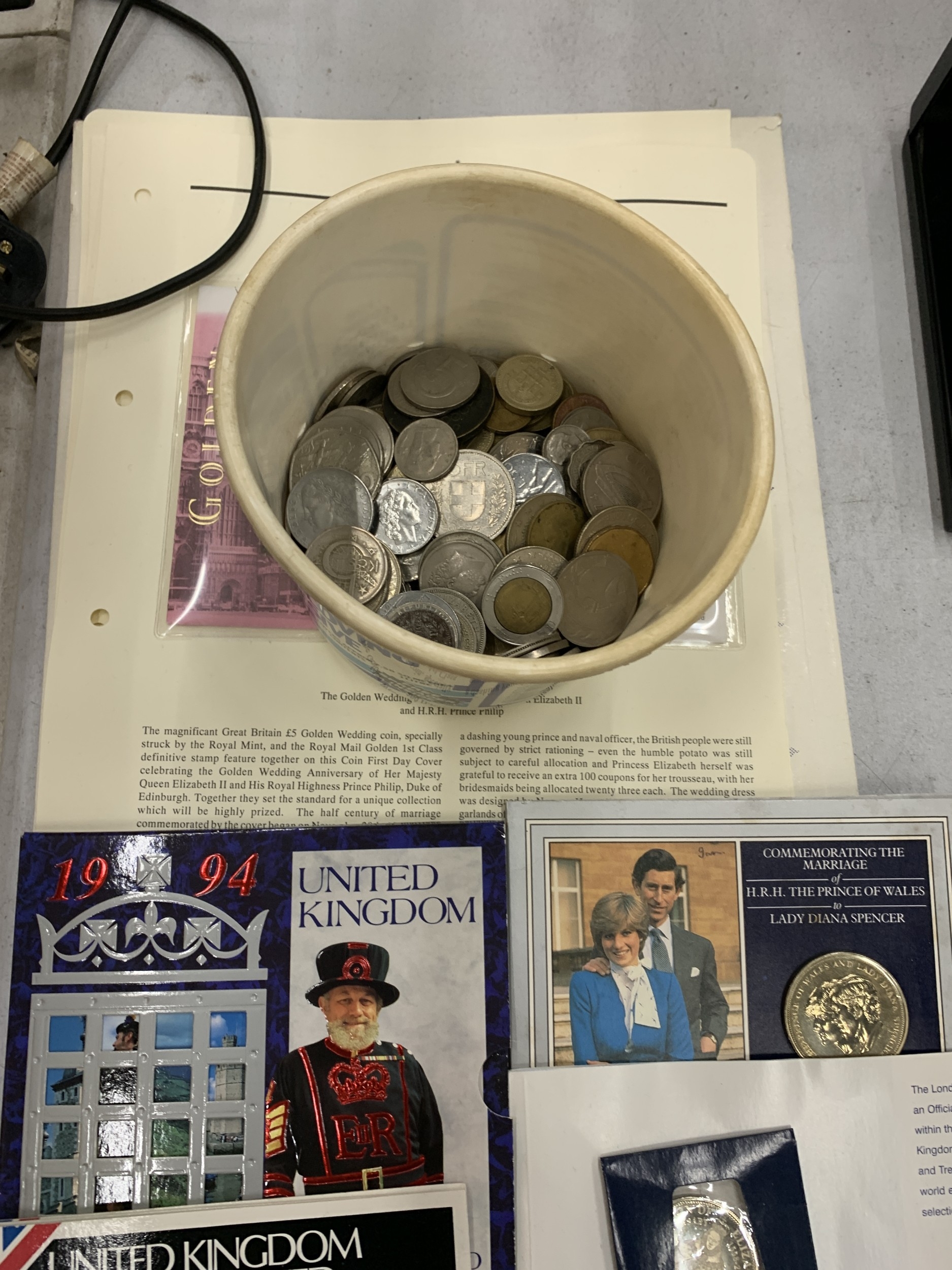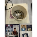 A COLLECTION OF COINAGE TO INCLUDE A UNITED KINGDOM 2001 £5 COMMEMORATIVE COIN, CONTAINER CONTAINING WORLD COINS, COMMEMORATIVE COINS, ETC.,