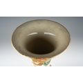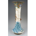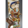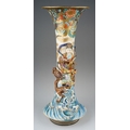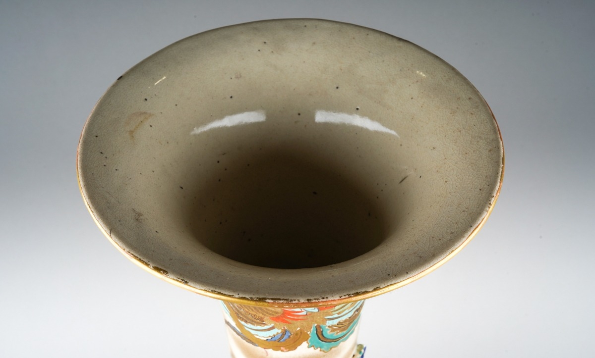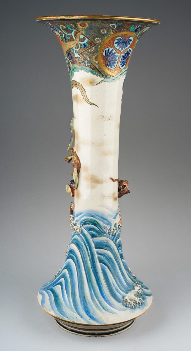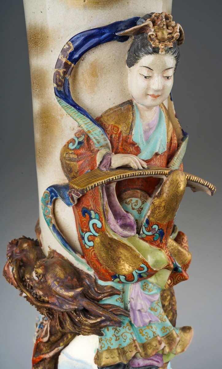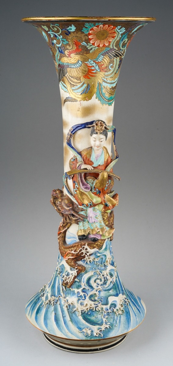 A large Japanese late Meiji period (1868-1912) Satsuma pottery vase of slender baluster form, probably by Ryokuzan, with a flared rim above a neck enamelled and gilded with birds, fruit and flowers, the body decorated in high relief with a Bijin musician standing on the back of a dragon amongst foamy waves, marked to base, professsional restoration in places, height 56cm approx.